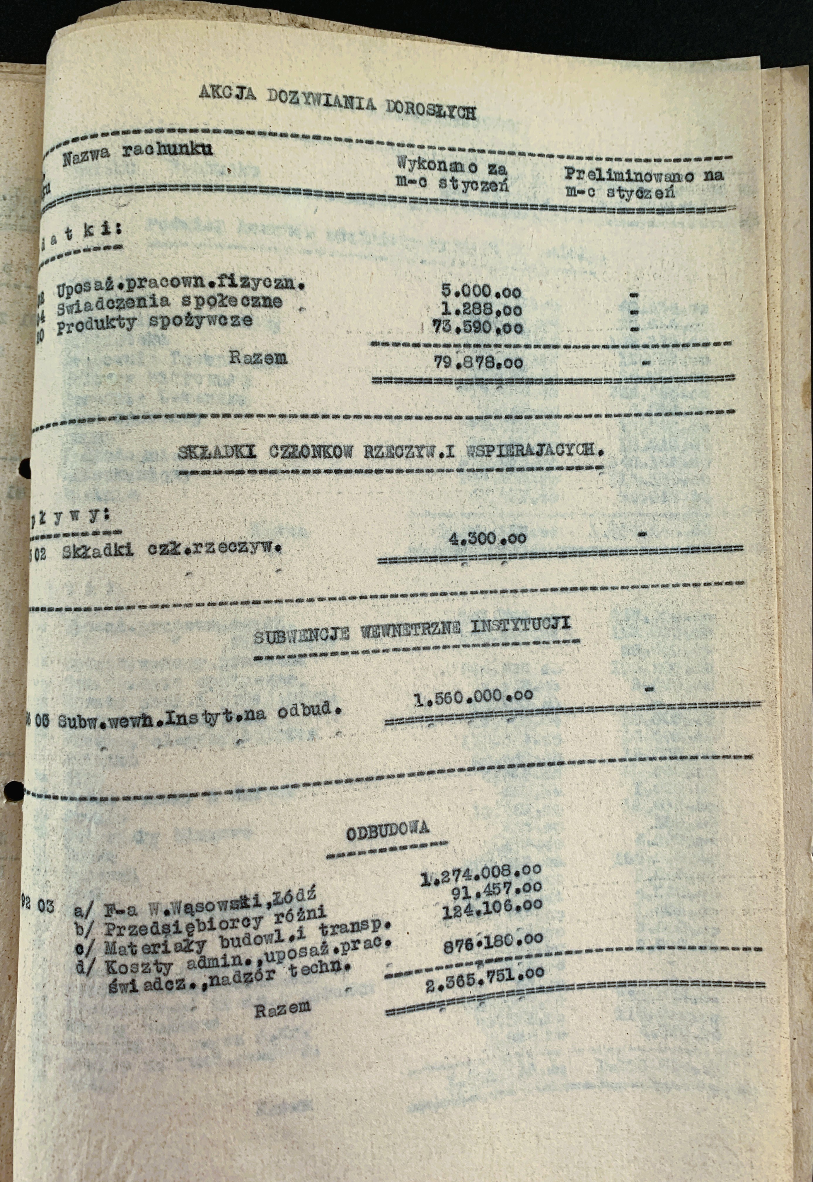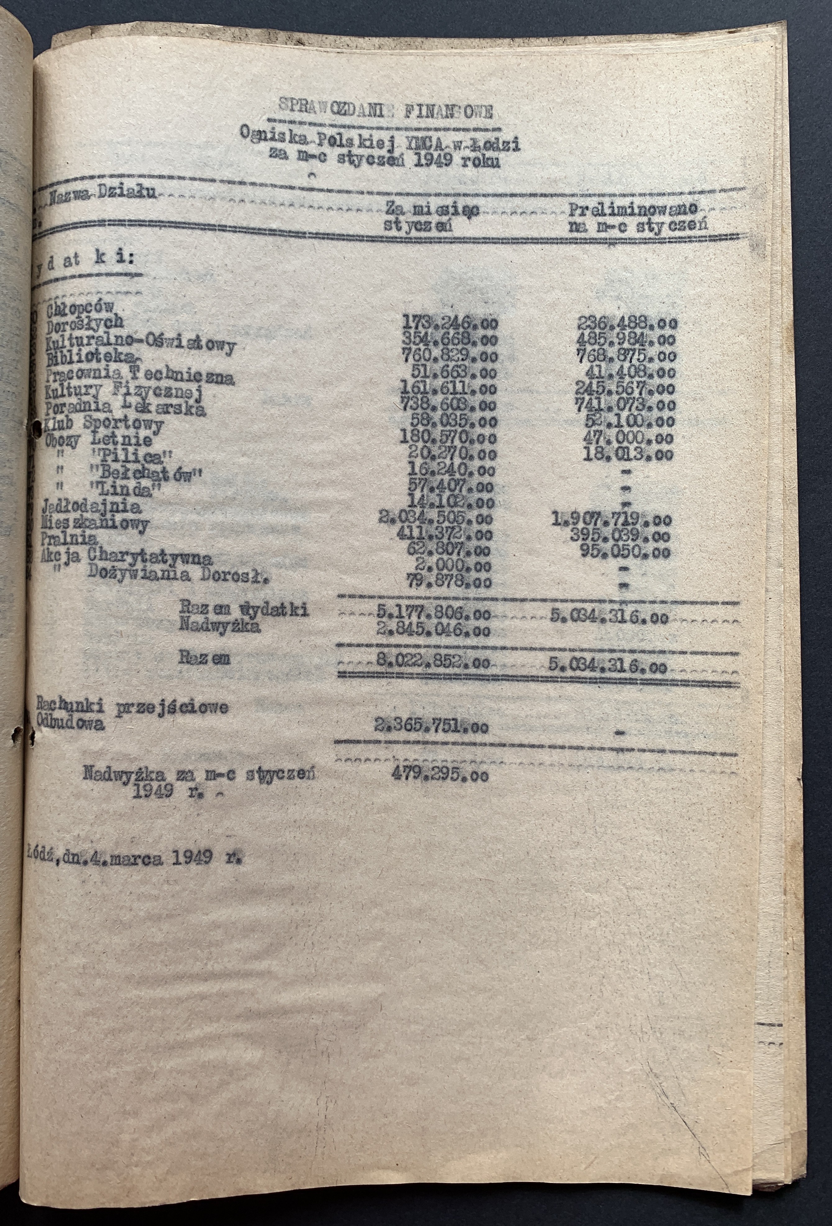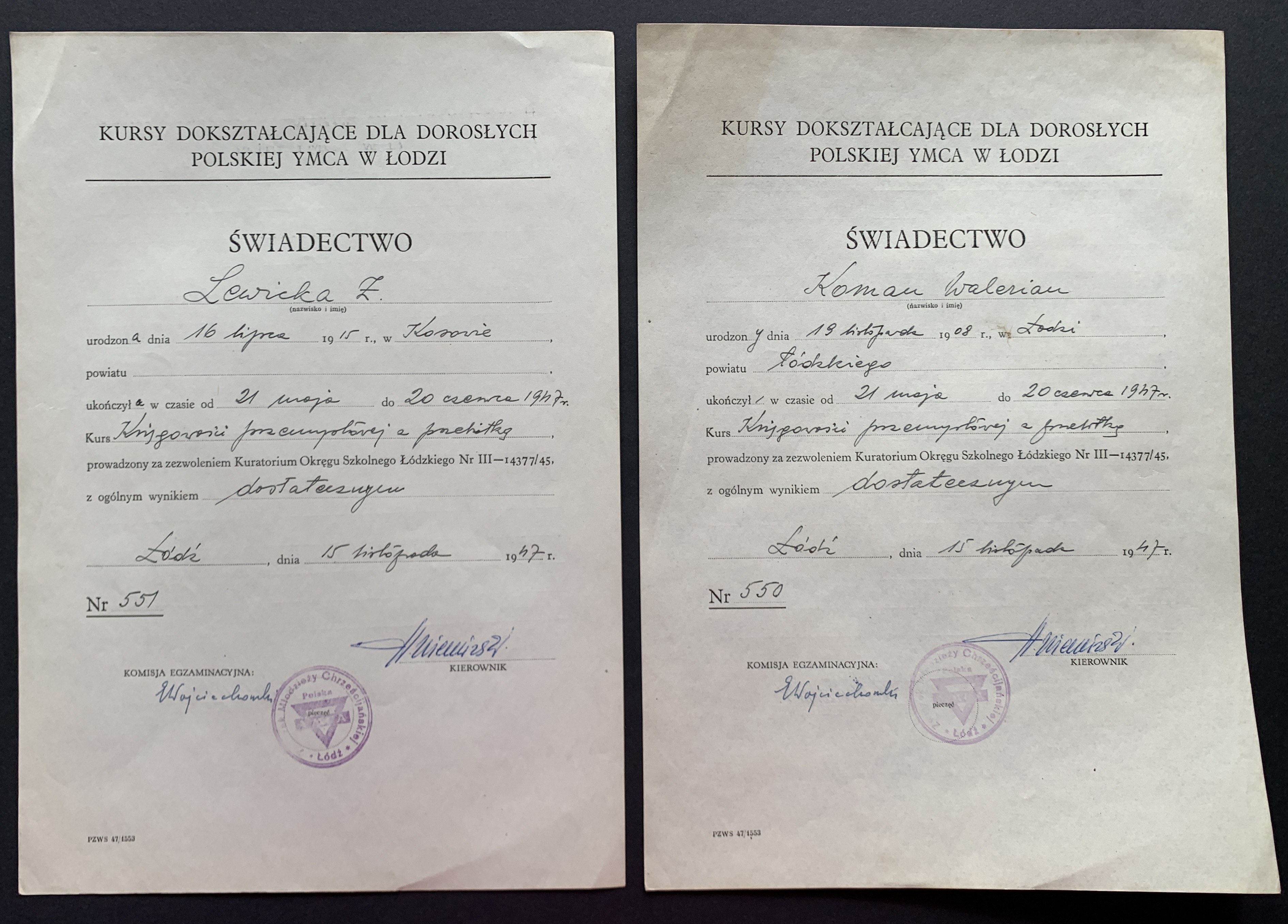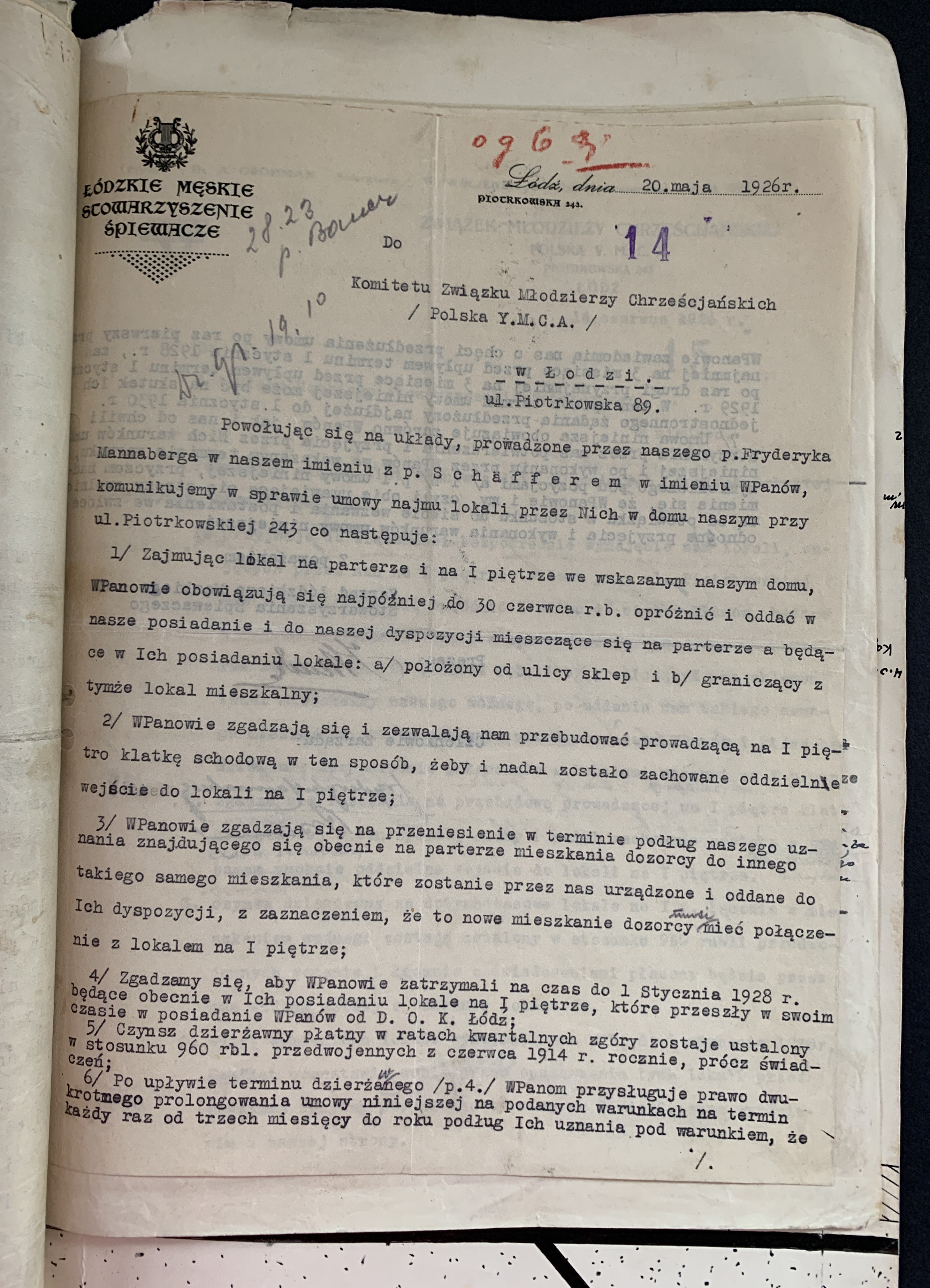 Zestaw 40 dokumentów dotyczących działalności Polskiego Oddziału Y.M.C.A. w Łodzi: korespondencja handlowa, umowa najmu Łódzkiego Stowarzyszenia Śpiewaczego „Mannergesangferein", Bilans finansowy Ogniska Polskiego YMCA w Łodzi za miesiąc styczeń 1949, dwa Świadectwa Kursów Doszkalających dla Dorosłych z 1947 roku, Telegram z 1947 roku,