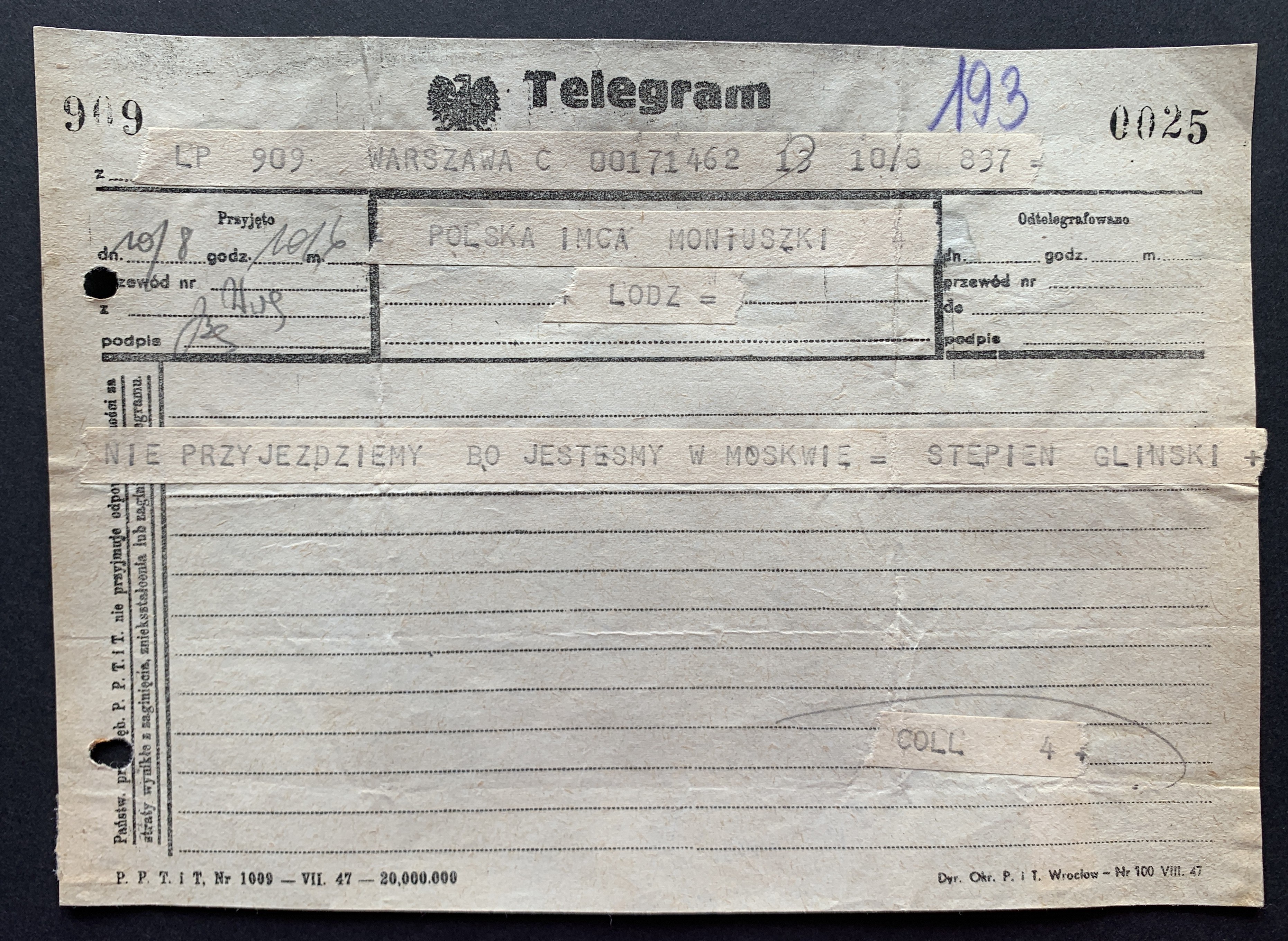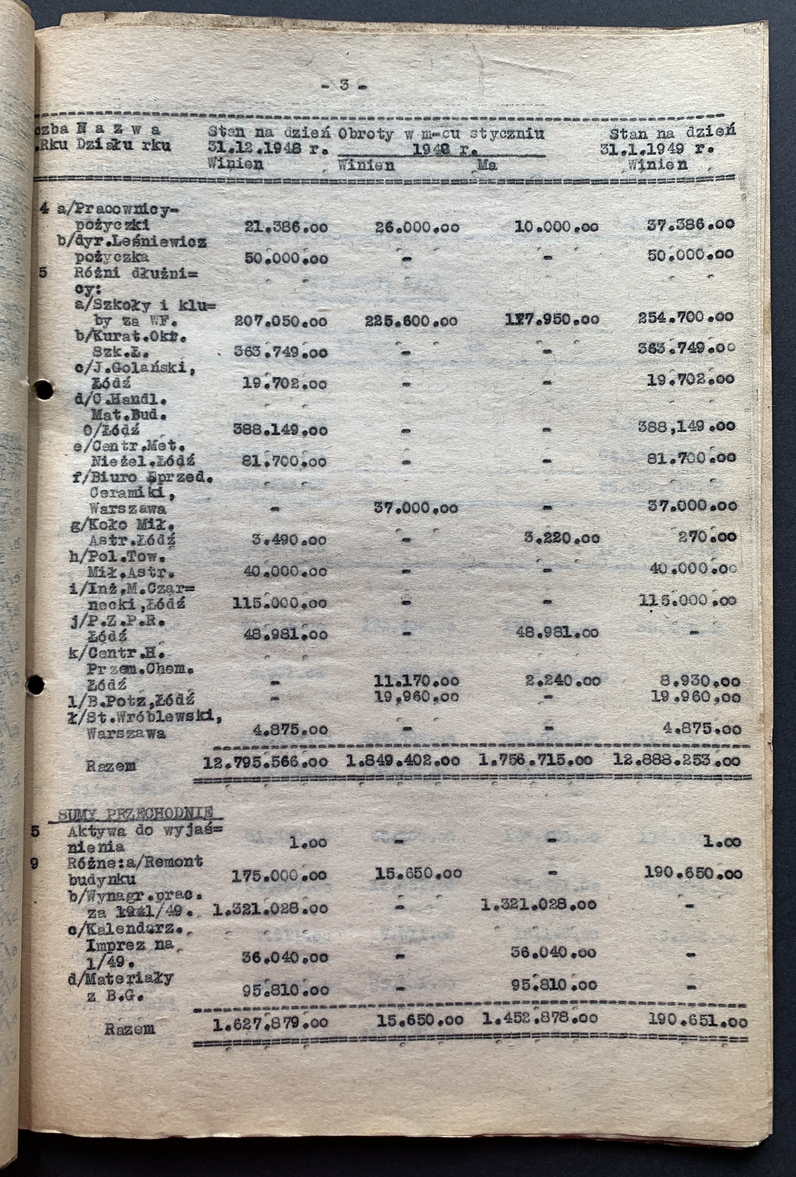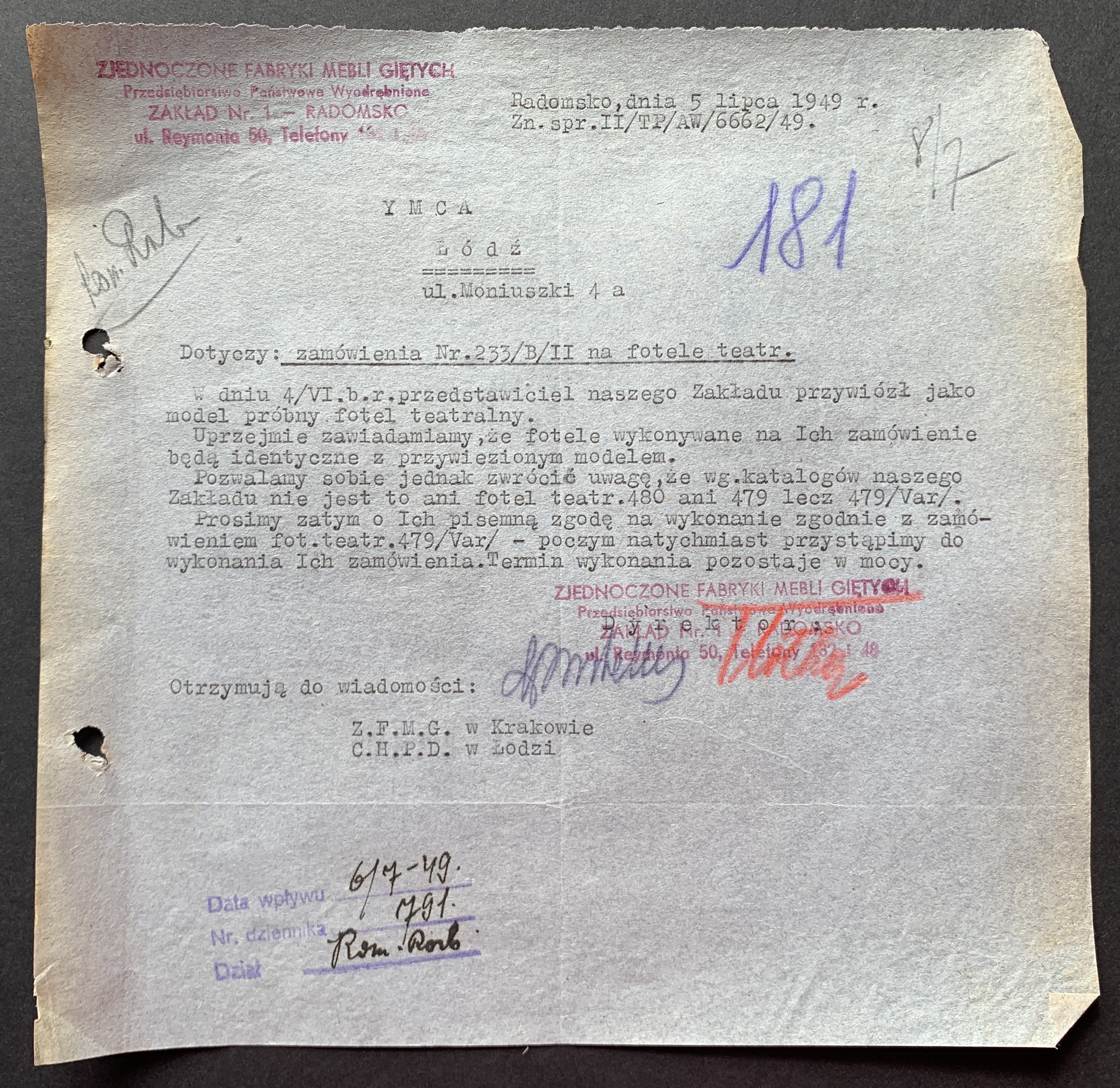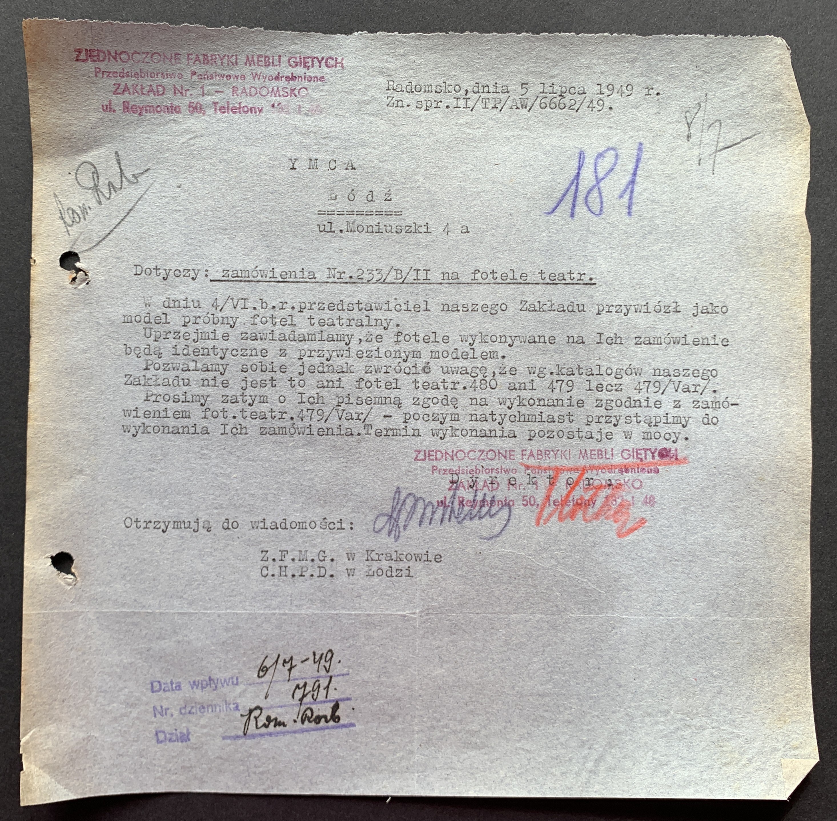 Zestaw 40 dokumentów dotyczących działalności Polskiego Oddziału Y.M.C.A. w Łodzi: korespondencja handlowa, umowa najmu Łódzkiego Stowarzyszenia Śpiewaczego „Mannergesangferein", Bilans finansowy Ogniska Polskiego YMCA w Łodzi za miesiąc styczeń 1949, dwa Świadectwa Kursów Doszkalających dla Dorosłych z 1947 roku, Telegram z 1947 roku,
