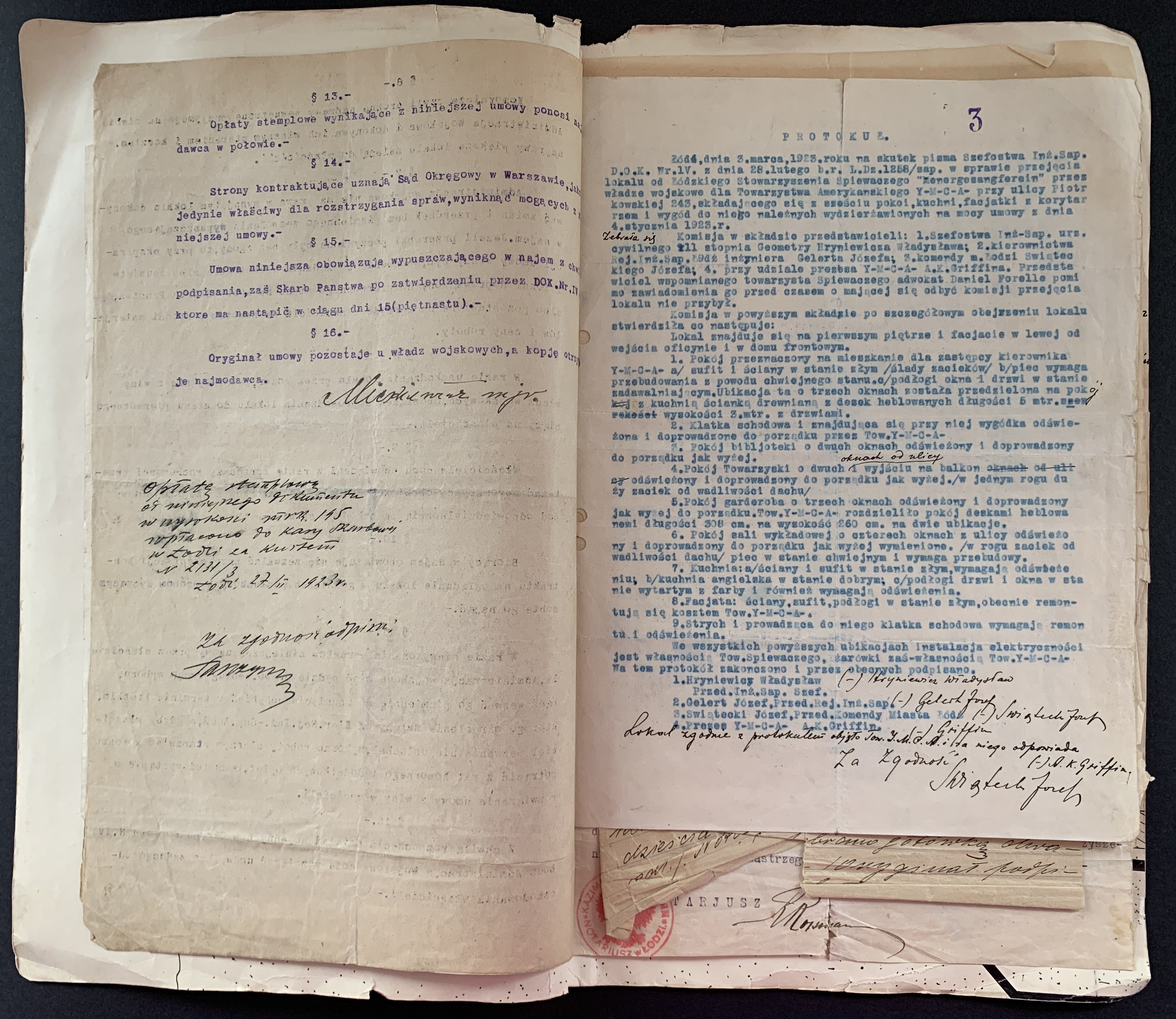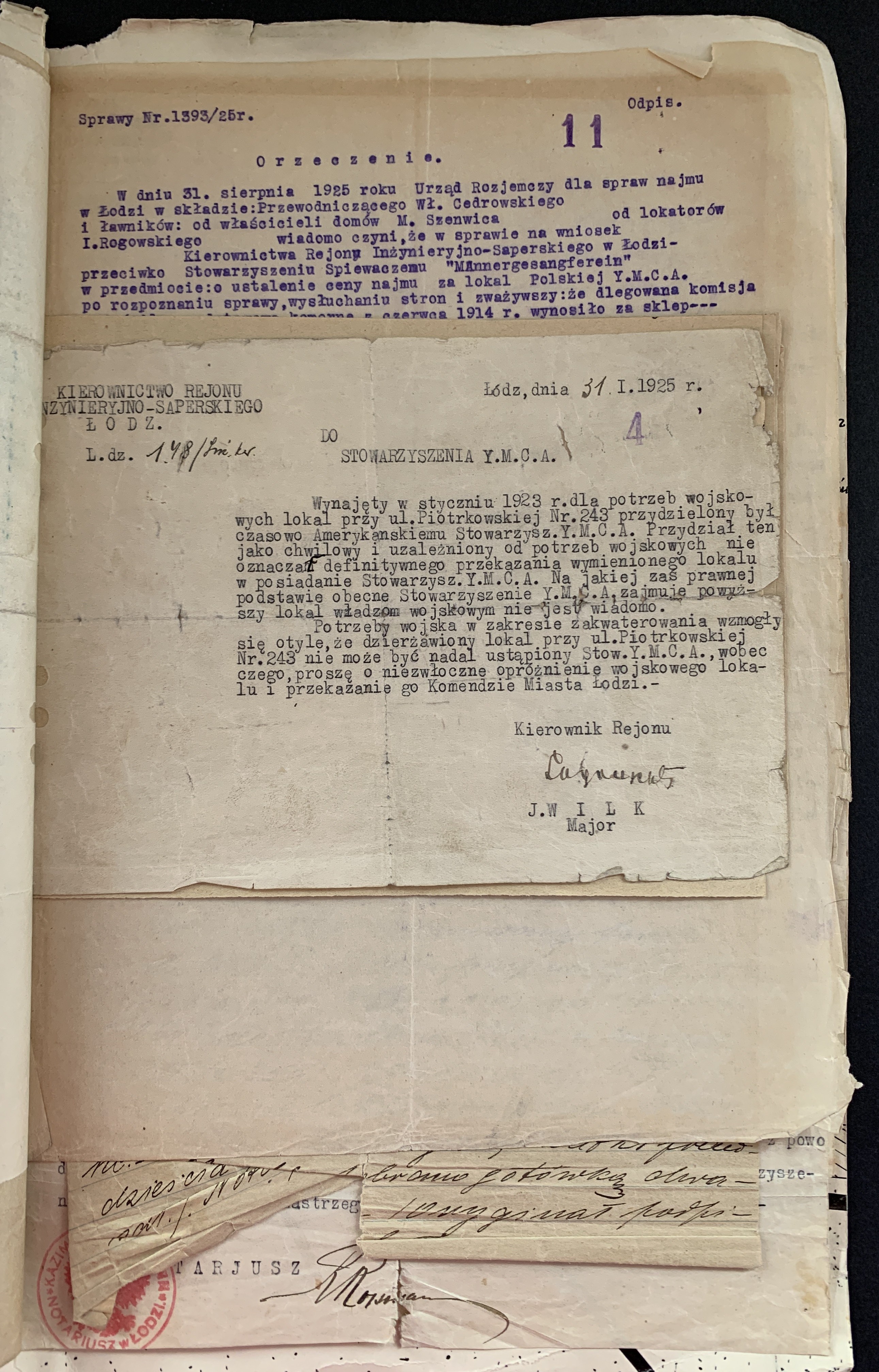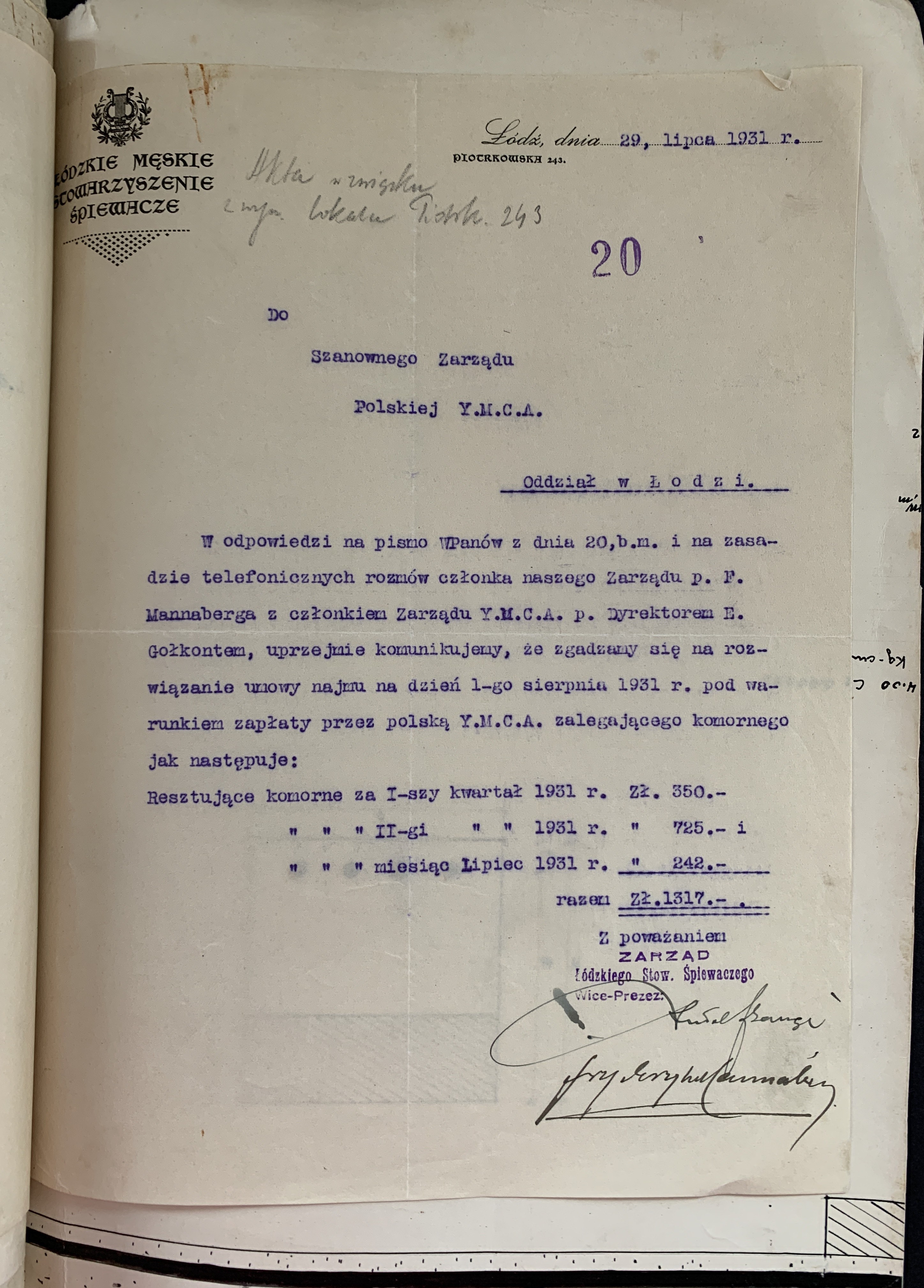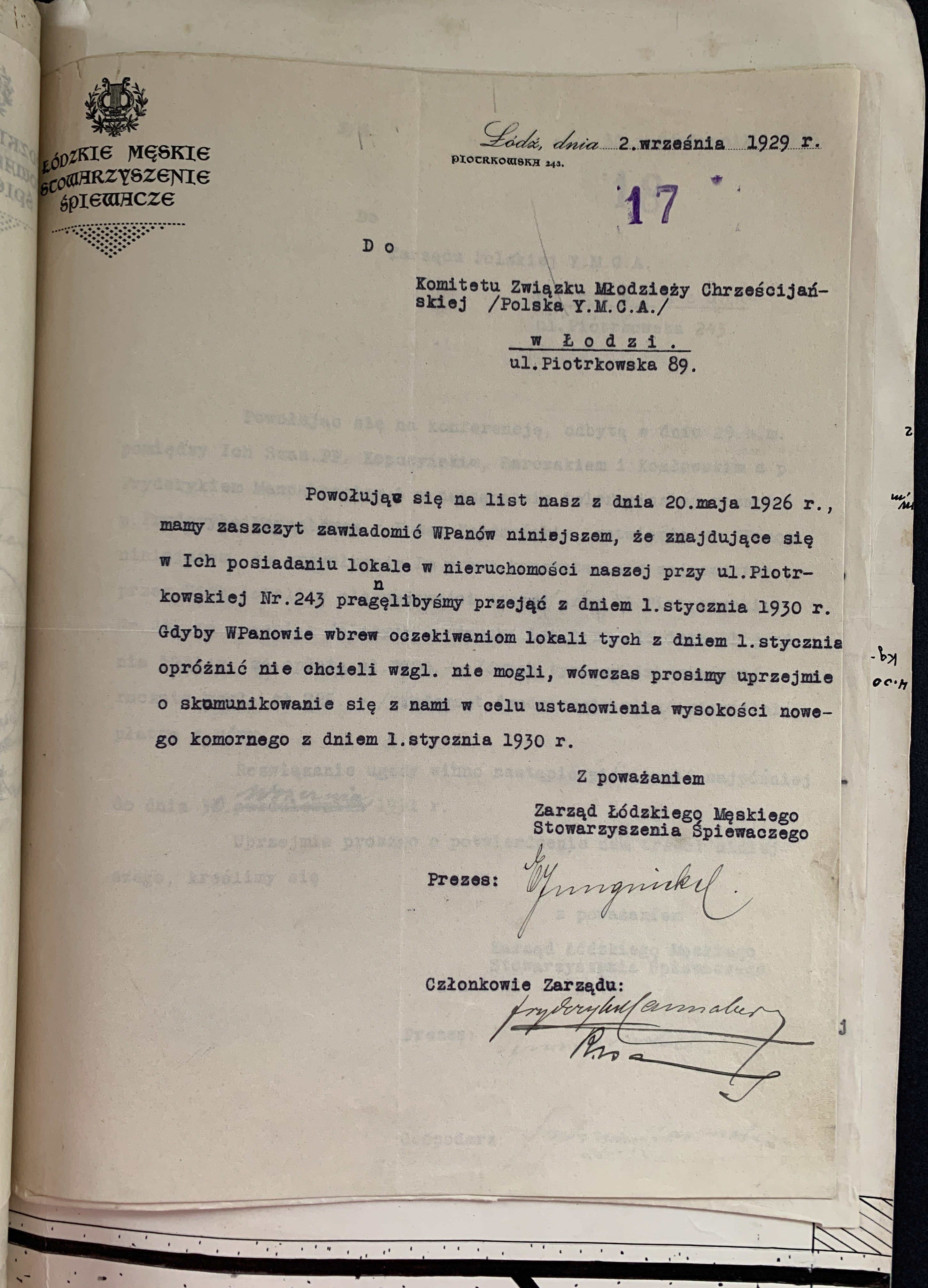 Złożone podpisy m.in.: Majora Janusz Rymwida-Mickiewicza, przedstawicieli Departamentu Fizycznego YMCA, Prezes Łódzkiego Stowarzyszenia Śpiewaczego „Mannergesangferein".