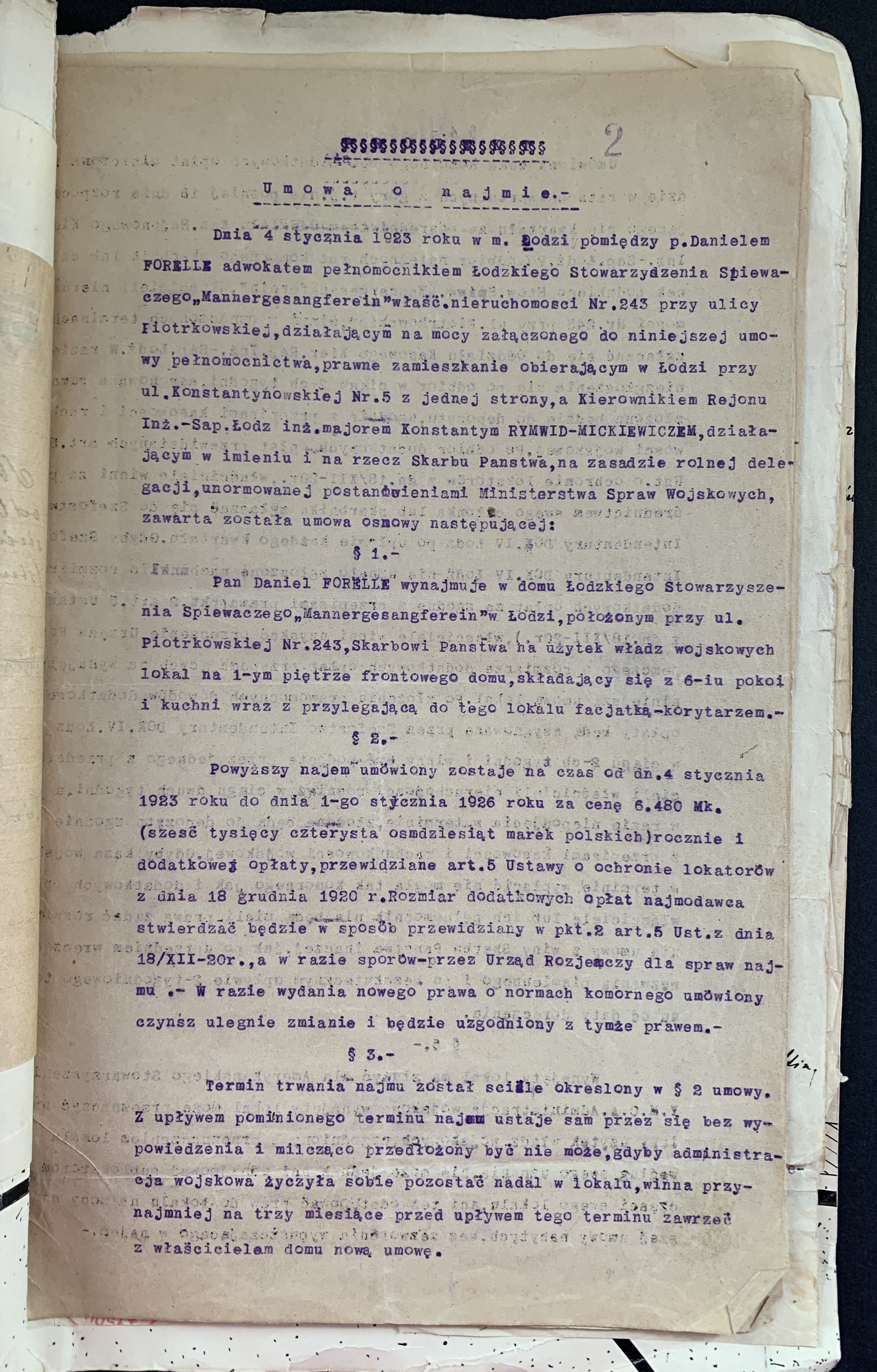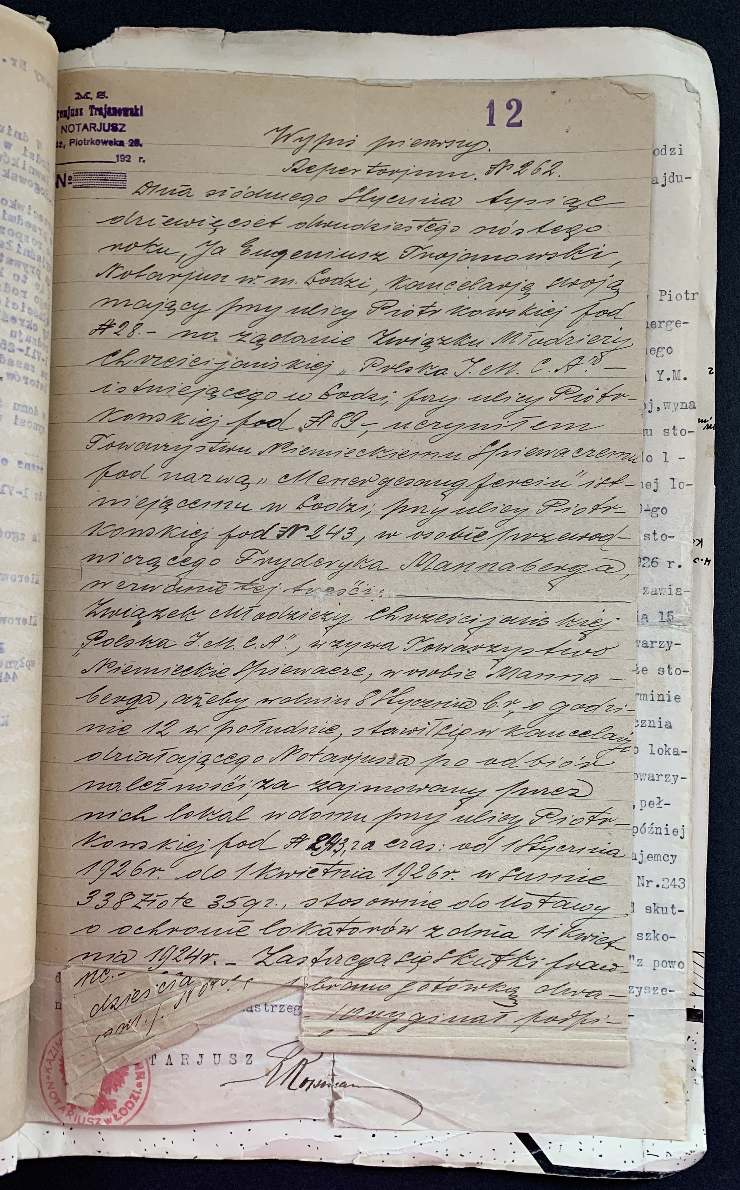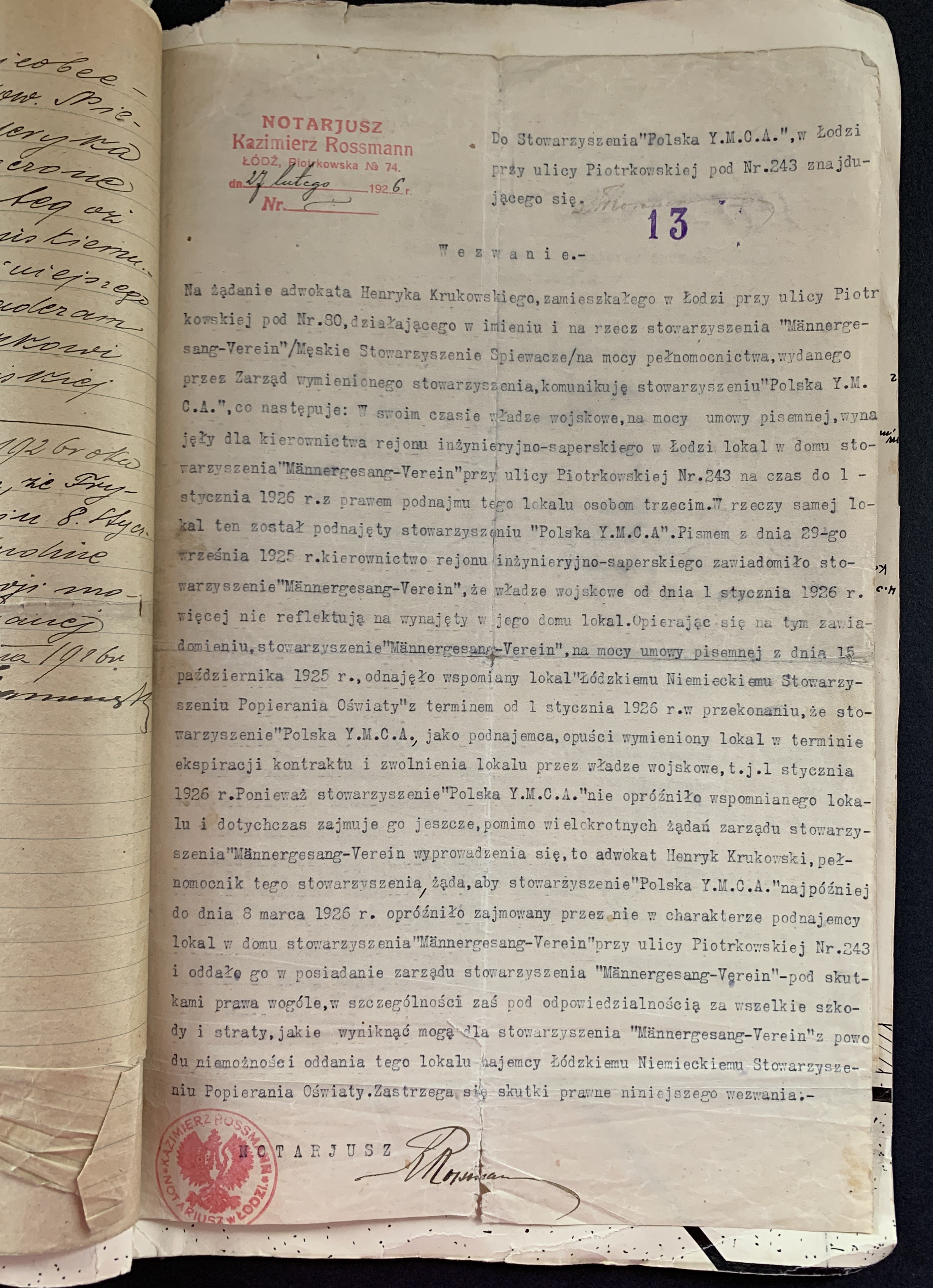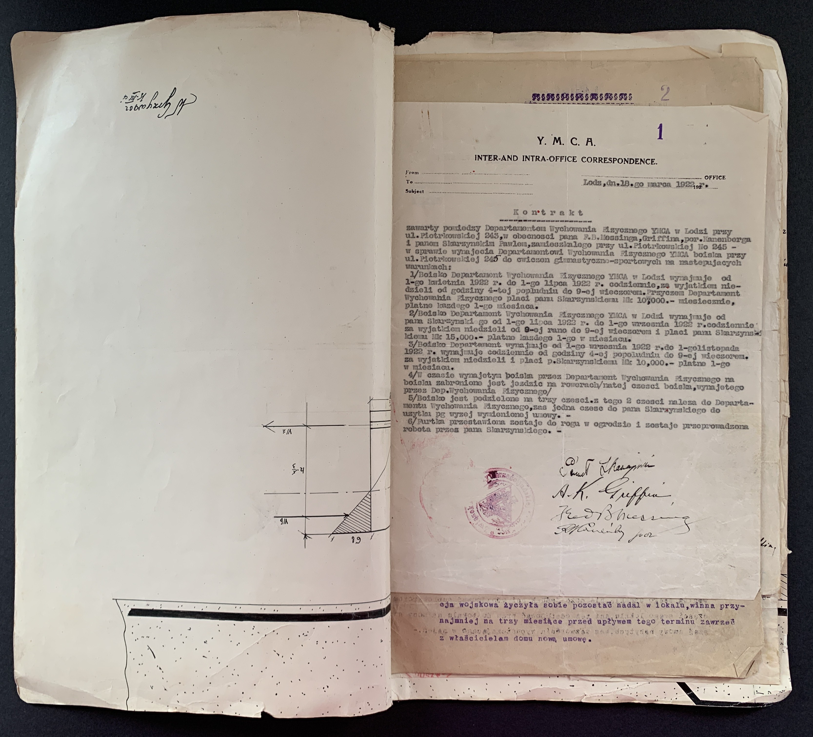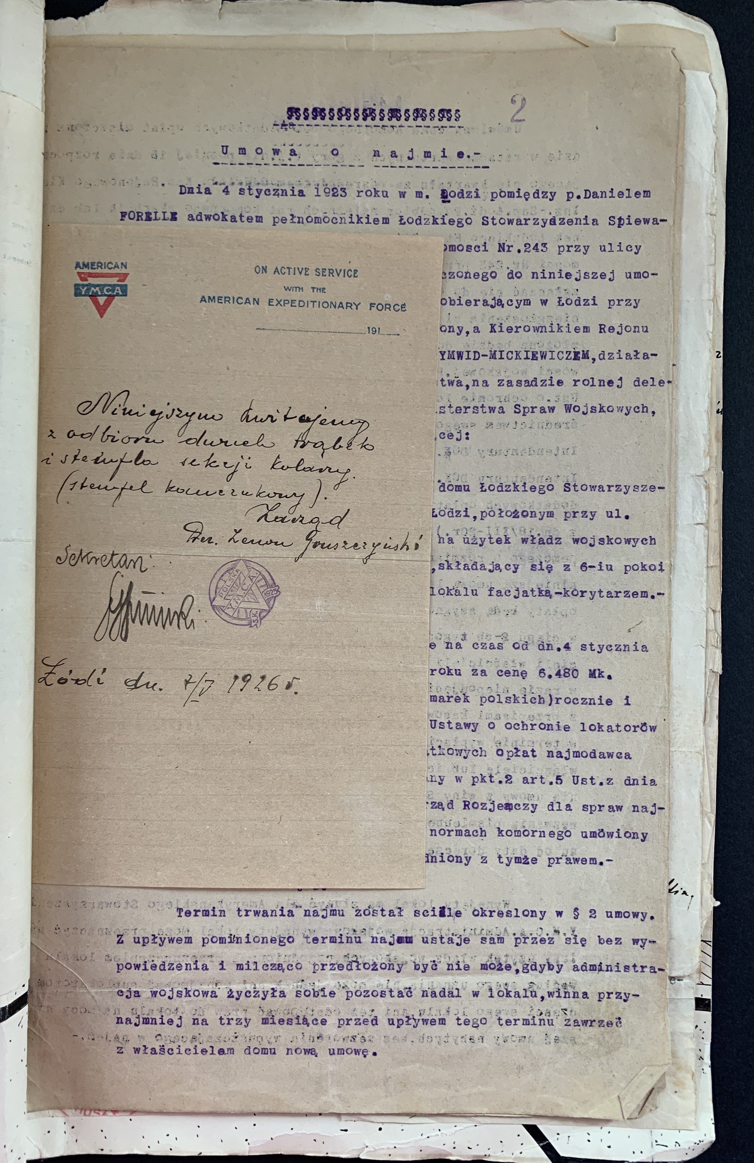 Złożone podpisy m.in.: Majora Janusz Rymwida-Mickiewicza, przedstawicieli Departamentu Fizycznego YMCA, Prezes Łódzkiego Stowarzyszenia Śpiewaczego „Mannergesangferein".