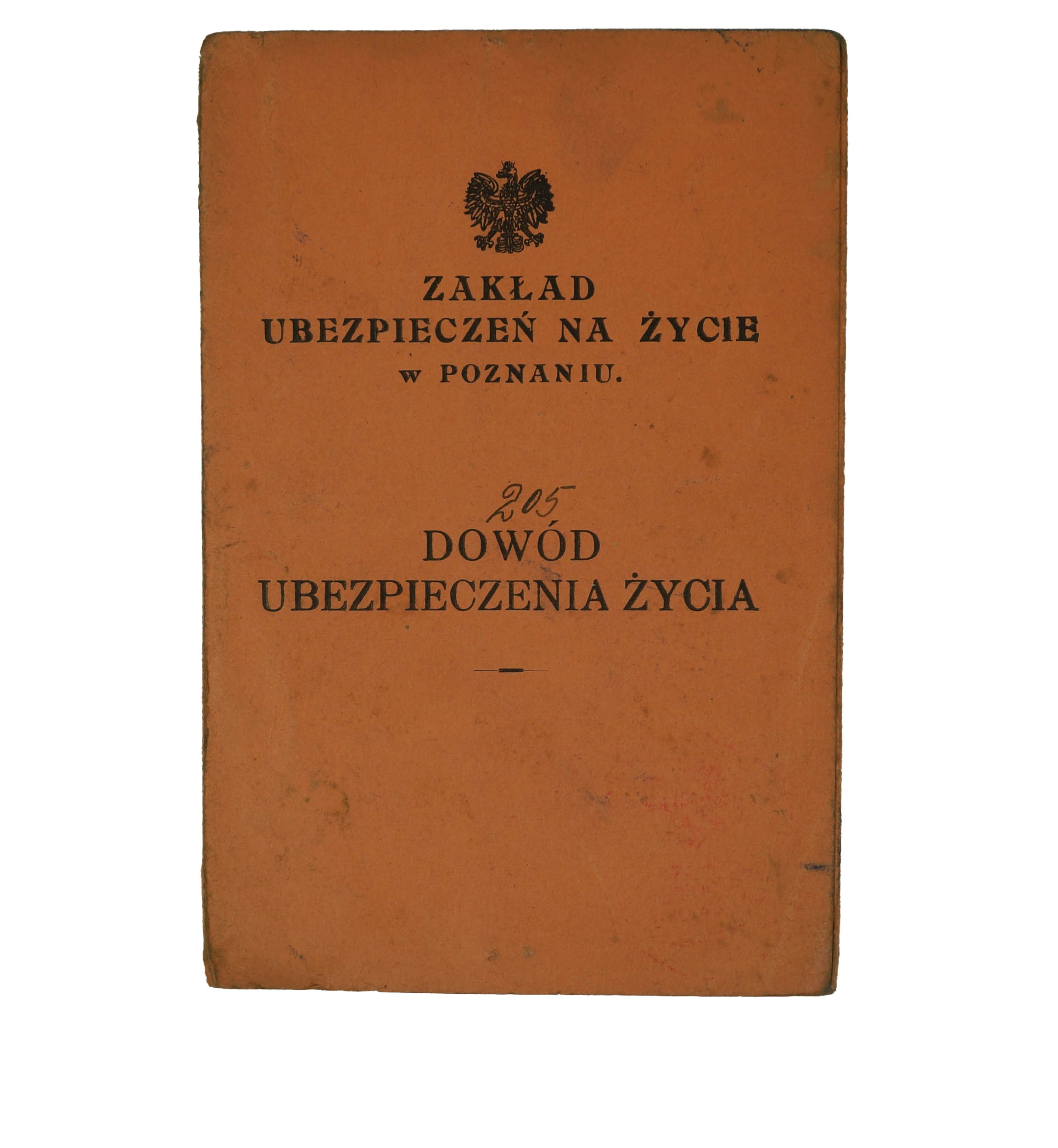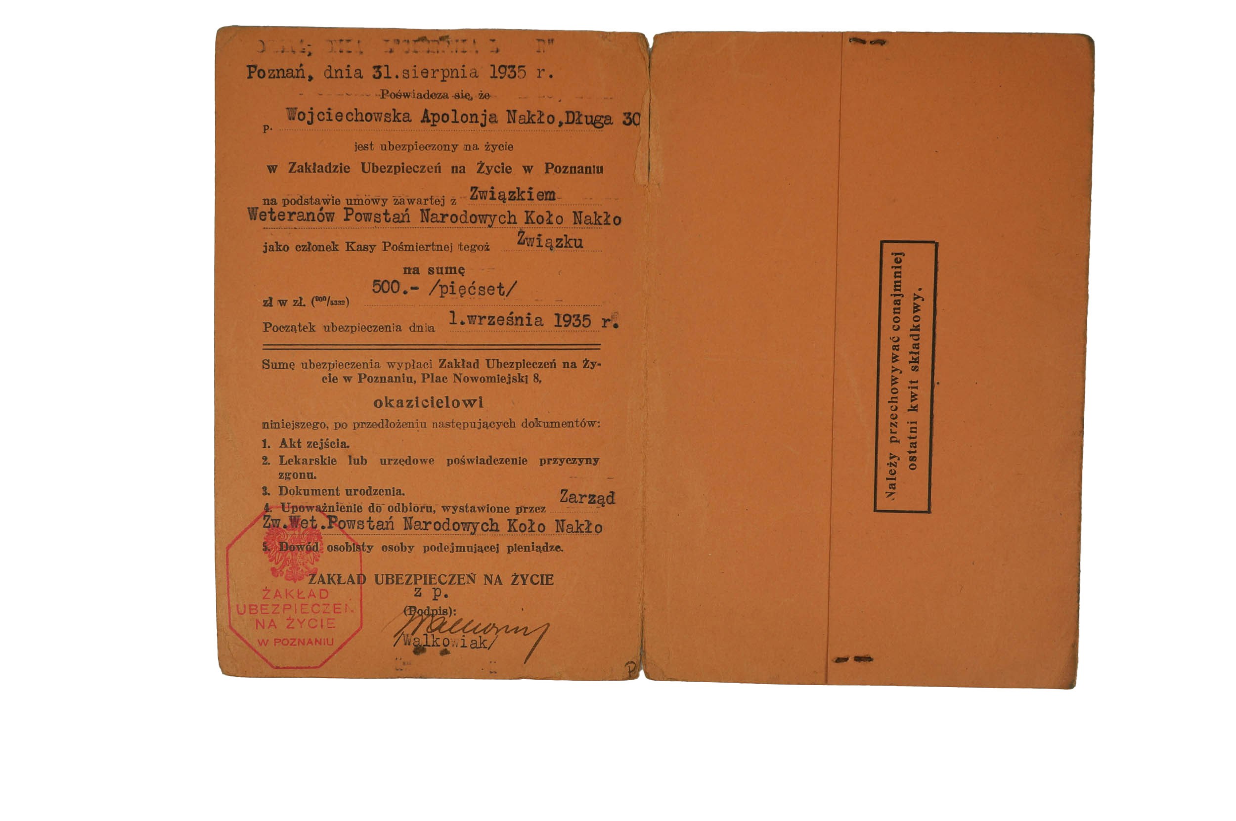 Zakład Ubezpieczeń na Życie w Poznaniu DOWÓD UBEZPIECZENIA ŻYCIA 31 sierpnia 1935r., wystawione dla Apolonii Wojciechowskiej z Nakła na podstawie umowy zawartej ze Związkiem Weteranów Powstań Narodowych Koło Nakło, f. 11,5x17,5cm,