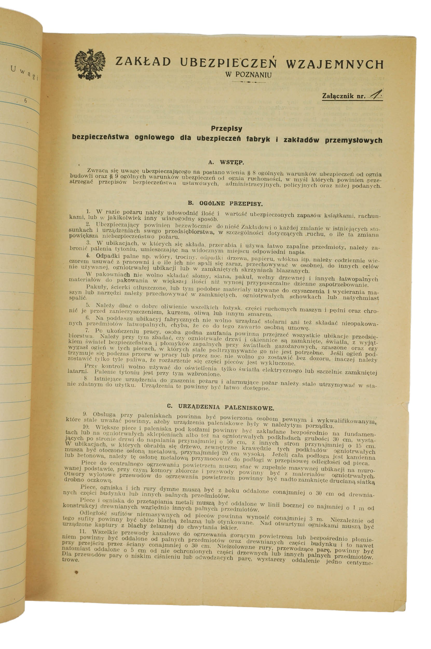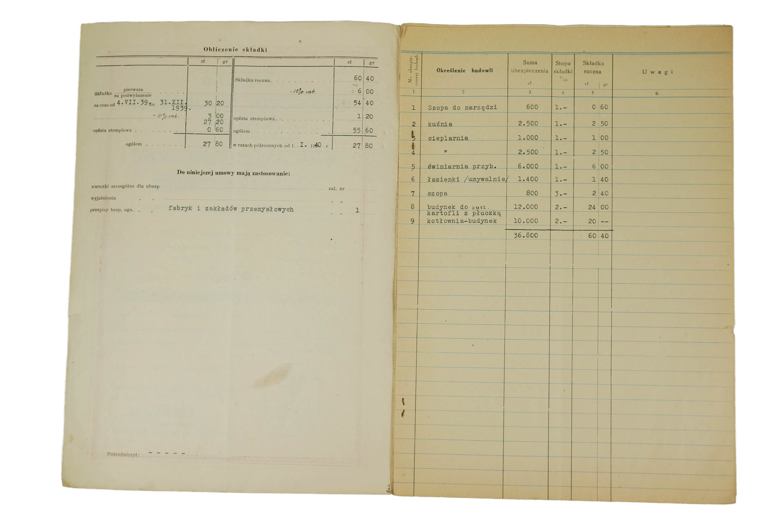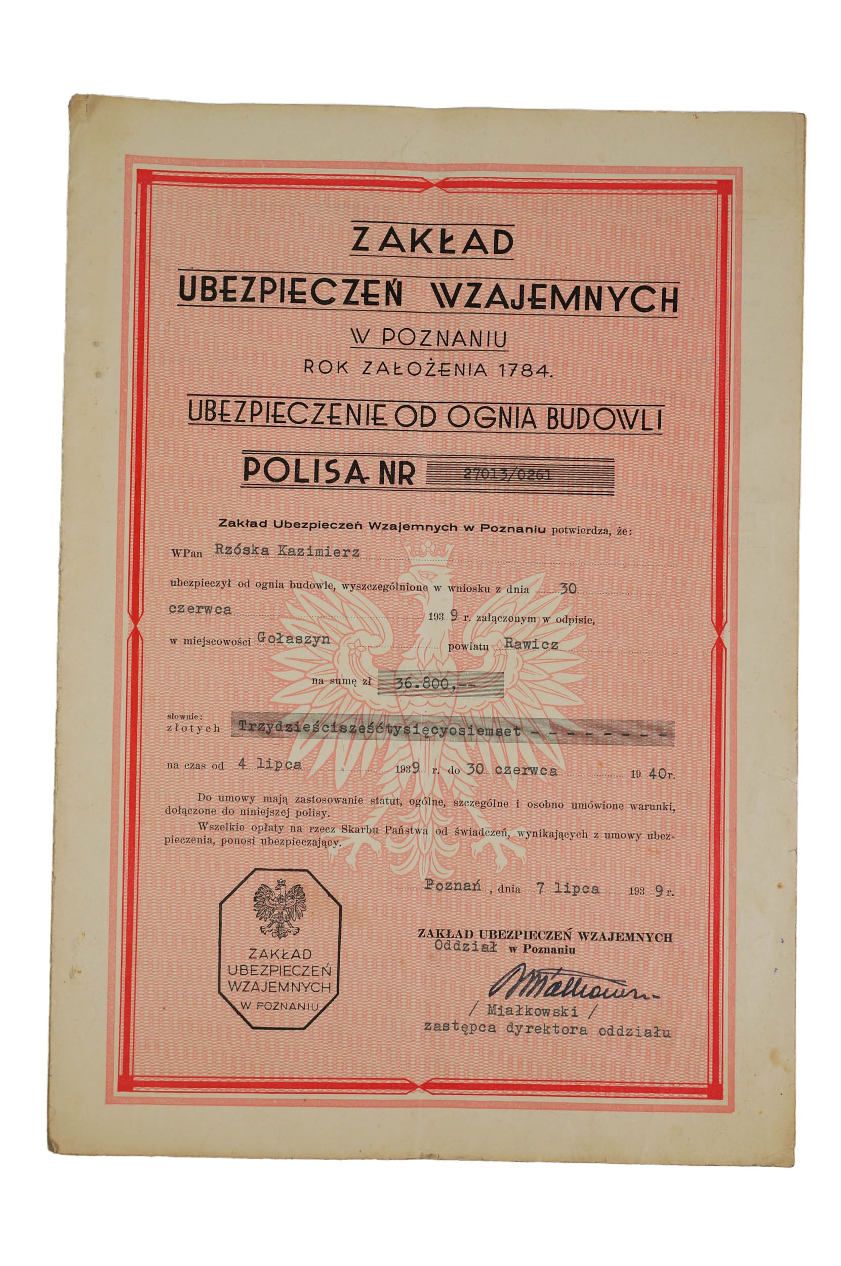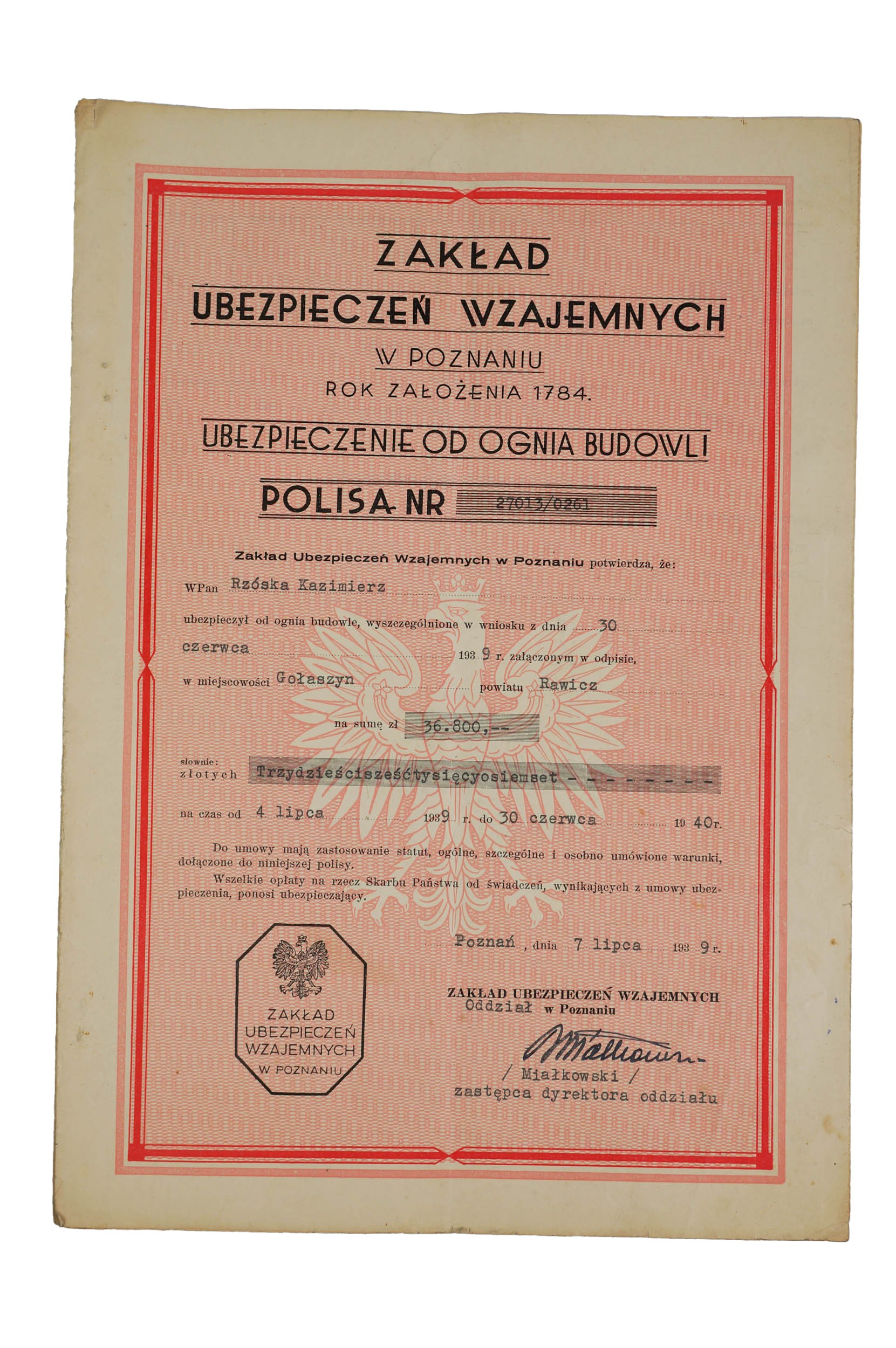 Zakład Ubezpieczeń Wzajemnych w Poznaniu UBEZPIECZENIE OD OGNIA polisa z 7 lipca 1939r., f. 21x30cm, s. nlb. 10