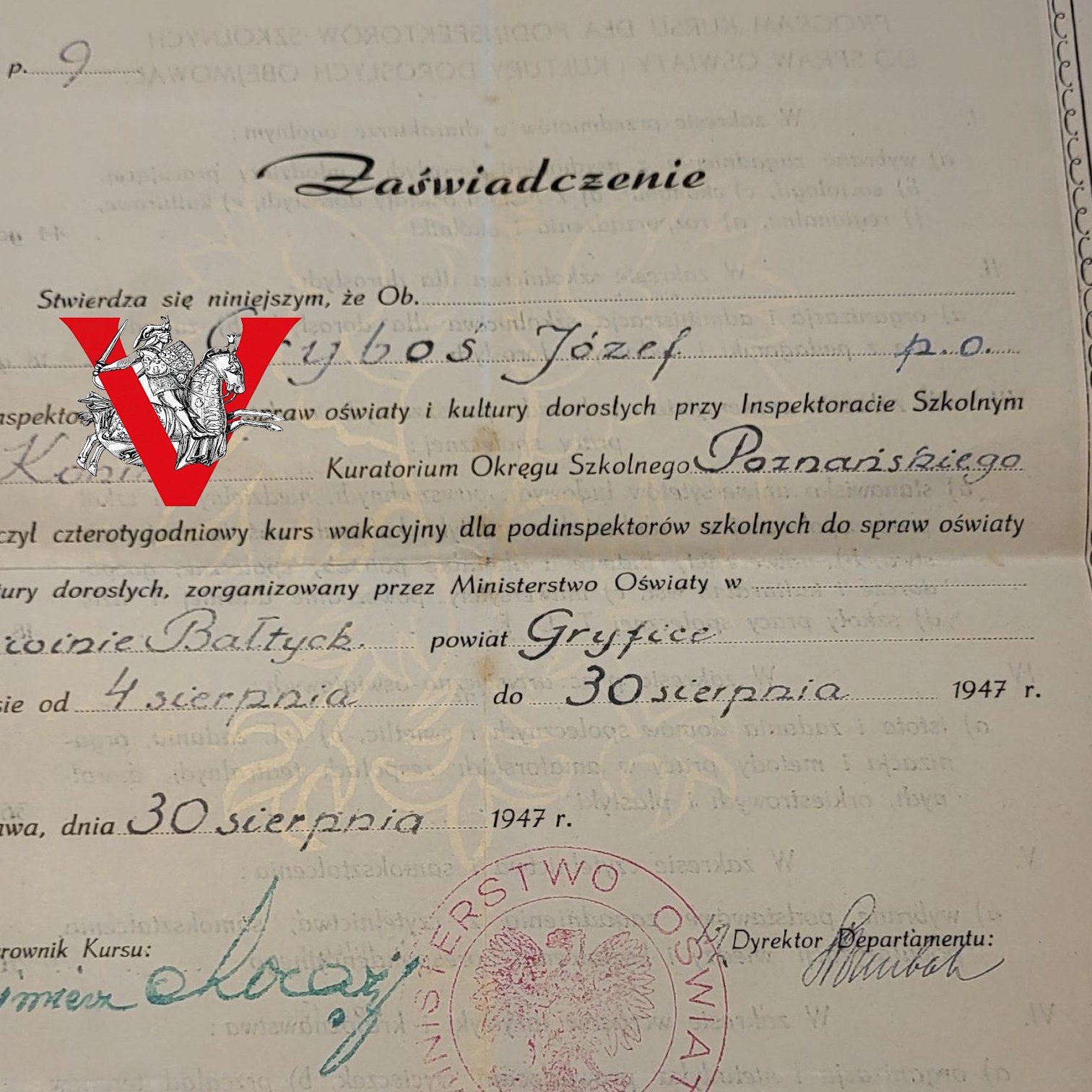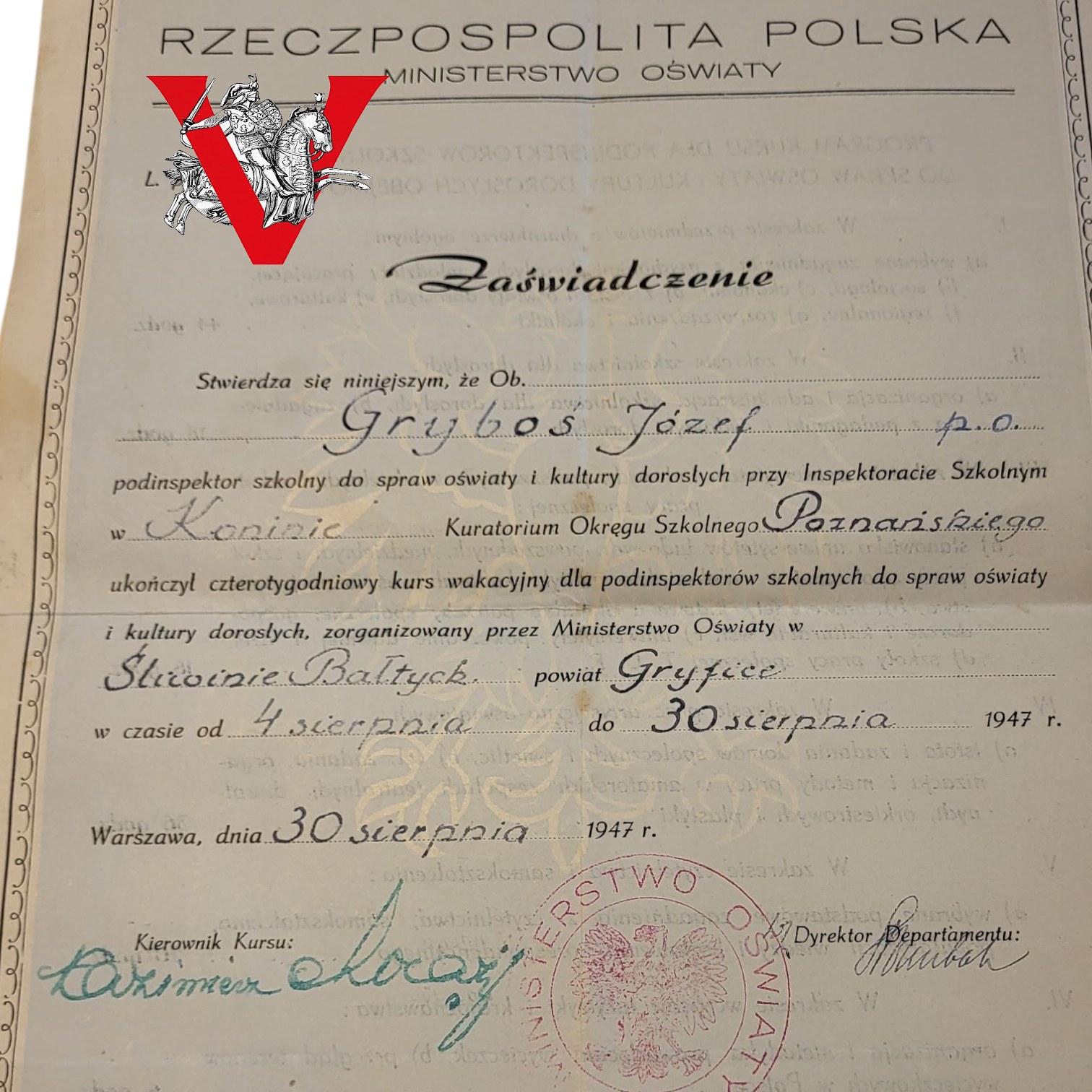Zaświadczenie Ministerstwa Oświaty - Gryfice 1947 r. - nauczyciel / inspektor szkolny, Konin