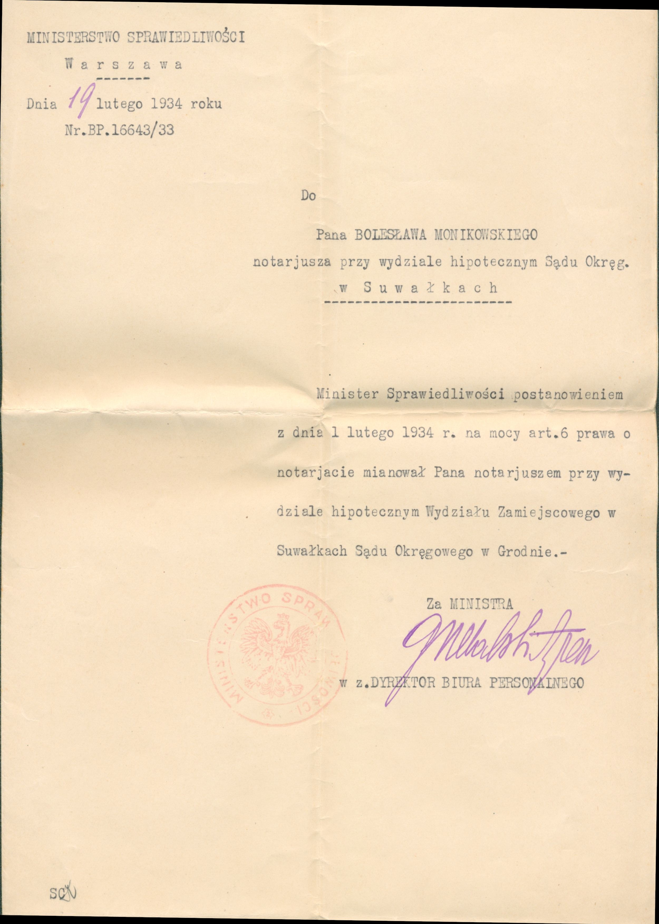 Zawiadomienie adresowane do Bolesława Monikowskiego, wówczas notariusza przy wydziale hipotecznym Sądu Okręgowego w Suwałkach, o uzyskaniu nominacji na stanowisko notariusza w dziale hipotecznym Sądu Okręgowego w Grodnie. W imieniu ministra dokument sygnował dyrektor biura personalnego; na dokumencie widnieje pieczęć ministerialna, jak i znak wodny.