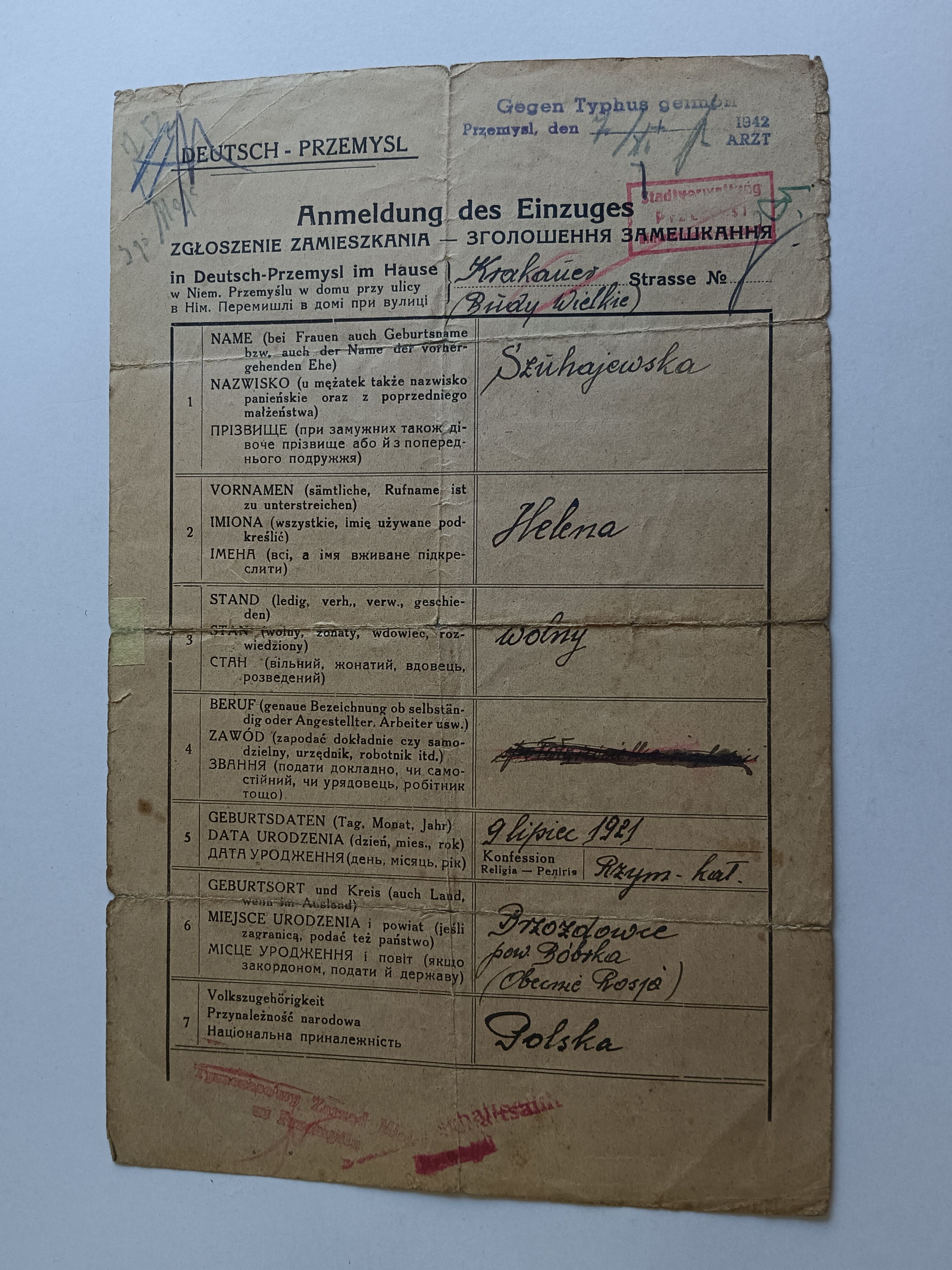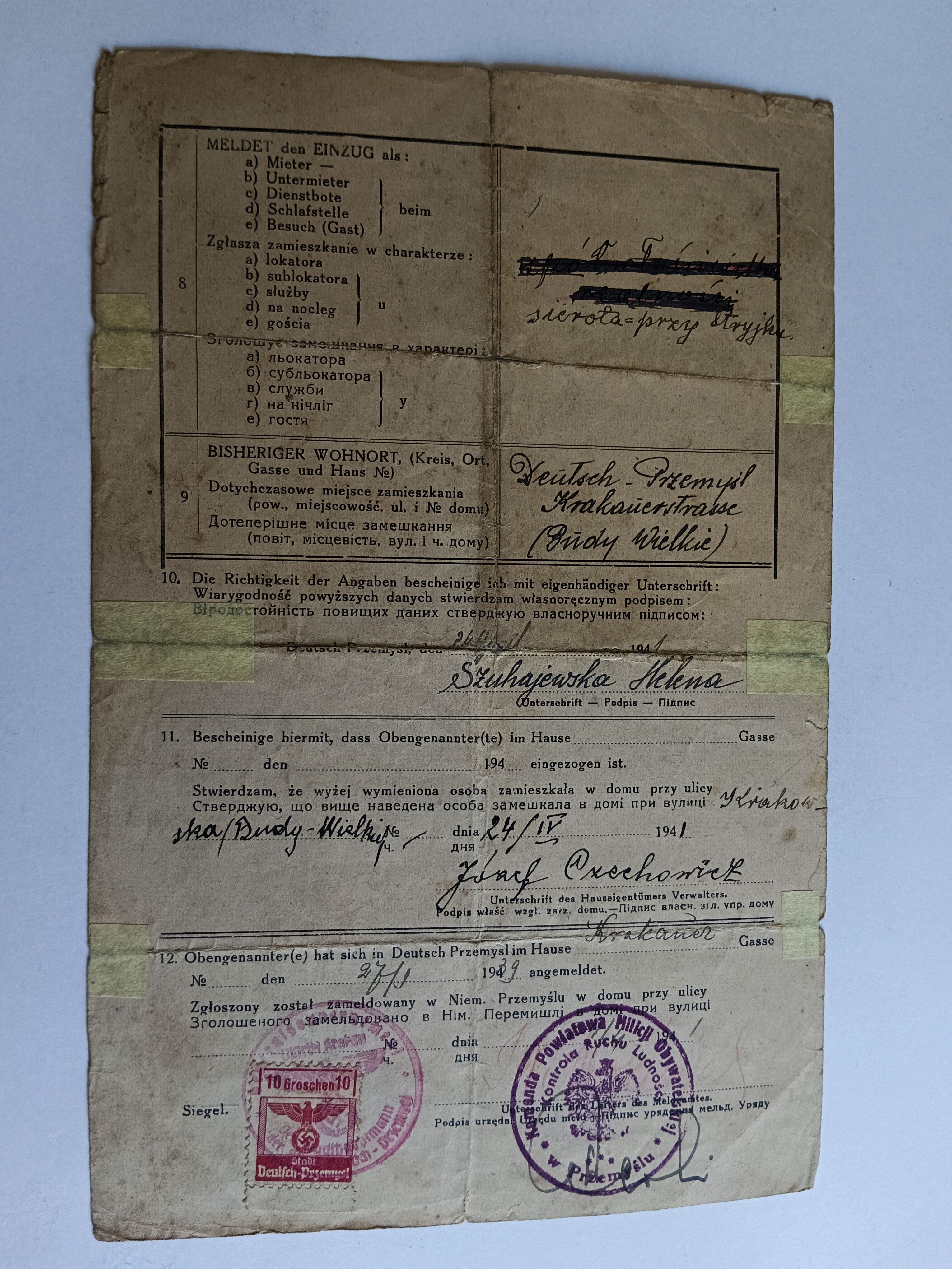 ZGŁOSZENIE ZAMIESZKANIA PRZEMYŚL 1942 ROK, JĘZYK NIEMIECKI, POLSKI, ROSYJSKI, STEMPLE, ZNACZEK