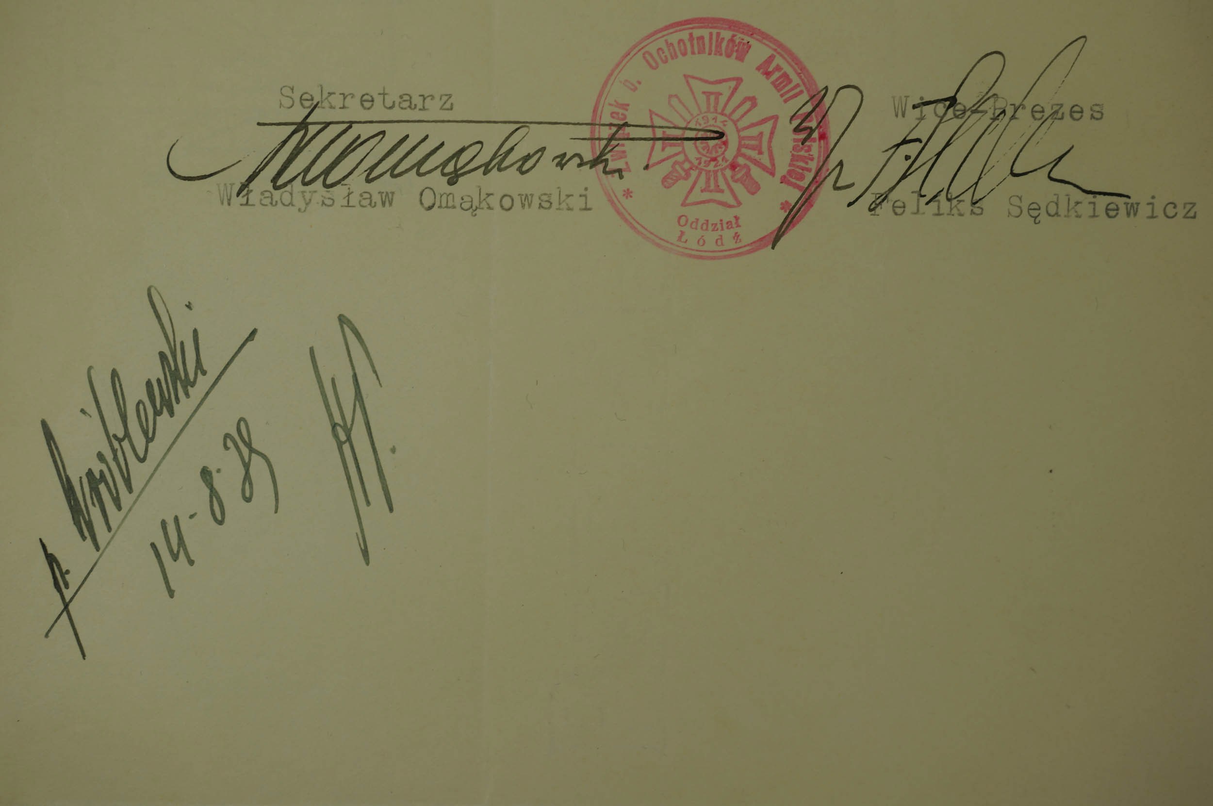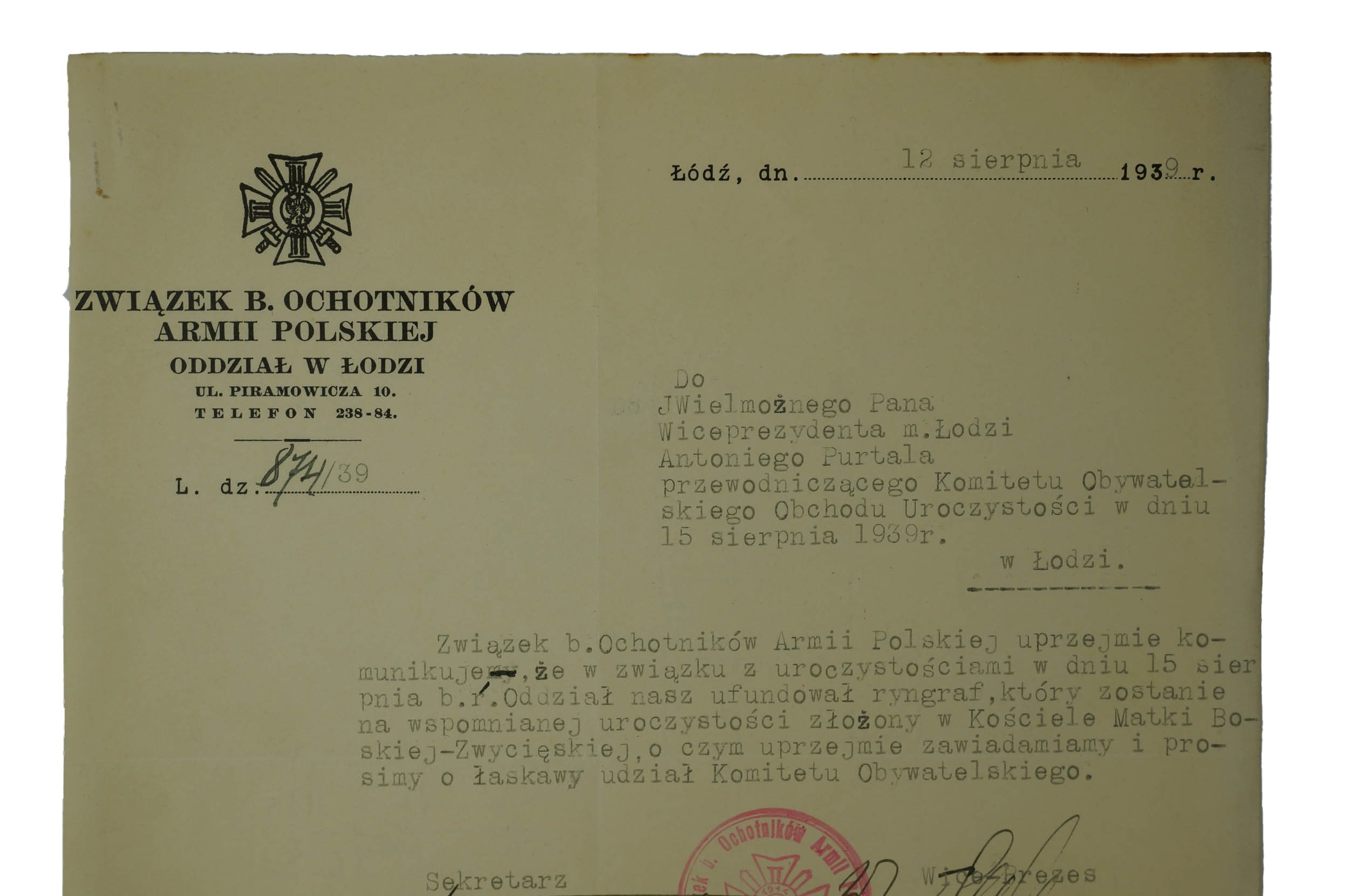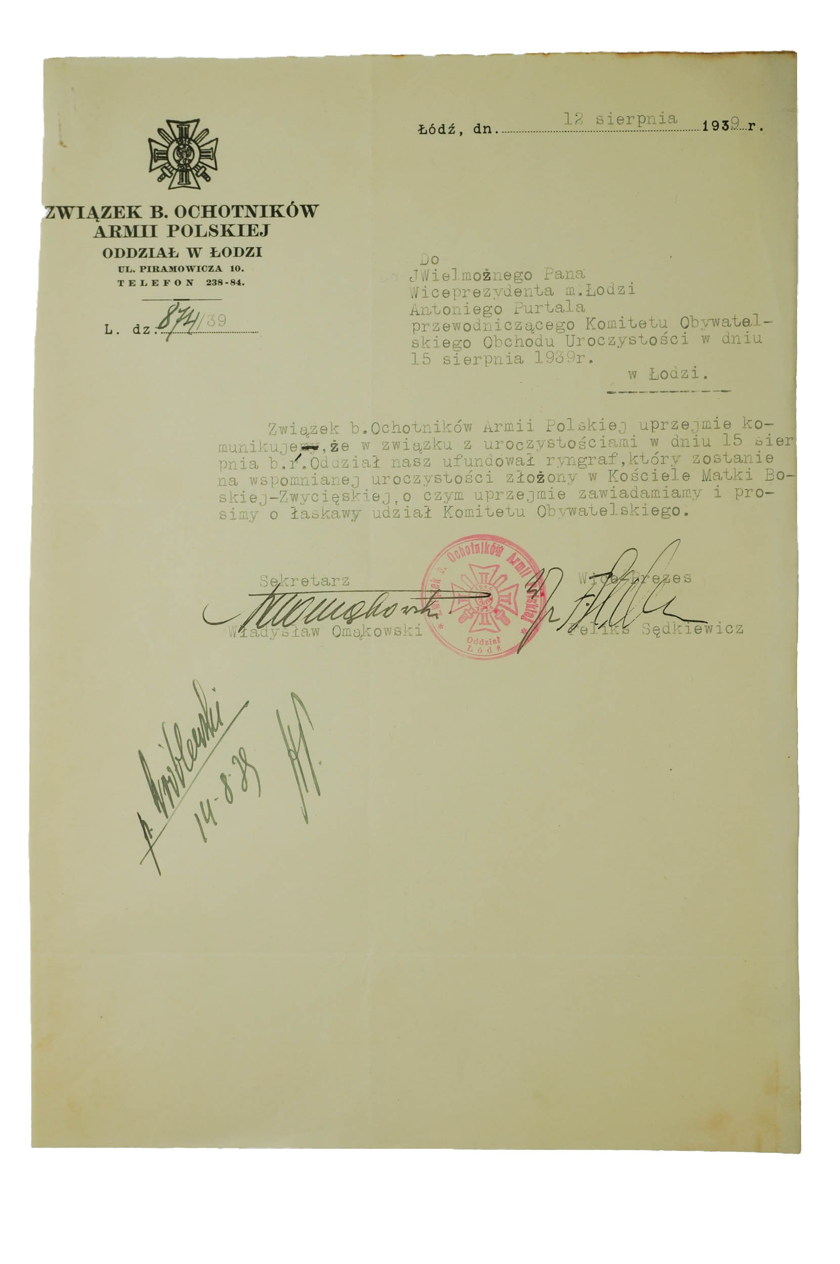 Związek B. Ochotników Armii Polskiej do wiceprezydenta Łodzi Antoniego Purtala z okazji ufundowania ryngrafu na uroczystość w dniu 15 sierpnia [święto Wojska Polskiego] , maszynopis z 12 sierpnia 1939r. na druku z nagłówkiem Związku B. Ochotników Armii Polskiej , autografy sekretarza [W.Omąkowski] i wiceprezesa [F.Sędkiewicz]f. 20,5 x 29,5cm, [BS]