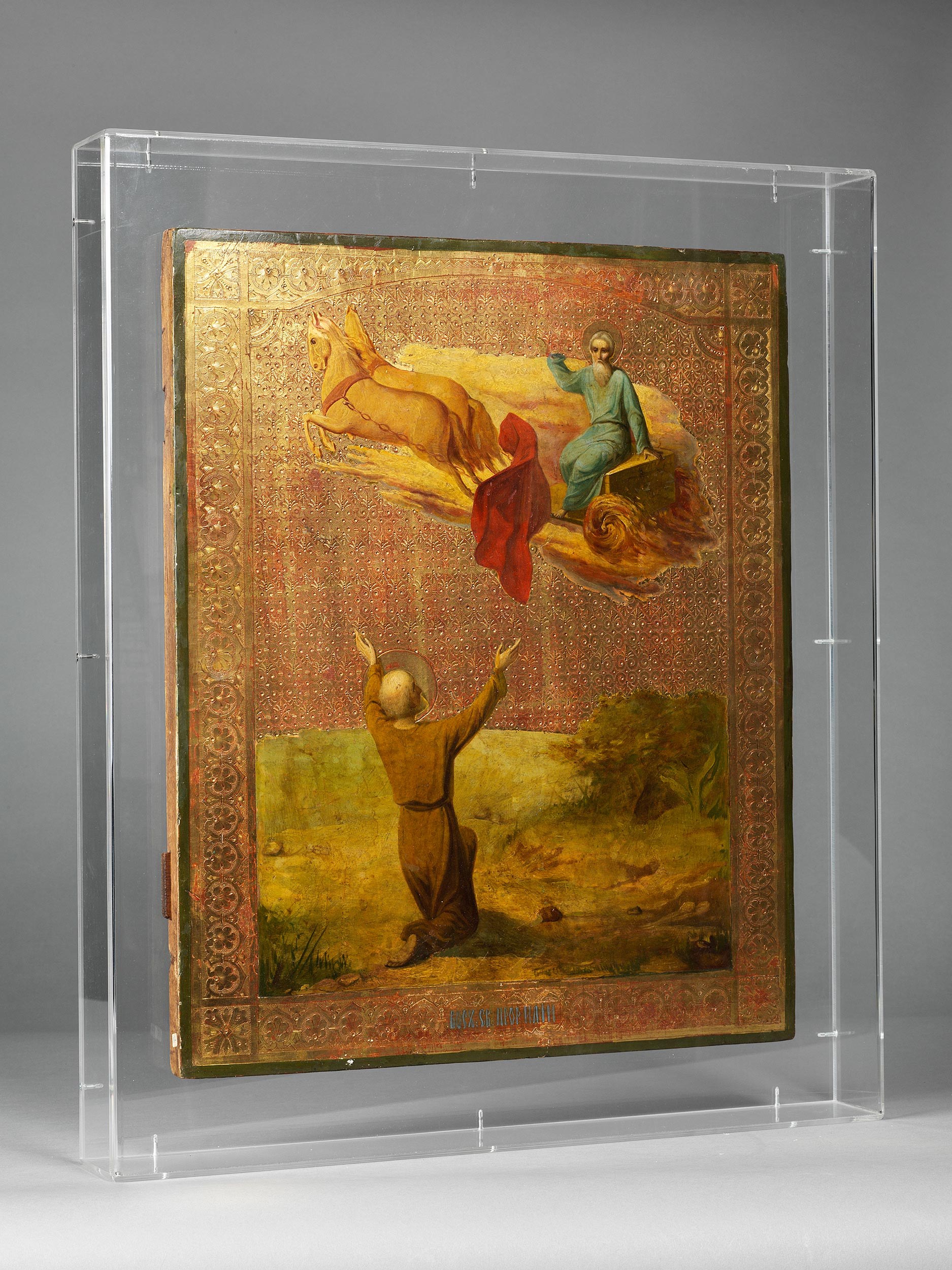 Elisa wird von Elia im 1. Buch der Könige, 19-21, durch das Überwerfen des Mantels als Diener gewonnen und somit zum Nachfolger des Elias. Darstellung auf goldenem Grund in polychromen Farben. (1411325) (13)