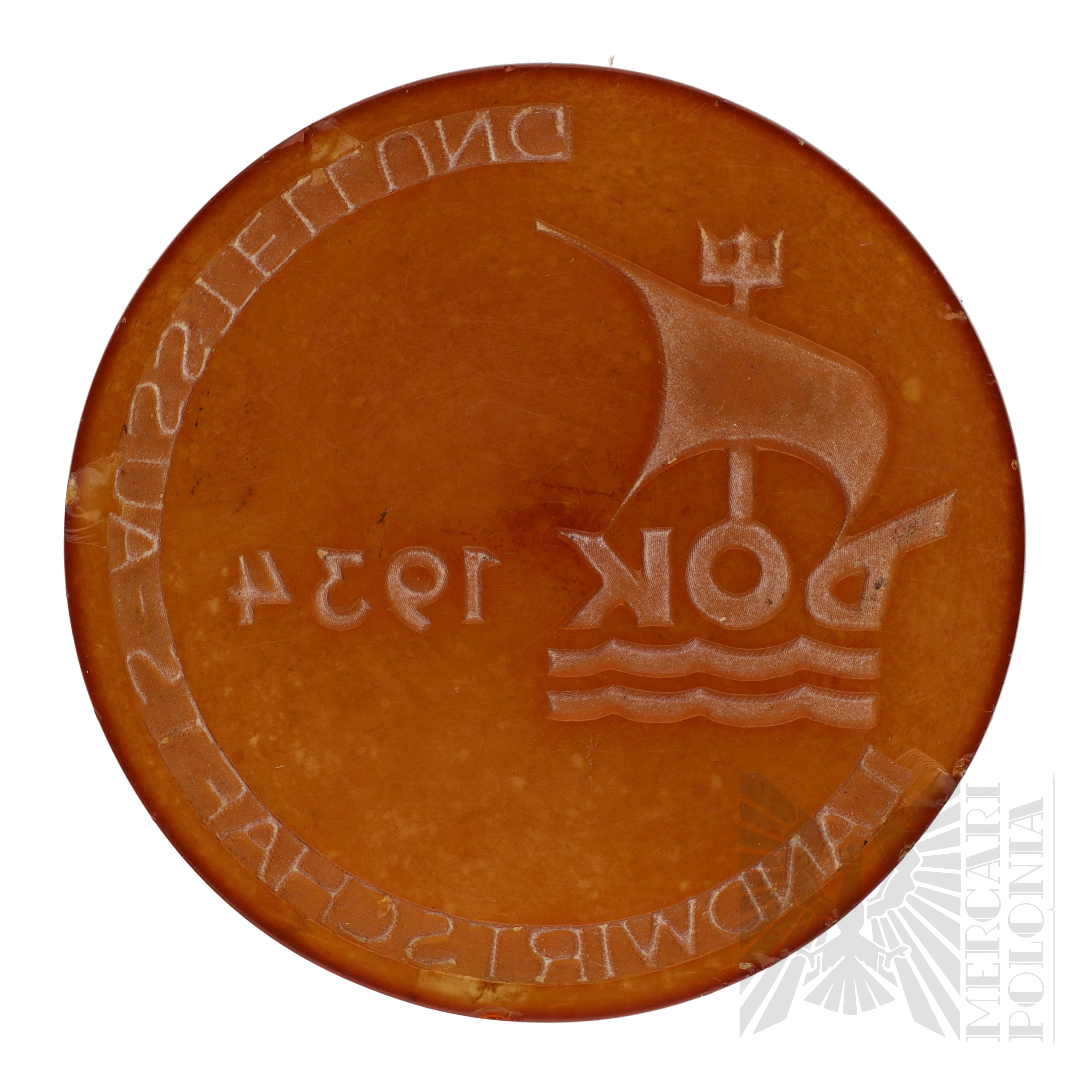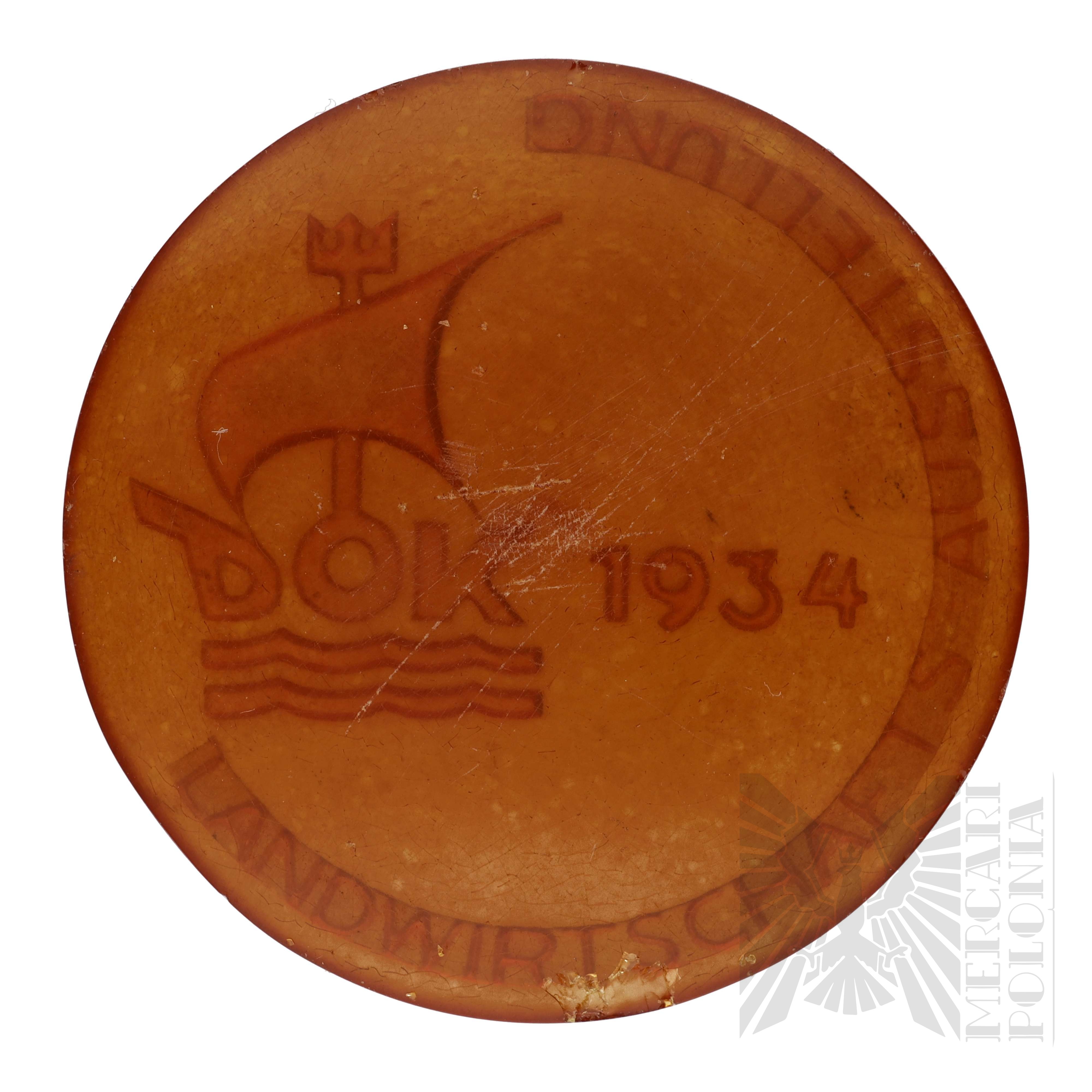 Plakieta wykonana z tworzywa sztucznego imitujący bursztyn upamiętniające Targi w Królewcu w 1934 roku, Ostmesse, oficjalnie Deutsche Ostmesse Königsberg (DOK), była targami handlowymi w Królewcu, Niemcy. Została założona, aby wspomóc odbudowę Prus Wschodnich po ich oddzieleniu od Republiki Weimarskiej po I wojnie światowej.