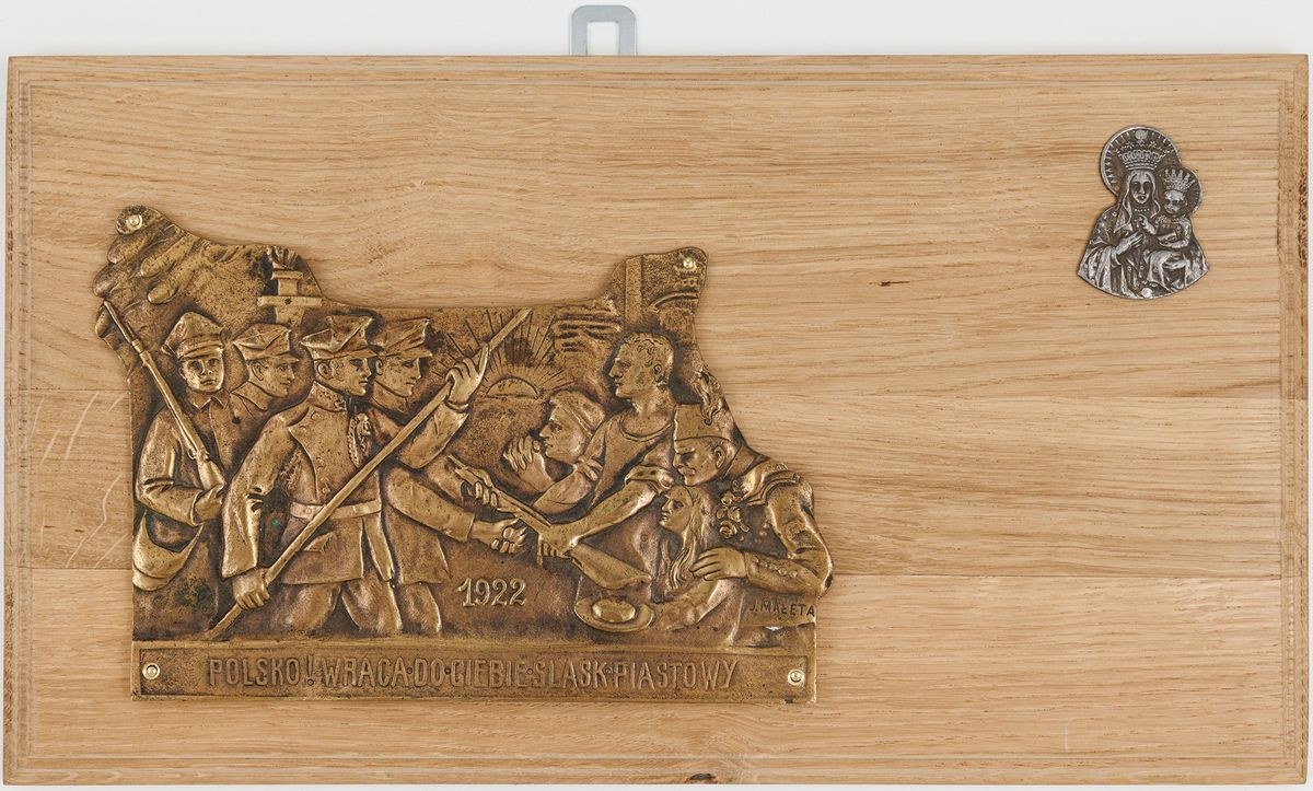 Stan: brak górnej części z orłem, zamocowana do deski z plakietką z Matką Bożą Częstochowską
