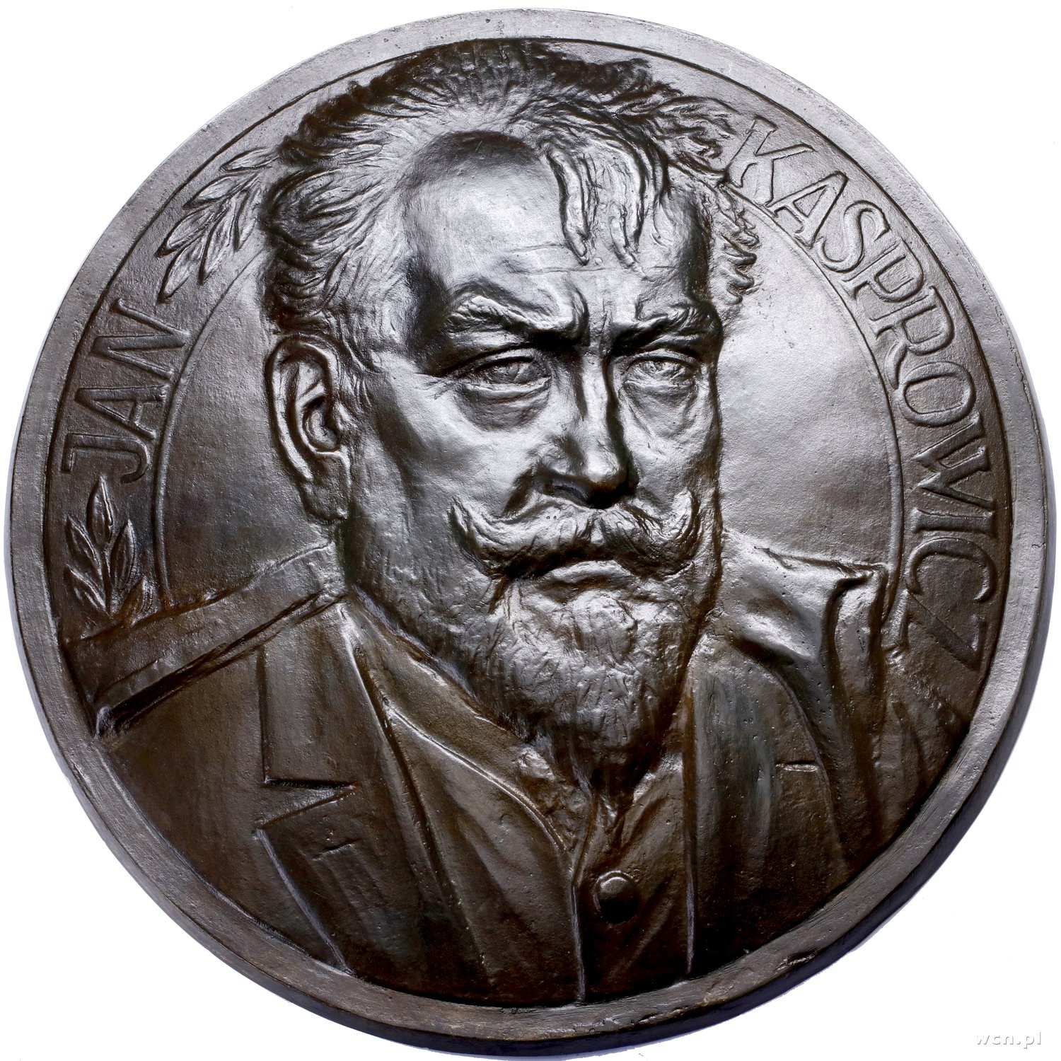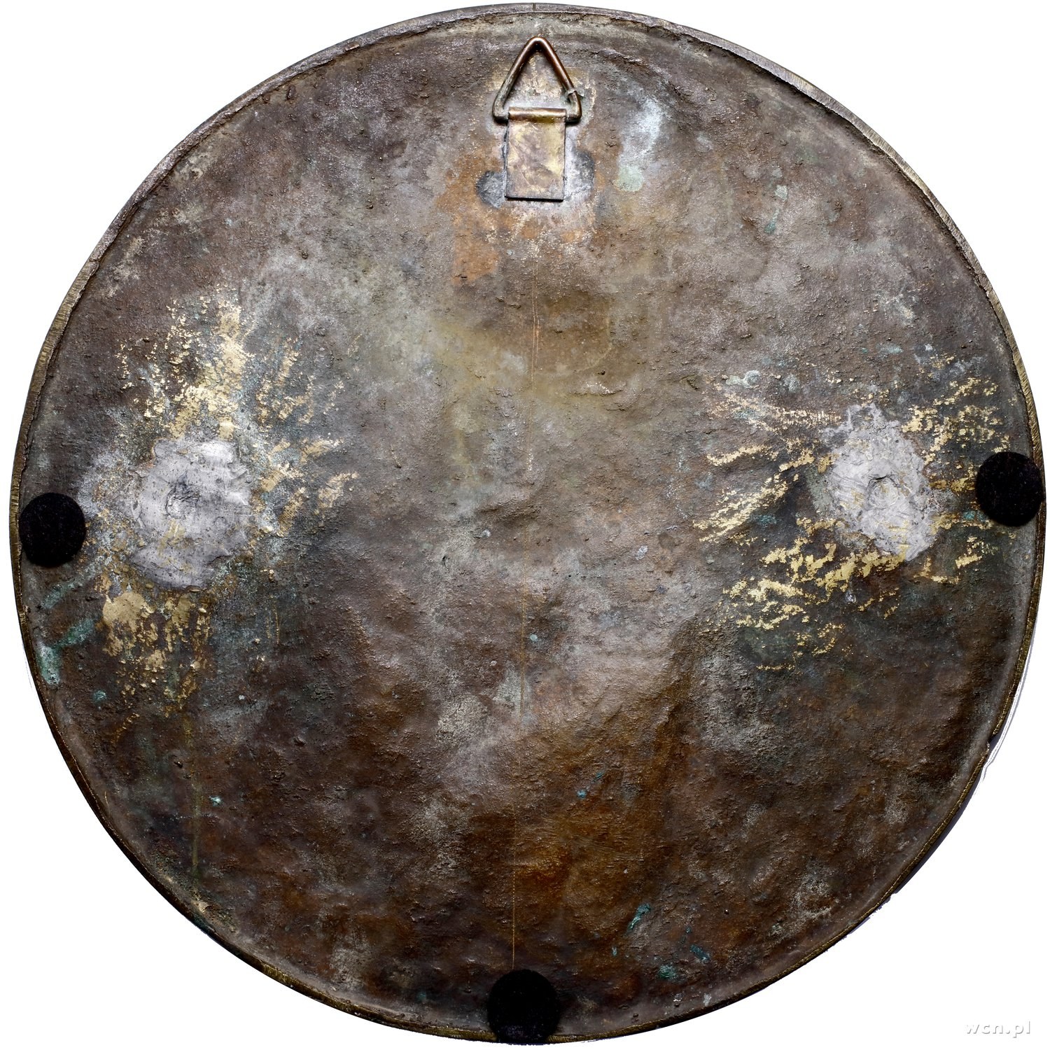 POLSKA, plakieta Jana Wysockiego według projektu z 1926 r. poświęcona Janowi Kasprowiczowi; Popiersie trzy-czwarte w prawo, w otoku ozdobiony gałązkami laurowymi napis JAN KASPROWICZ; Strzałkowski jak 559 (analogiczny portret, ale nieco odmienna kompozycja otokowa i bez daty w polu); brąz lany 306 mm, na odwrocie dolutowana zawieszka, zeszlifowane dwie śruby oraz przyklejone trzy filcowe podkładki, bardzo rzadka, ładna i efektowna plakieta