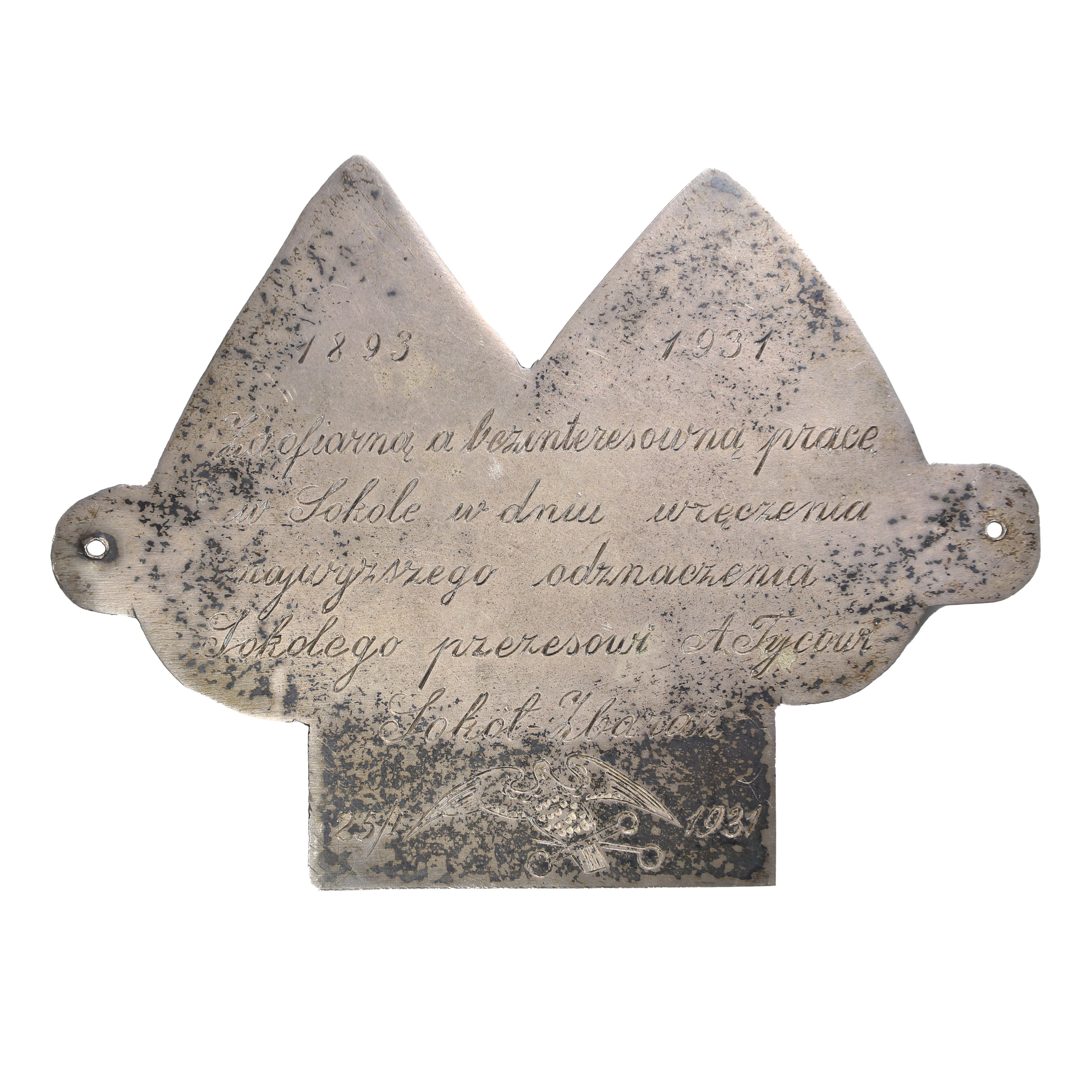 Waga: 33,49 g, bardzo ciekawa, unikatowa pamiątka Towarzystwa Sokół z miasta Zbaraż (do 1945 r. polskie miasto w województwie tarnopolskim)