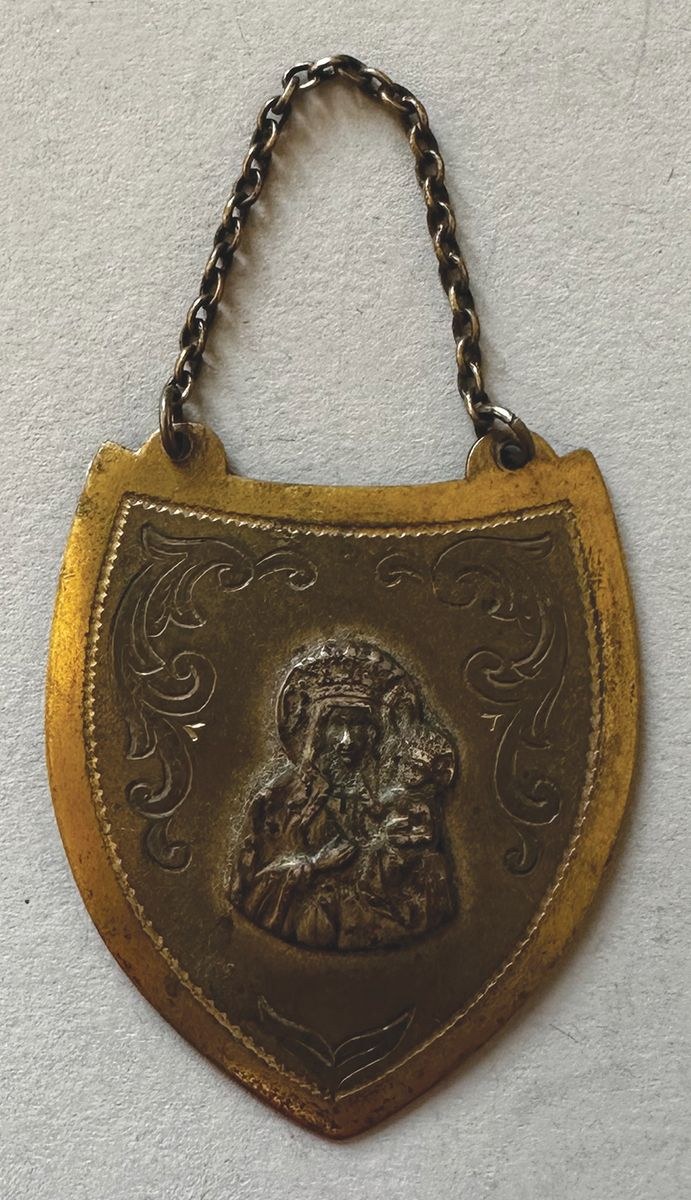 Srebro, złocenie, waga 9,3 g; 43 x 36 mm, dwuczęściowa, łańcuszek Puncowanie: V; W, głowa w chuście, 3 Cena wywoławcza 300 Estymacja 360 - 400 zapytaj o obiekt