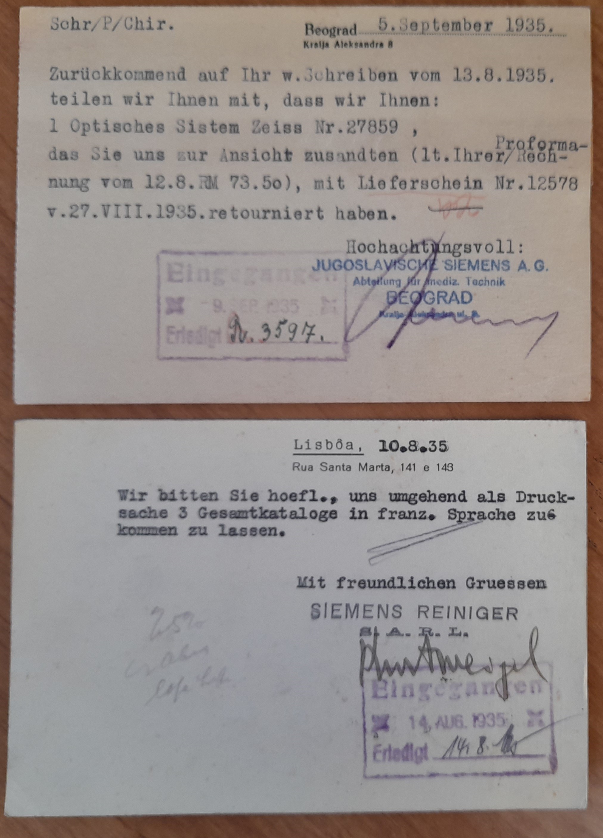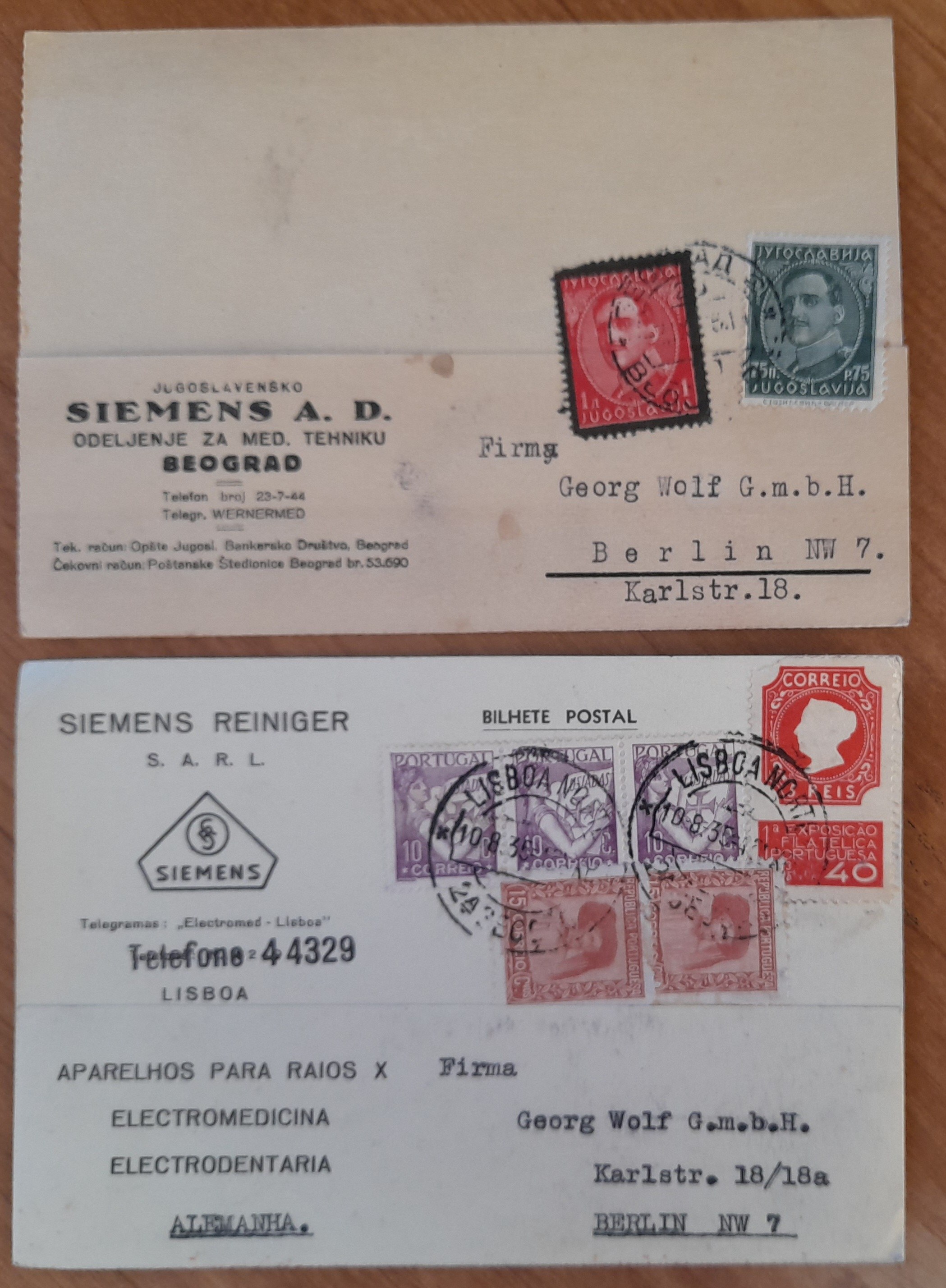 Dwie karty pocztowe firmy Simens:Lizbona i Belgrad 1935 r.