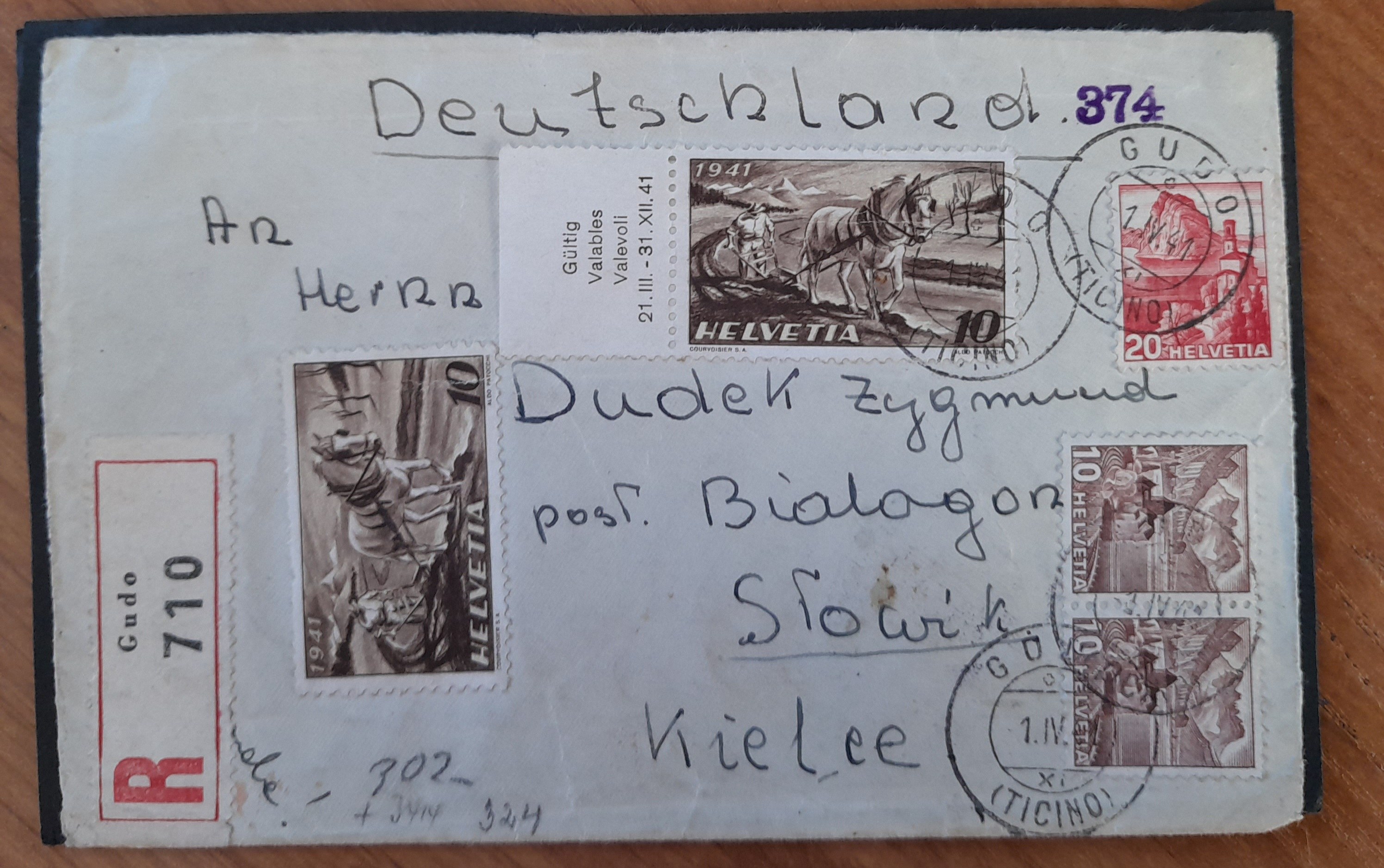 Koperta wysłana ze Szwajcarii do miejscowości Słowik pod Kielcami Data 1.04.1941 r.