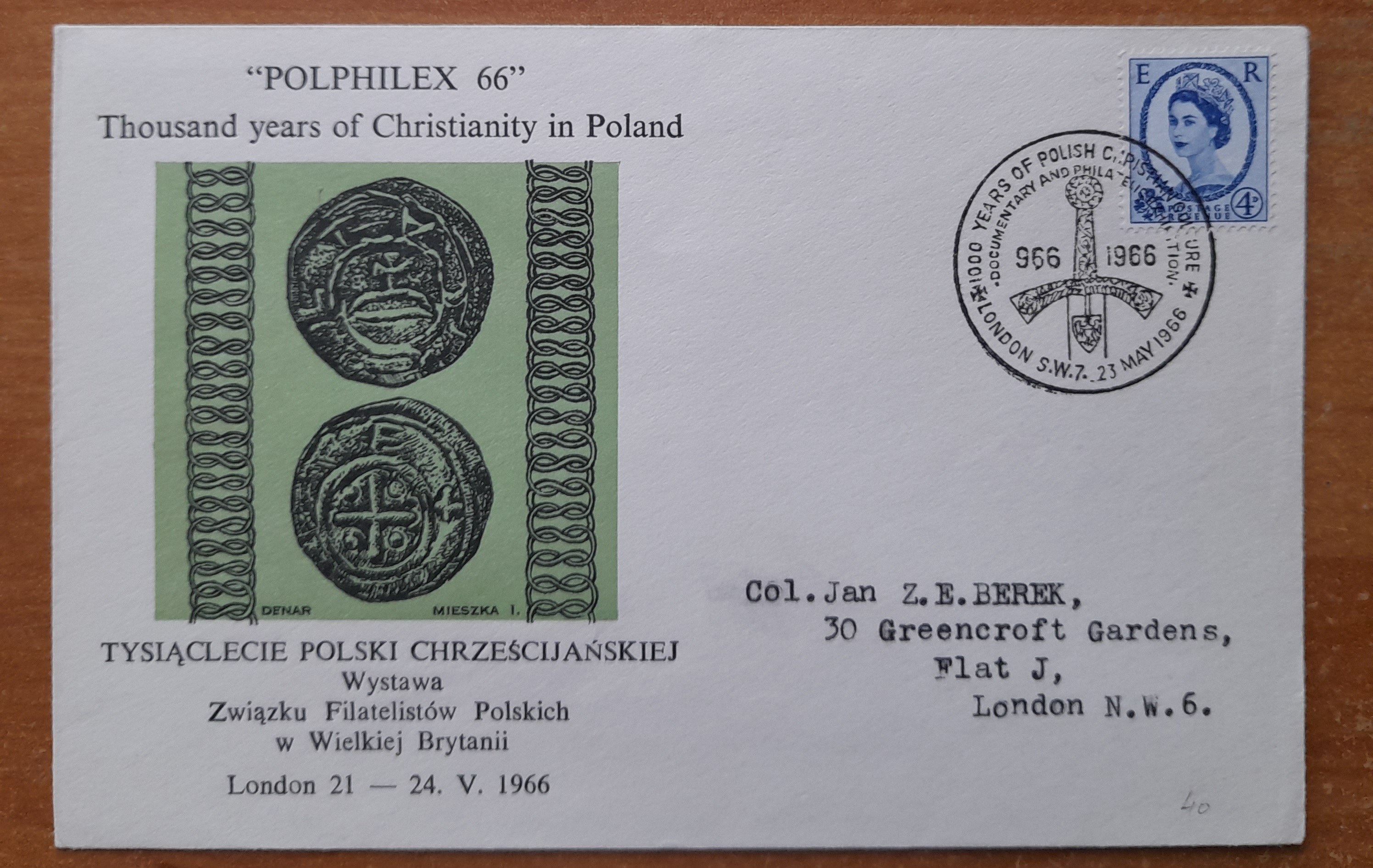Koperta ze znaczkiem pocztowym z okazji Wystawy Związku Filatelistów Polskich w Wielkiej Brytanii 21-24 V 1966 r..