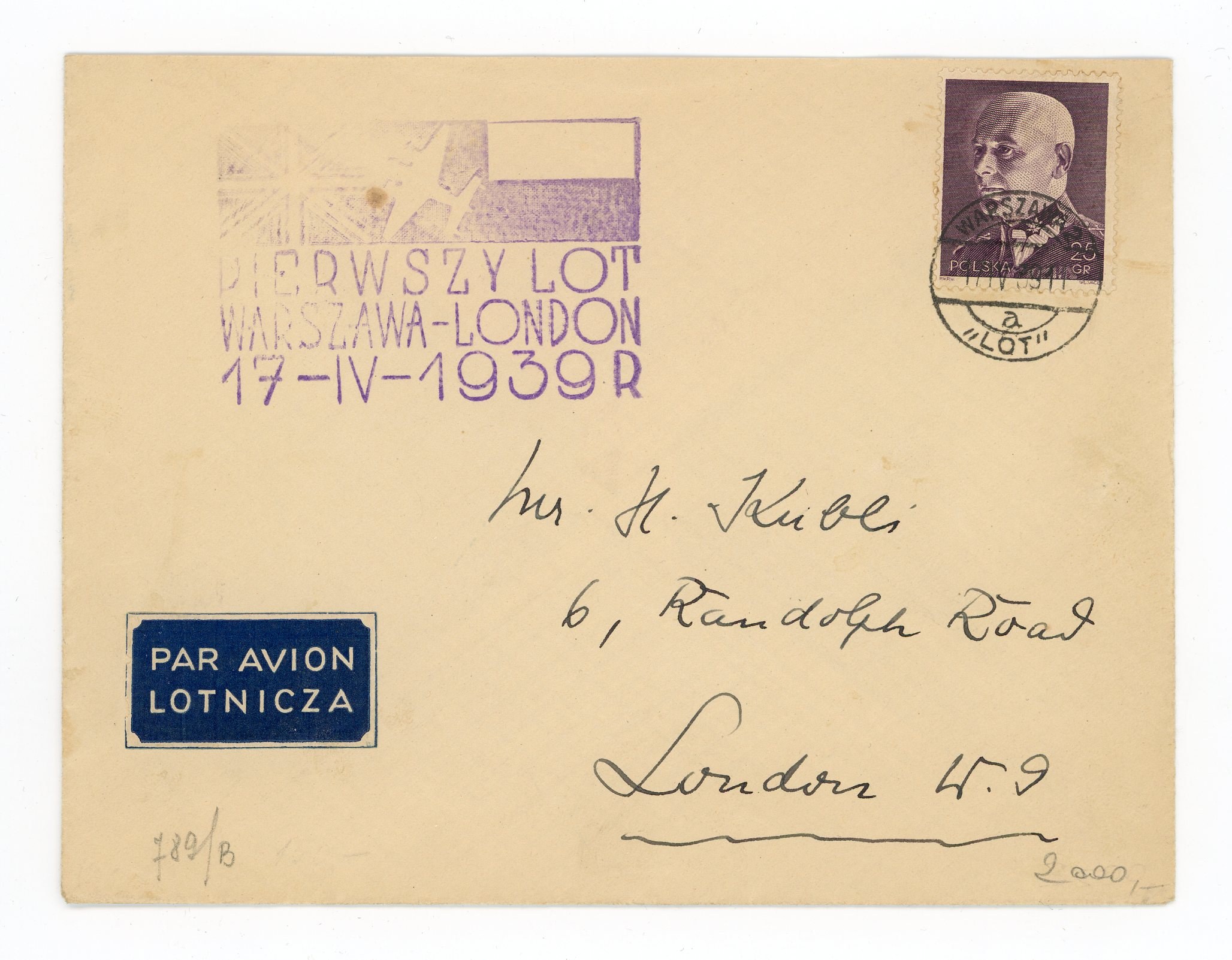 Warszawa - Londyn "British Airways" 1939, koperta przesłana pocztą lotniczą, znaczek skasowany datownikiem WARSZAWA 2 "LOT" z wyróżnikiem "a", dodatkowy stempel okolicznościowy "PIERWSZY LOT WARSZAWA-LONDYN 17-IV-1939 R" (Myślicki 39 206).