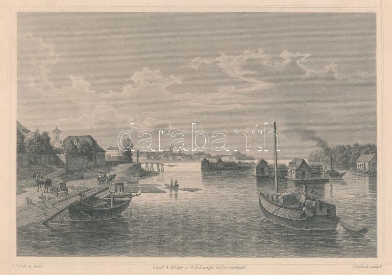 1853 Ludwig Rohbock (1820-1883) - J. Umbach: Óbuda s a hajómalmok, acélmetszet, jelzett a metszeten, jó állapotban, 17×25 cm