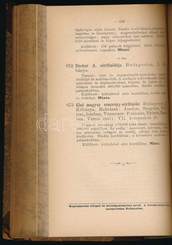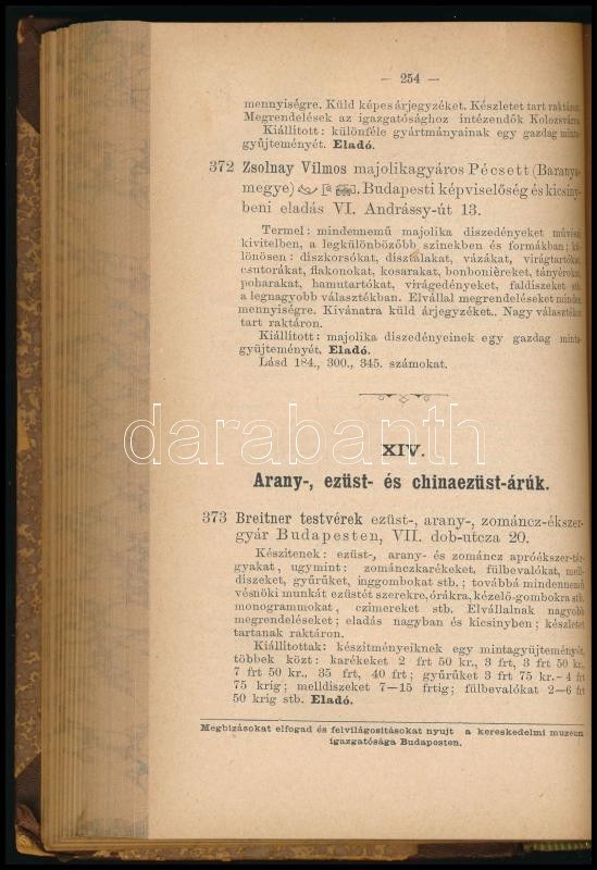 A hazai termékek állandó kiállításának katalógusa. Első évfolyam. 1888. Szerk. Németh Imre. Katalog der Permänenten Ausstellung Vaterländischer Erzeugnisse. Erster Jahrgang. 1888. Verfasst von Emerich von Németh. Bp., 1888, Kereskedelmi Muzeum, (Pesti Könyvnyomda Rt.-ny.), XLV+1+621 p. Magyar és német nyelven. Benne korabeli cégekkel (pl.: Dreher, Zsolnay...stb.), rengeteg adattal. Átkötött félvászon-kötés, kopott borítóval, hiányzó gerinccel, régi intézményi bélyegzésekkel.