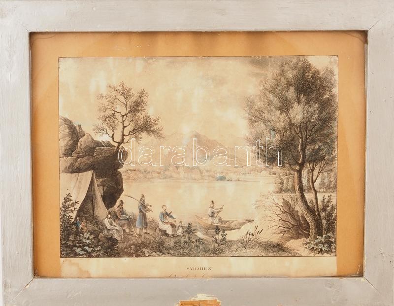 Adolph Friedrich Kunike (1777-1838): Syrmien (Szerém, Srijem). Litográfia, papír, jelzett a litográfián. Adolph Kunike: Zwey hundert vier und sechszig Donau-Ansichten c. kiadványból. Foltos. Üvegezett fakeretben, 25,5×35,5 cm / lithograph on paper, stained, framed