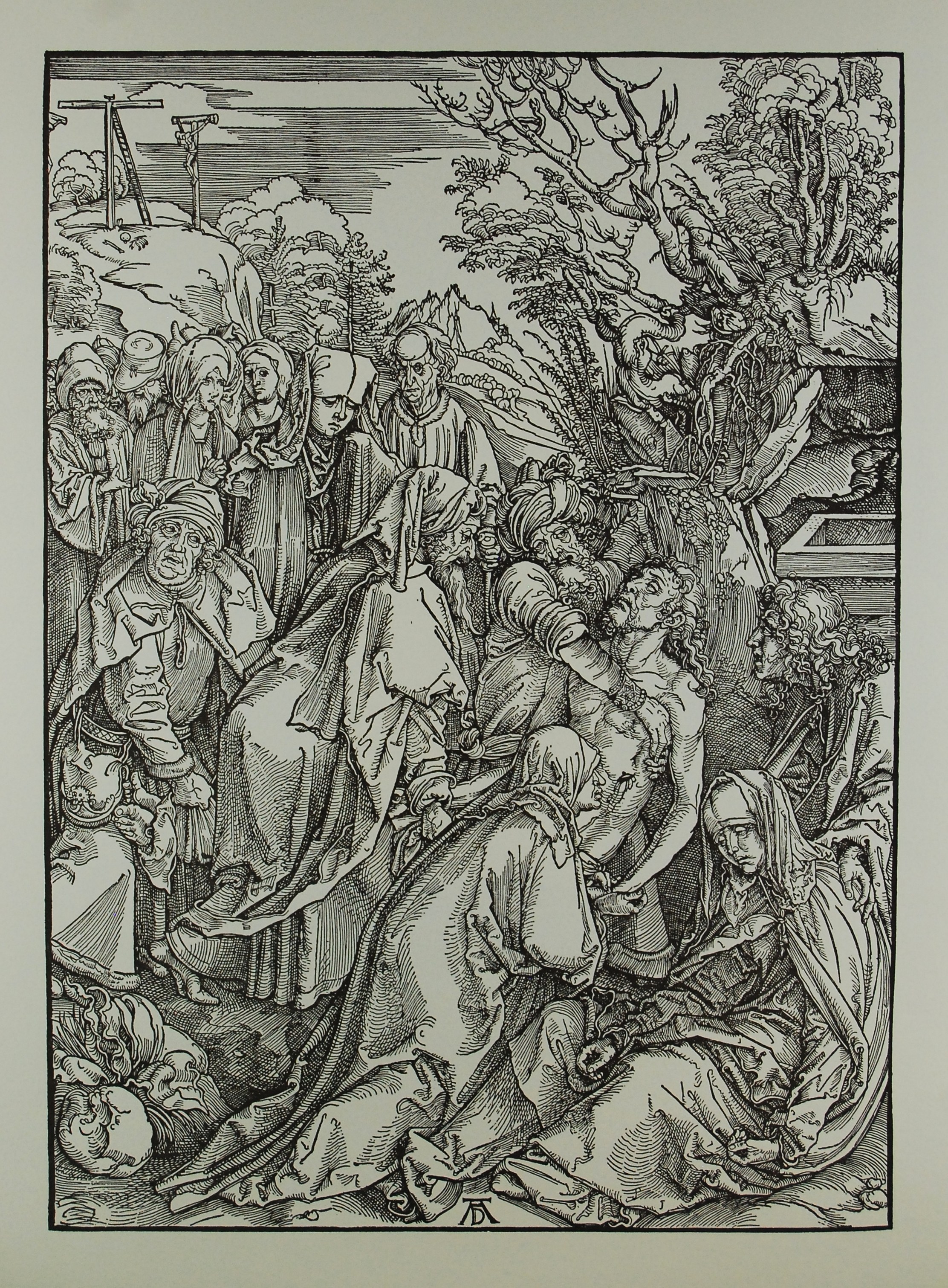 Wydanie z okazji czterysta setnej rocznicy powstania dzieła artysty, ojca drzeworytu i wspaniałego artysty.Wydanie: Narodowa Drukarnia Niemiecka. 1896. Drzeworyt z serii artysty pt:"Grosse Passion" którą artysta przygotowywał w dwóch epizodach pierwszy 1496-1498 z równolegle z "Apokalipsą" oraz 1510-1511 .Drzeworyty przygotowane pod okiem Muzeum Dürera w Norymberdze,na podstawie oryginalnych prac artysty.