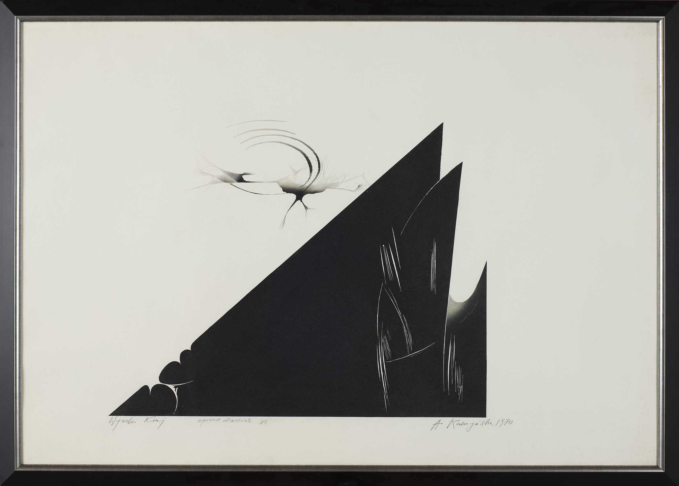 drzeworyt, papier, 69 x 99 cm, sygn. p.d.: A.Kalczyńska 1970. Autorski opis: Wysoki Kraj / eprinte d'artiste VI.
