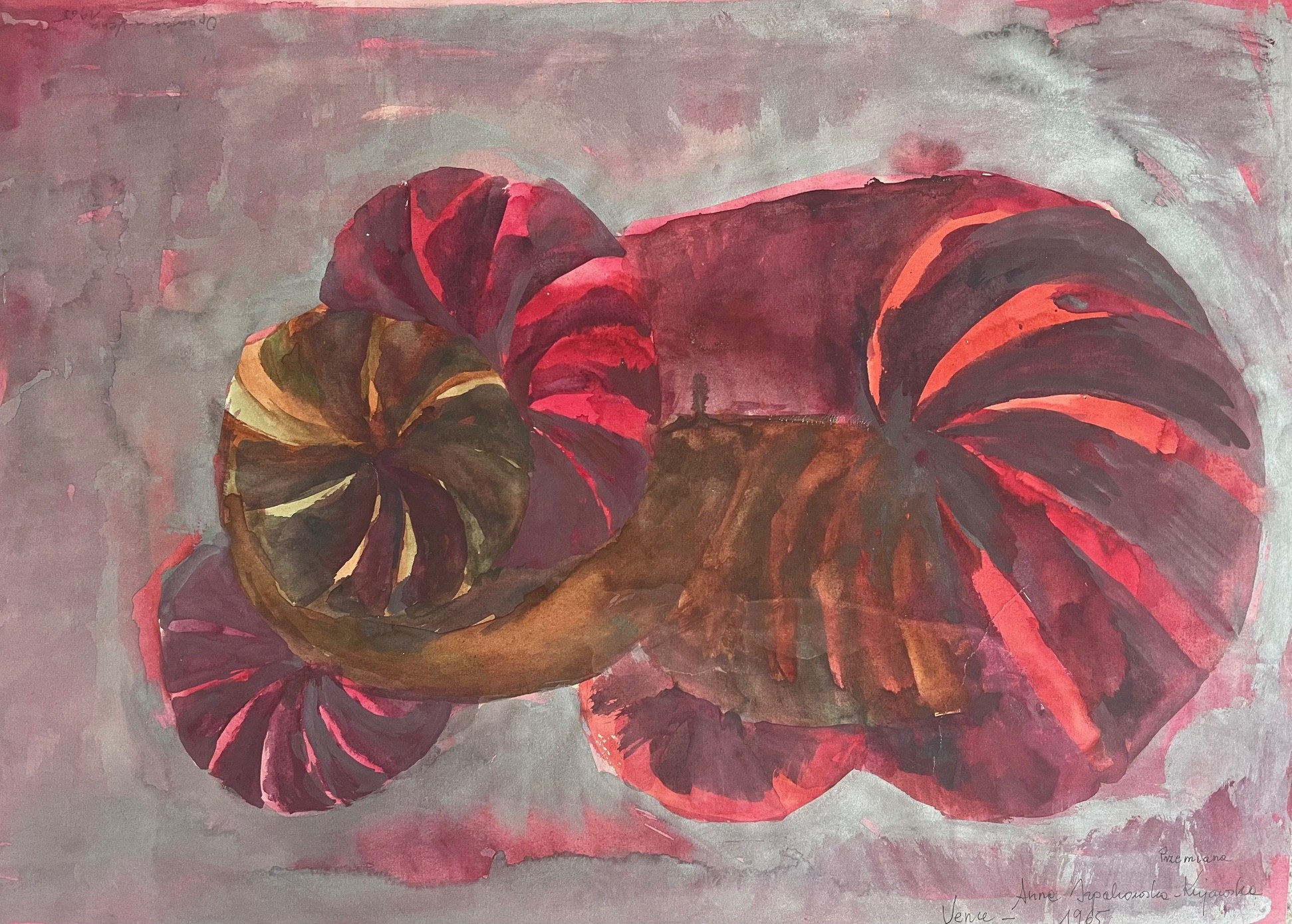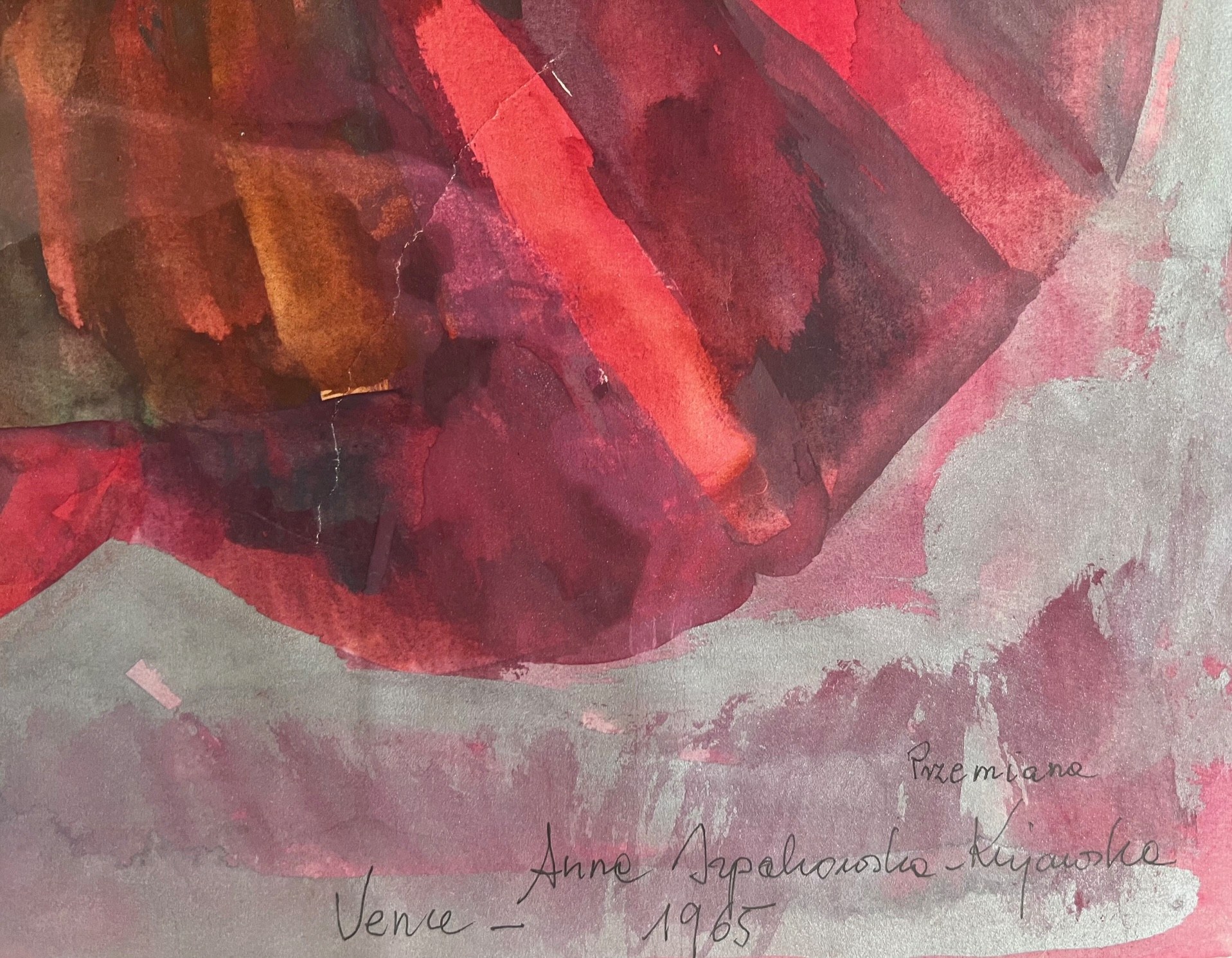 Anna Szpakowska-Kujawska (1931), Przemiana, akryl na papierze ( 54x38 cm ) - dzieło należy do wczesnych prac artystki z lat 60. XX wieku i powstało w Vence we Francji w 1965 roku. W Vence mieszkał przez ostatnie lata swojego życia Witold Gombrowicz ze swoją żoną Ritą Labrosse – Gombrowicz. Artystka zwiedzając miejscowość poznała też pisarza. Forma dzieła – malarstwo na papierze było jakby malarska notatką z wrażeń przyrody i kolorów w tej nadmorskiej i górzystej prowincji Prowansji. Przedstawienie ma cechy impresji,szczególnie na płaszczyźnie delikatnego tła w odcieniach szarości, ale kolory dyń i szerokie gesty malarskie charakterystyczne dla malarstwa wielkoformatowego na płótnie dają wrażenie ekspresji. Intensywne kolory jesieni i szare tło nadają temu malarstwu dekoracyjności i mimo niewielkich rozmiarów przyciągają uwagę widza. Prawy dolny róg sygnatura, tytuł i data powstania szkicu. Praca ma walory kolekcjonerskie i inwestycyjne. Stan bardzo dobry, bez oprawy. Galeria może zrealizować oprawę malarstwa na zlecenie i koszt nabywcy.