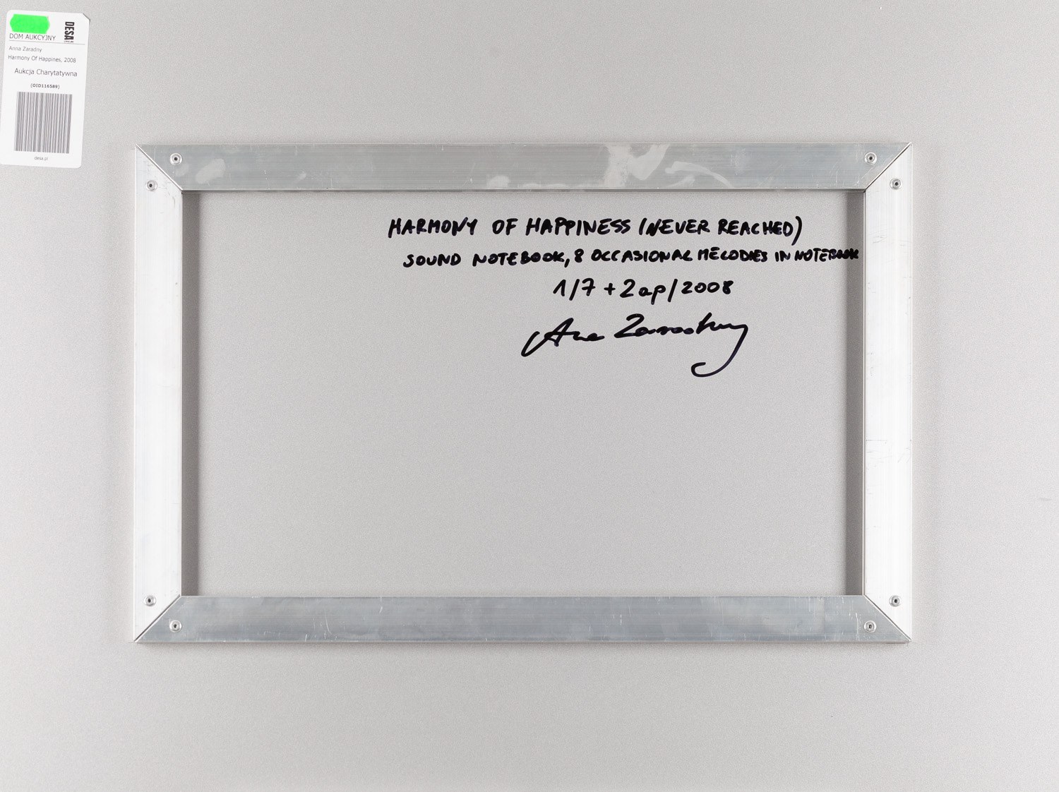 sygnowany, datowany i opisany na odwrociu: 'HARMONY OF HAPPINES (NEVER REACHED) | SOUND NOTEBOOK, 8 OCCASIONAL MELODIES IN NOOTEBOOK | 1/7 + 2 ap/2008 | Anna Zaradny'