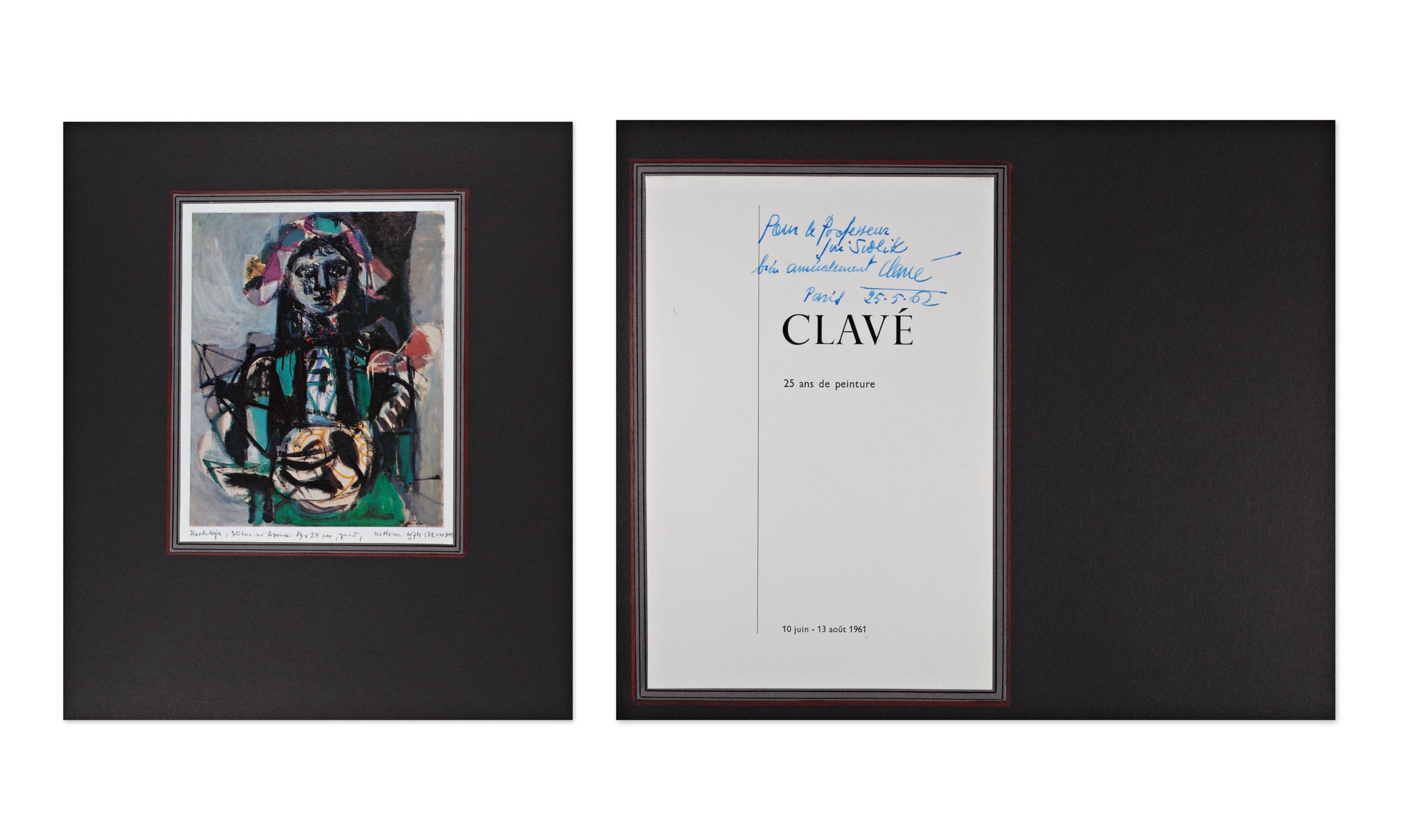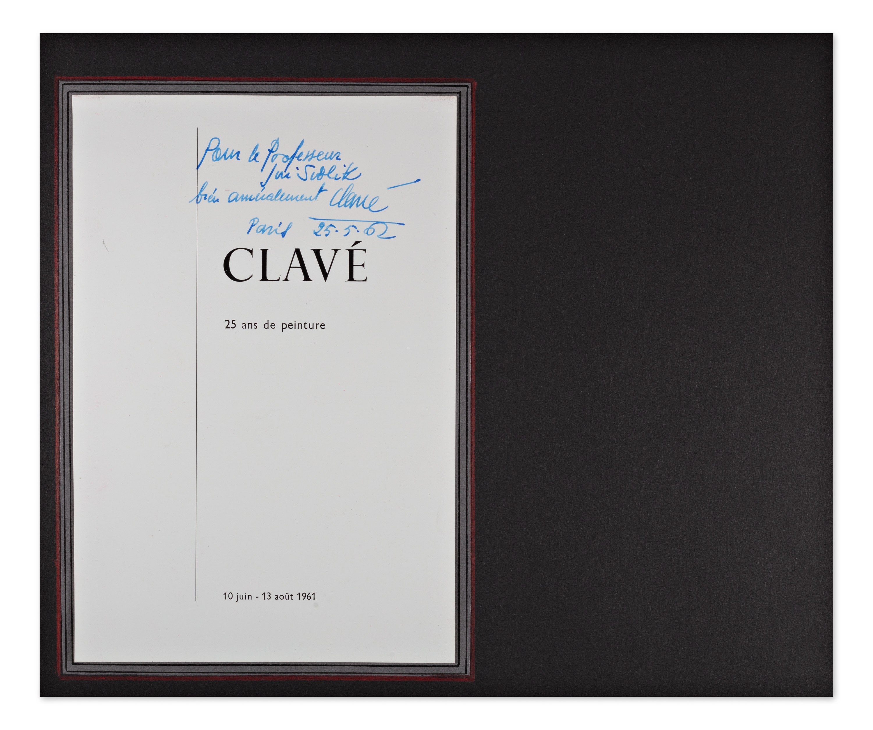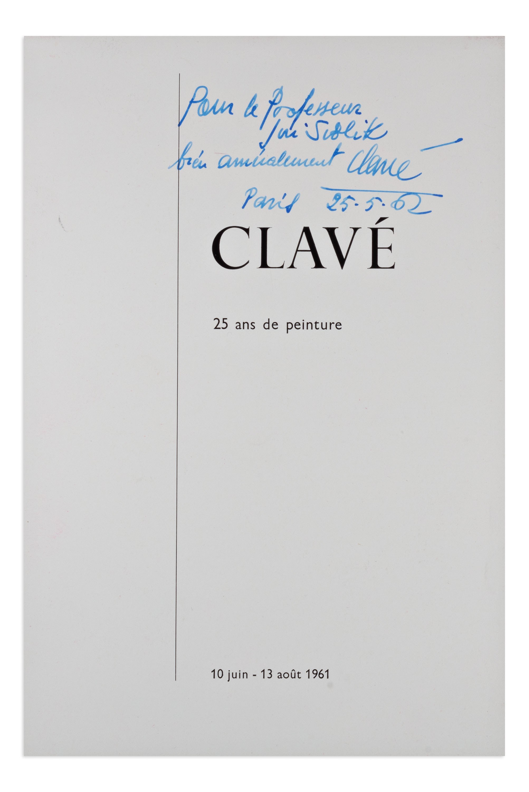Handwritten dedication in the exhibition catalog Clave: 25 ans de peinture, which took place from June 10 to August 13, 1961. The dedication, addressed to Professor Siblík, is dated May 25, 1962, in Paris.Antoni Clavé was a prominent Spanish painter, sculptor, and graphic artist, known for his surrealist and abstract compositions. Throughout his career, he worked with various media, and his works are represented in leading museums and galleries around the world.