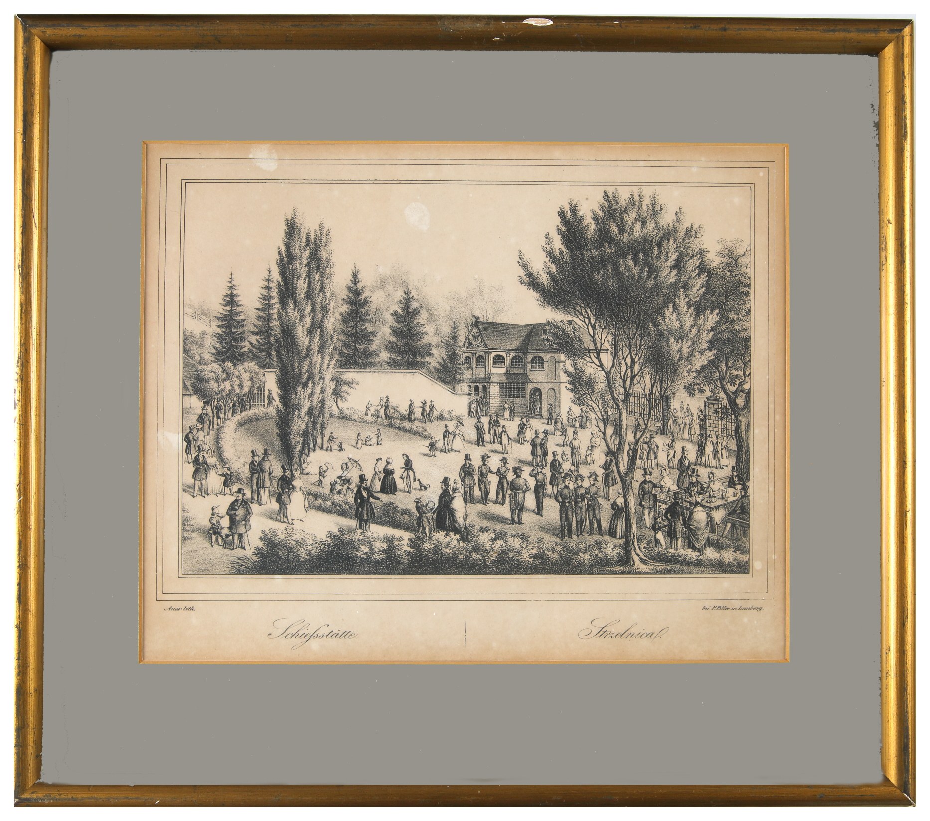 AUER Karol - Strzelnica. Schiessstätte. Lwów. Litografia, papier. Opis. l. d.: "Auer lith." oraz p.d.: "bei P. Piller in Lemberg". Praca oprawna w złotą ramę i pp. Wym. 32 x 36,5 cm. W świetle pp.: 20,5 x 26 cm.