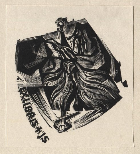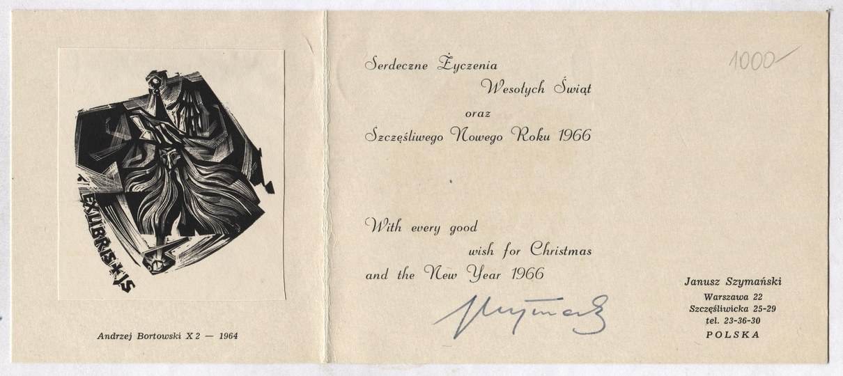 Drzeworyt na ark. 7,8x7 cm. Ekslibris dla Janusza Szymańskiego. Postać fantastyczna. Kompozycja z 1964 sygnowana na klocku znakiem własnym artysty. Ekslibris przytwierdzony do karty z życzeniami świątecznymi i noworocznymi na 1966 r., podpisanej przez właściciela ekslibrisu. Stan dobry.