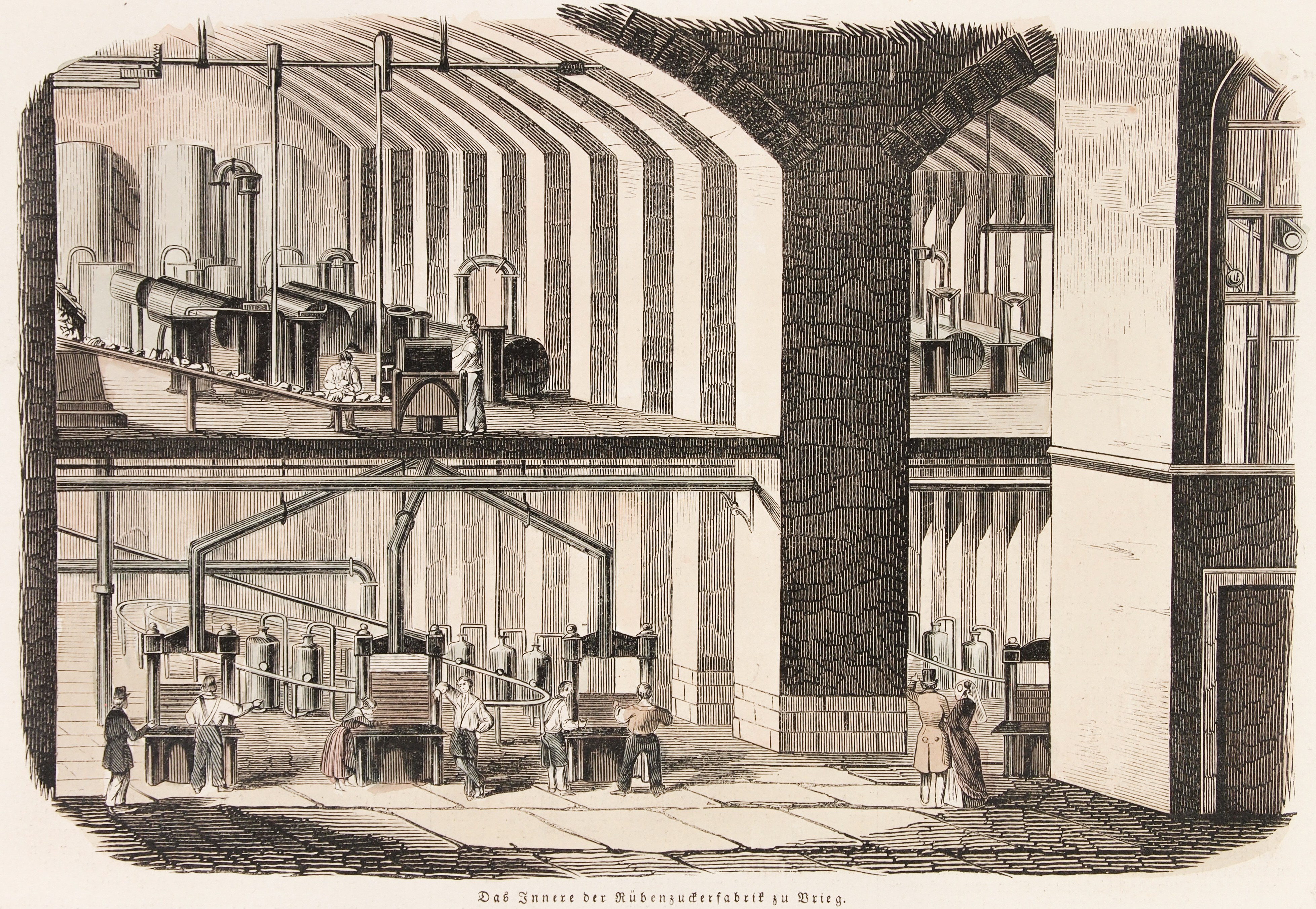 BRZEG. Cukrownia buraczana (prawdopodobnie cukrownia Löbbecka) – wnętrze; anonim, 1846; drzew. szt. kolor., podklejony sztywnym papierem, st. bdb.; wym.: 224x150 mm; Das Innere der Rübenzuckerfabrik zu Brieg;