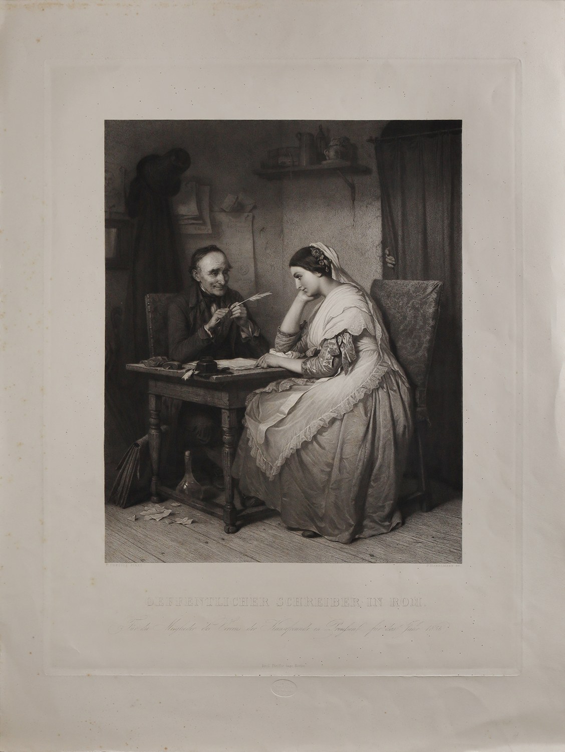 Dużego formatu grafika. Konstanty Cretius artysta urodzony na Śląsku w Brzegu. Grafik Paul Habelmann (1823-1890) to artysta z Berlina. Na portalu brill.com jest artykuł o tej grafice: „Die Hand des heimlichen Beobachters”. Jest to nawiązanie do ręki postaci stojącej za kotarą.