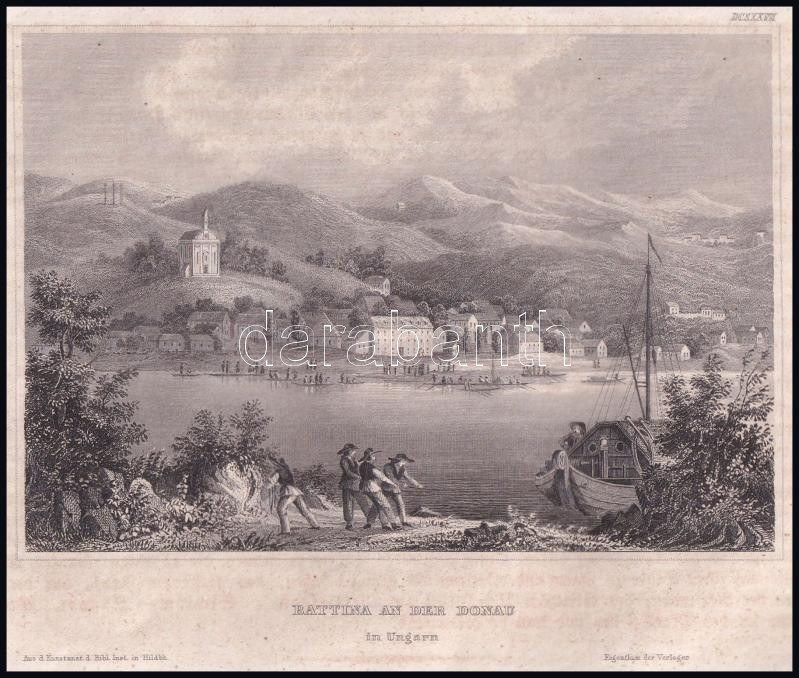 cca 1850 Kiskőszeg látképe, Battina an der Donau, acélmetszet, Hildburghausen, Kunstanstalt des Bibliographisches Instituts, jelzés nélkül, 10x14,5 cm