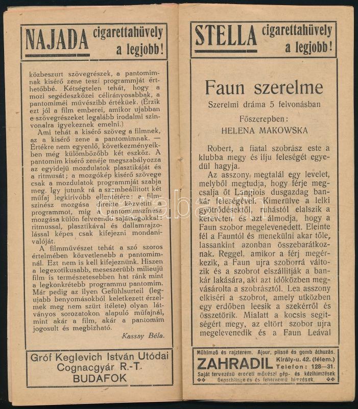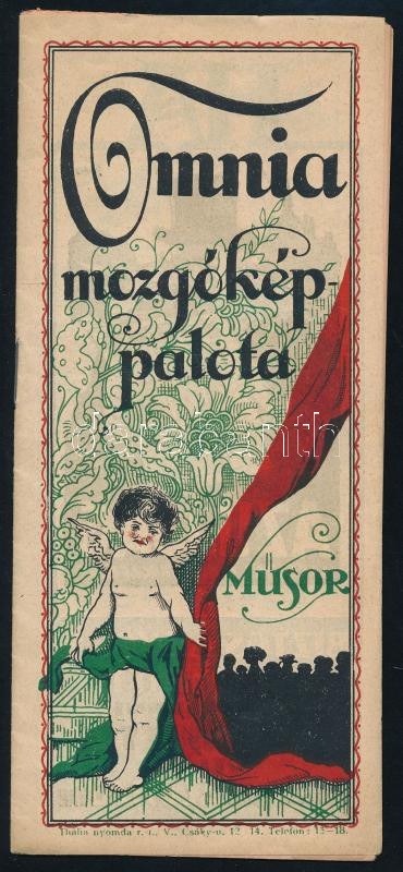 cca 1920 Omnia mozgókép palota műsora, Bp.,Thalia-ny., rengeteg korabeli reklámmal is, színes, litografált, szecessziós borítóval, a hátoldalán bejegyzéssel (1919. okt. 19 és 20.) 10 sztl. lev.
