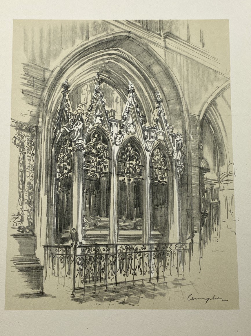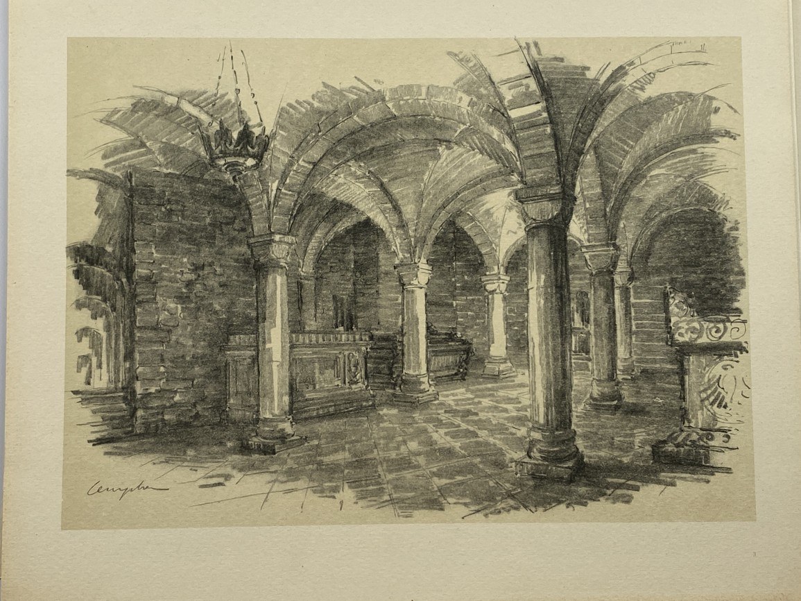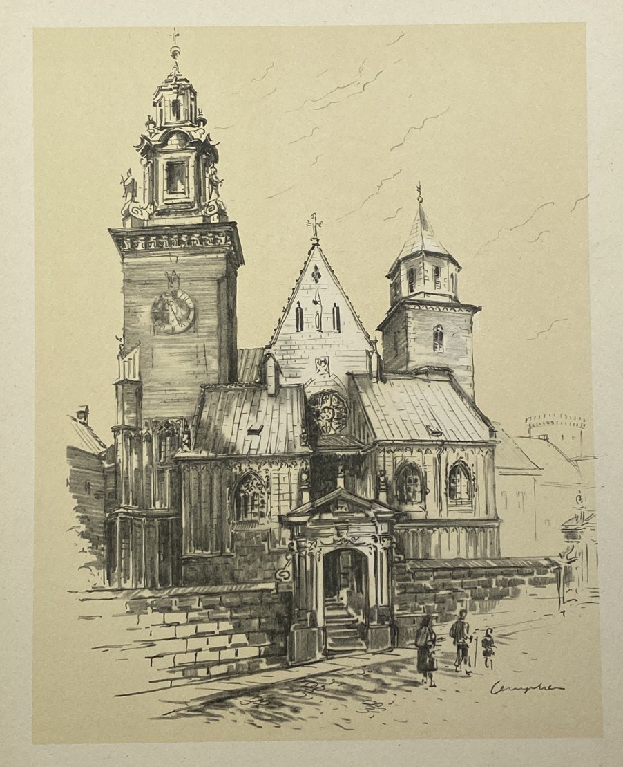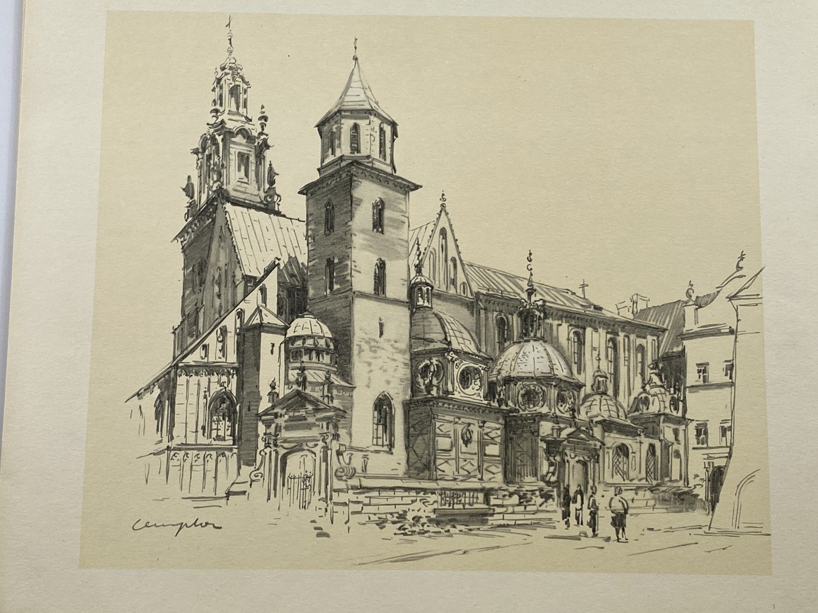 Cempla Józef, Wawel: katedra królewska: 16 plansz / rys. Józef Cempla; wstępem opatrzył Adam Mściwujewski, Spółdzielnia Przemysłu Ludowego i Artystycznego "Starodruk", Kraków 1957, teka (7 s., 16 k. tabl.), wymiary 30,5 x 38,5 cm. Wstęp na kartach lakierowanych, zabrudzenia kart (drobne plamki). 16 sygnowanych plansz (czyste). Teka płócienna, oryginalna. Niewielkie otarcia.