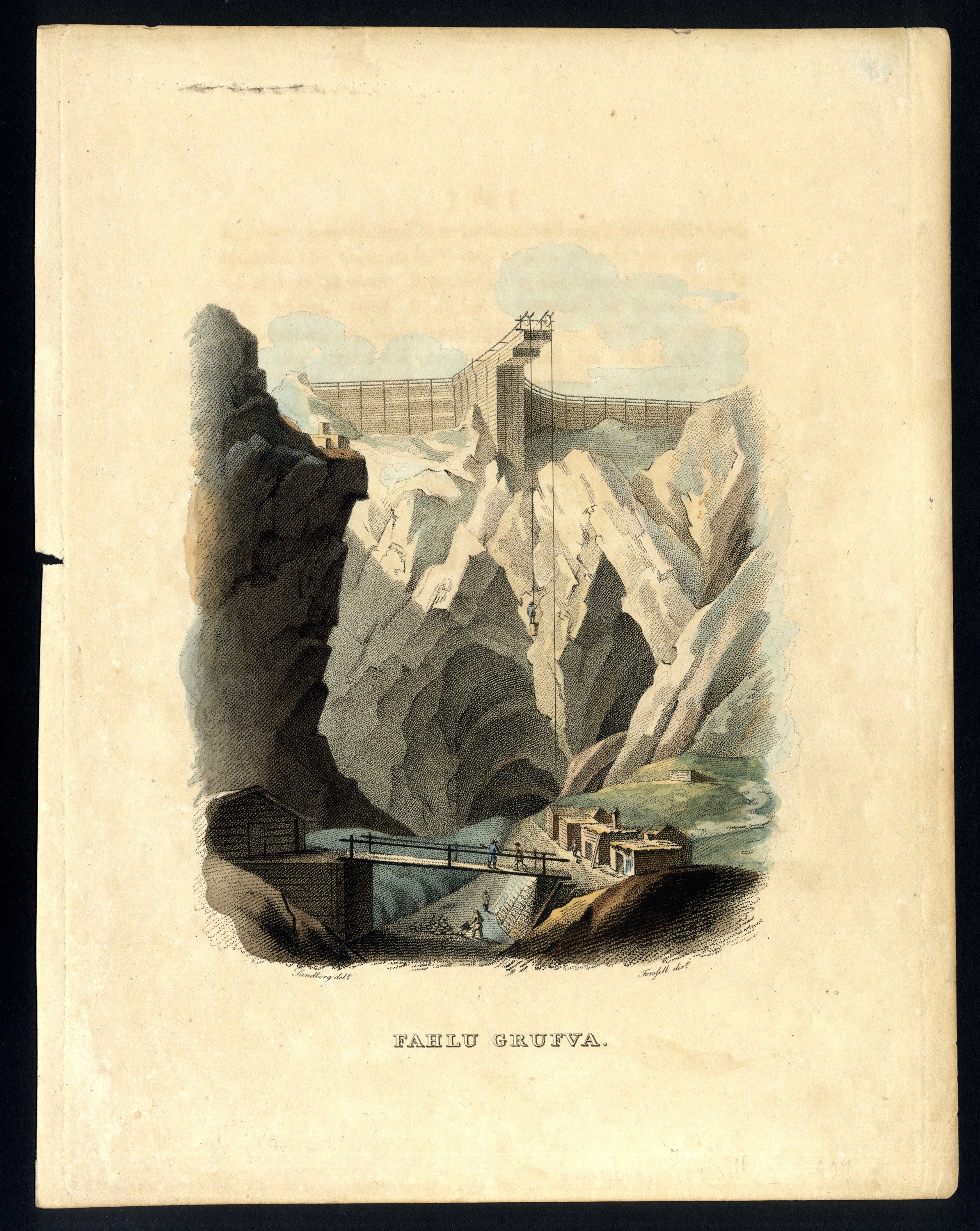 lithograph, 20.5x26.3 cm. Detail view of the Falun Quarry, in central Sweden, taken from the work of Christian Forssell "A year in Sweden: images of the clothes, lifestyle and domestic habits of the Swedish people, as well as the most significant places in the history of country" by J. G. Sandberg and published by Forssell, Stockholm 1864.