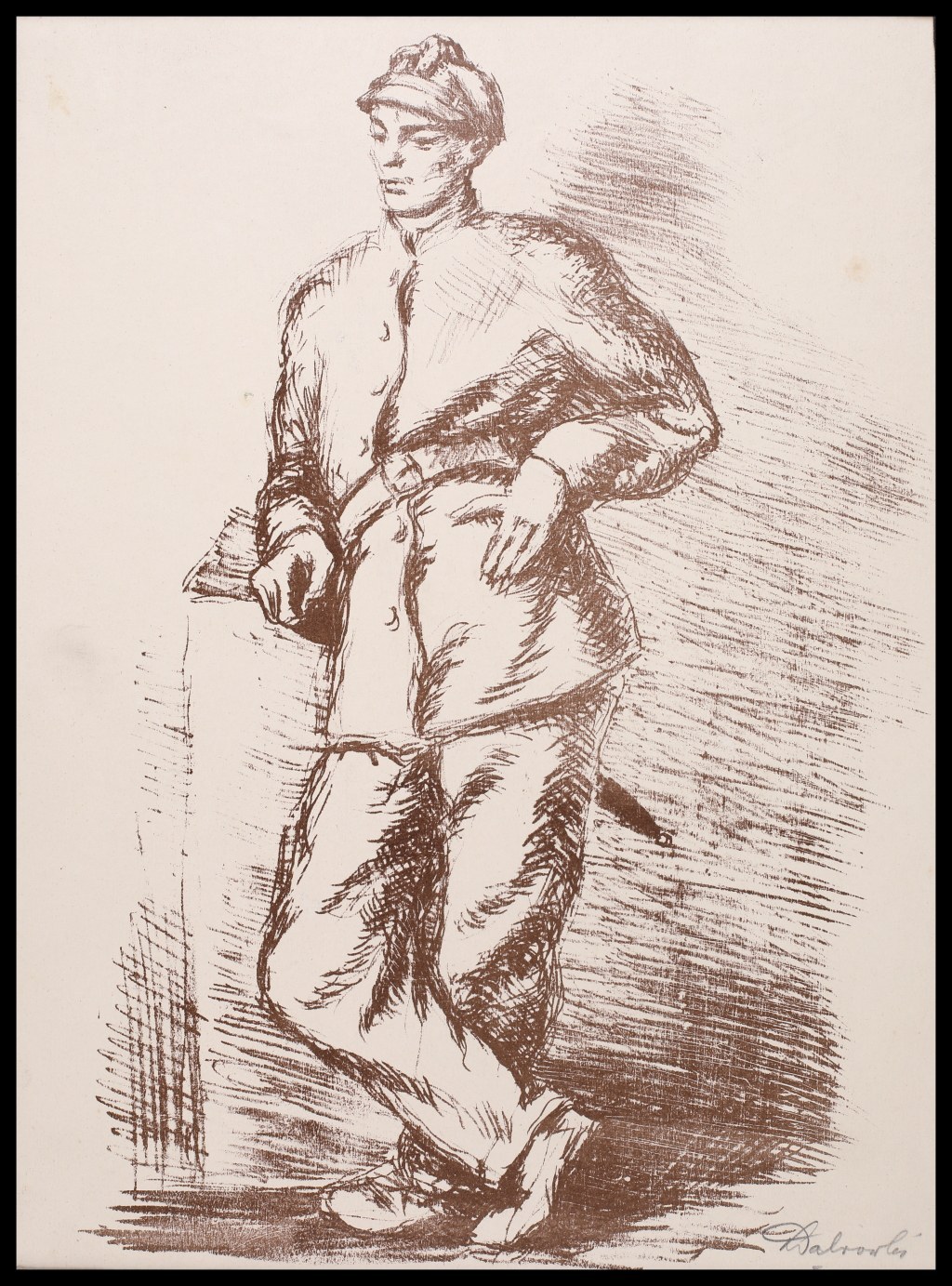 Grafika z „Teka autolitografij artystów legionistów” wydanej w dwudziestolecie zbrojnego czynu legionistów w roku 1934. Praca naklejona na kartonowy podkład, wprawiona w płócienne pp.