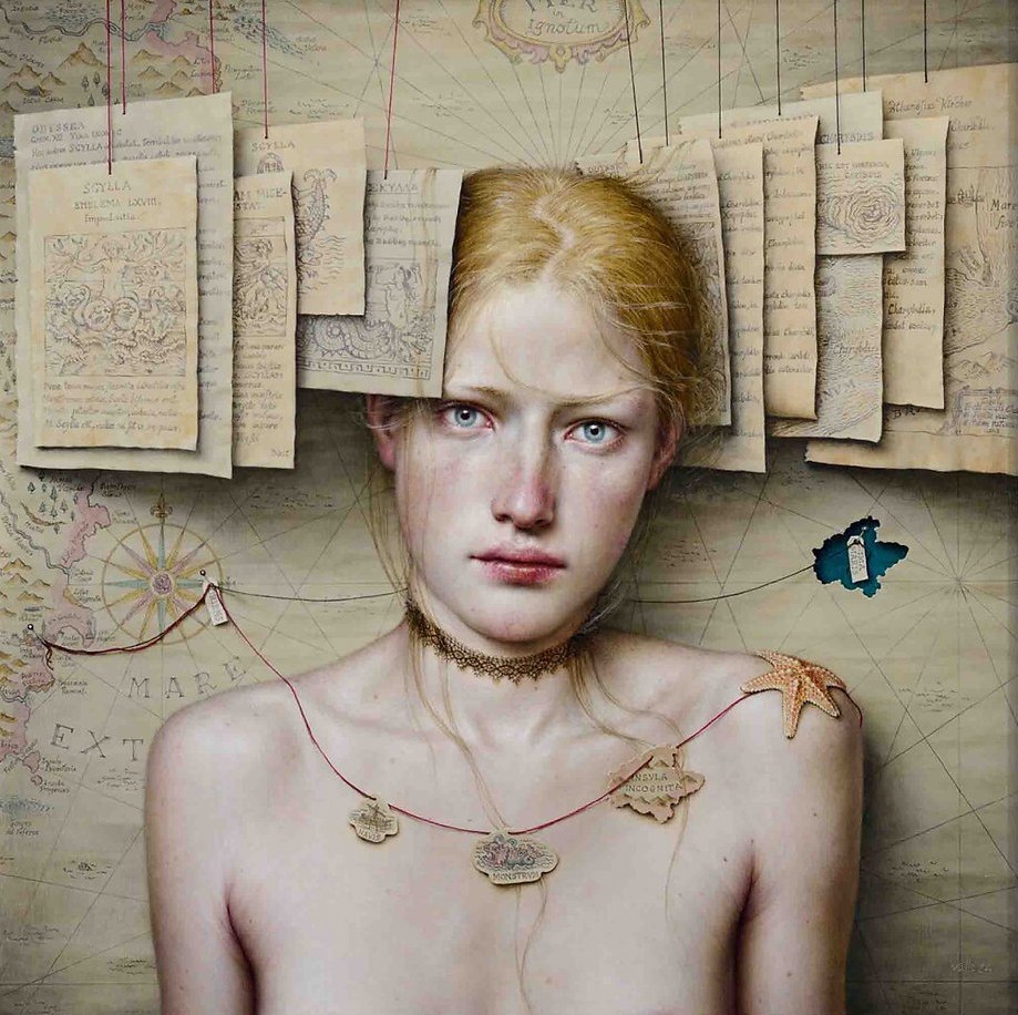 Postać stoi na tle dawnej mapy portolanowej z inskrypcją ITER in Ignotum – „podróż w nieznane”. Po obu stronach głowy zawieszone są karty ze starych ksiąg, odnoszące się do mitologicznych potworów Scylli i Charybdy. Motyw ten, obecny w Odysei Homera, symbolizuje wybór między dwoma niebezpieczeństwami.