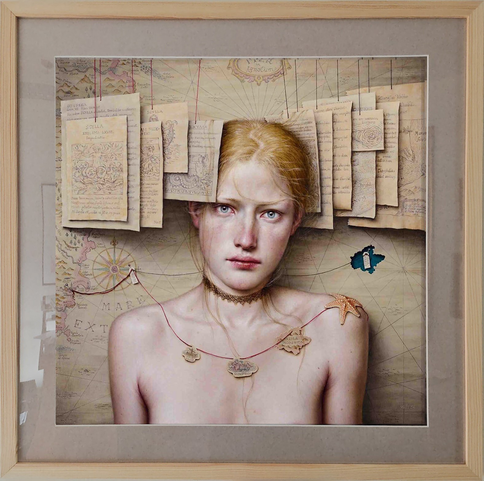 Czerwone i czarne nici łączą mapę z ciałem bohaterki, wskazując na psychologiczną podróż i napięcie między skrajnościami. Gwiazda morska i zawieszone tabliczki podkreślają motyw wędrówki oraz balansowania między zagrożeniem a szansą ocalenia.