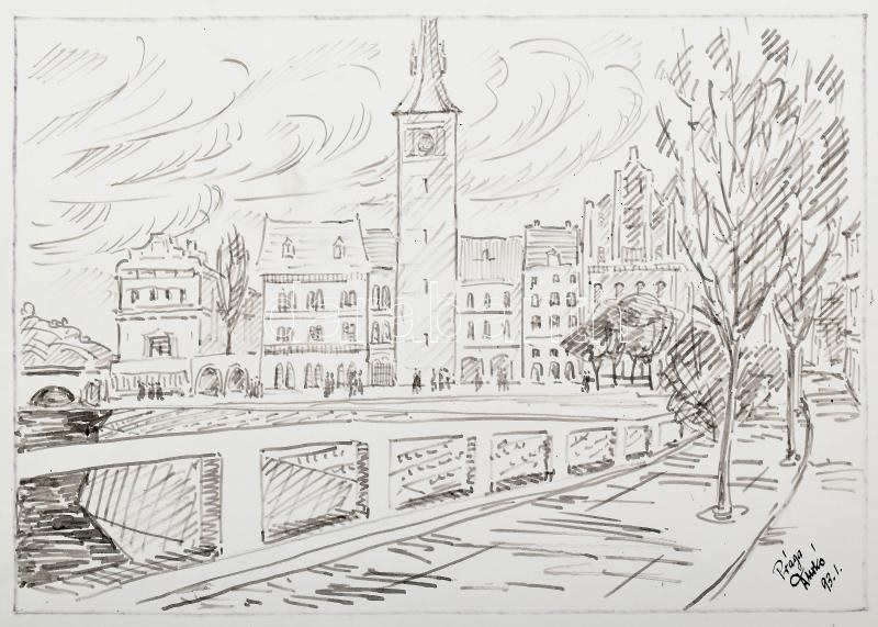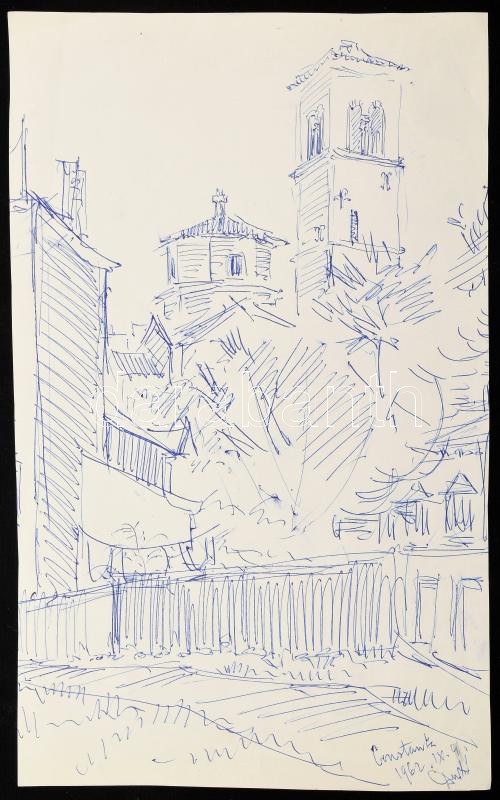 Durkó Gábor (1916-2003), 2 db mű: Városképek (Prága és Constanta). Filctoll, golyóstoll, papír. Jelzett. 29x17...