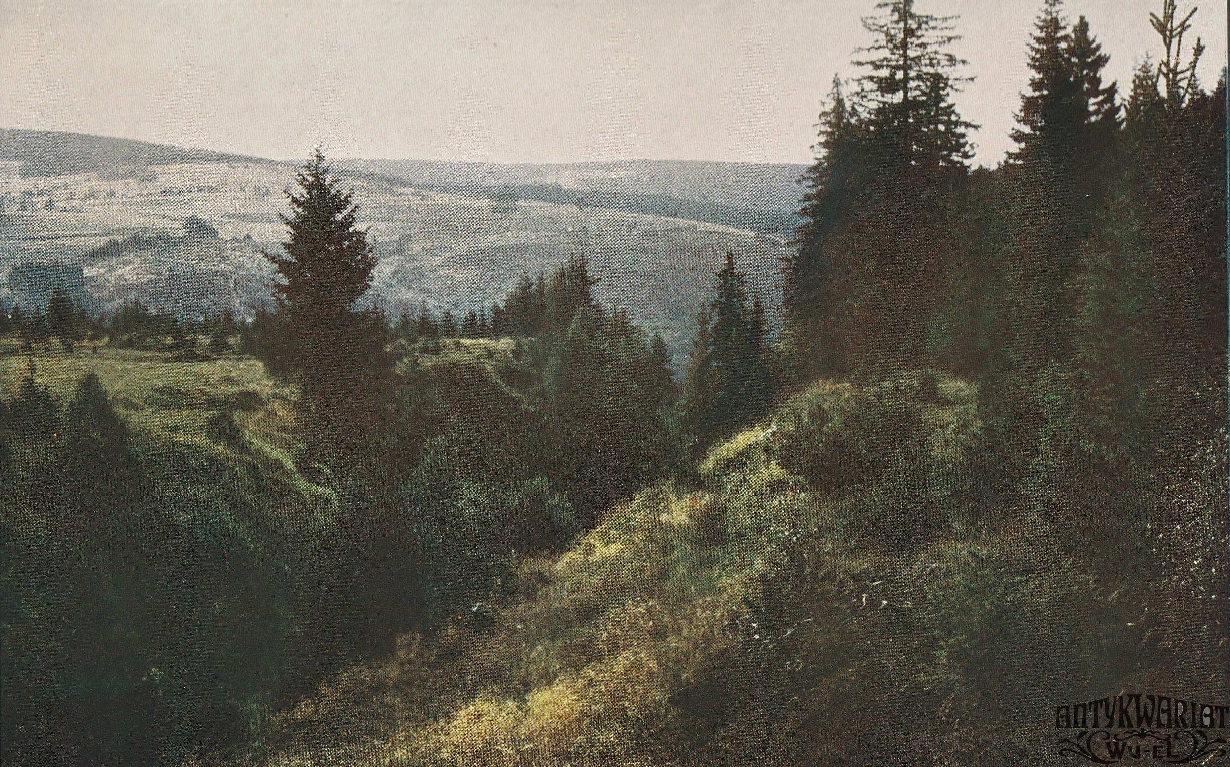 DUSZNIKI-ZDRÓJ. Rezerwat przyrody w pobliżu Dusznik-Zdroju. Wg fot. Juliusa Hollosa, na ozdobnym kartonie, kolor., st. bdb., pergaminowa bibułka ochronna, tabl. 40 z teki Schlesien II…; Aus dem Naturschutzgebiet bei Bad Reinerz.