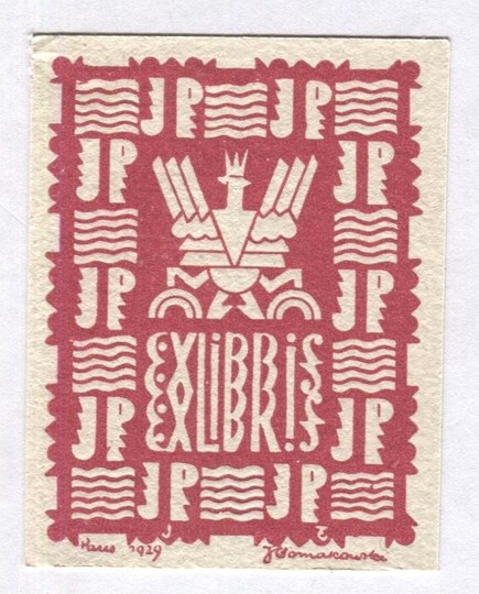 Odbitka cynkograficzna na ark. 6,3x4,9 cm. Farba czerwona, papier żeberkowy. Stylizowany Orzeł w koronie, wzdłuż krawędzi wielokrotnie powtórzony monogram JP naprzemiennie z falistymi liniami. Kompozycja Janusza Tłomakowskiego, sygnowana na płycie "J. Tłomakowski" i "Paryż 1929). Nieznaczne załamanie górnego narożnika, stan dobry.