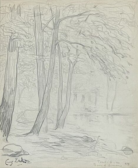 Kameralny rysunek pejzażowy wykonany podczas pobytu artysty w Bretanii. Motyw Bois d’Amour w Pont-Aven – legendarnego zagajnika malarzy od czasów Gauguina – ujęty został miękką, linearną kreską: smukłe pnie drzew i zwiewne korony zarysowane są subtelnym konturem, który łączy szkicową obserwację natury z wyczuciem dekoracyjnego rytmu. Wczesna, datowana na 1904 rok praca dokumentuje moment kształtowania się stylu Zaka – zamiłowania do syntetycznej formy, lekko stylizowanej linii i lirycznego nastroju.