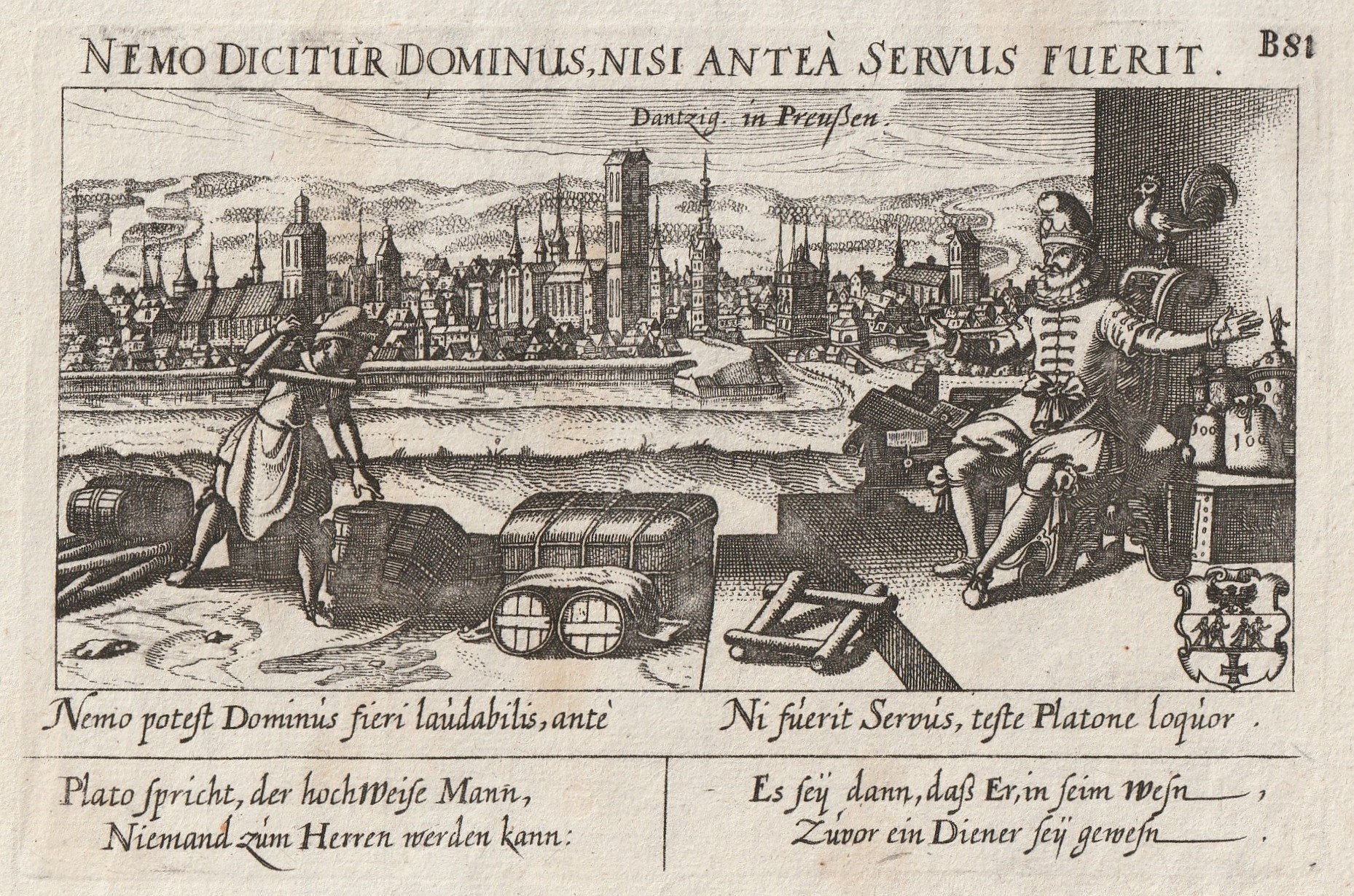 GDAŃSK. Panorama miasta od północnego zachodu; na pierwszym planie sztafaż figuralny; pochodzi z: D. Meissner, Thesaurus Philopoliticus, wyd. P. Fürst, 1638; przedstawienie emblematyczne, sentencje łac. i niem.; miedz. cz.-b., st. bdb., passe-partout; wym. płyty 152x100 mm; Dantzig in Preußen; [Dantiscum G95/3]. BARDZO RZADKIE!
