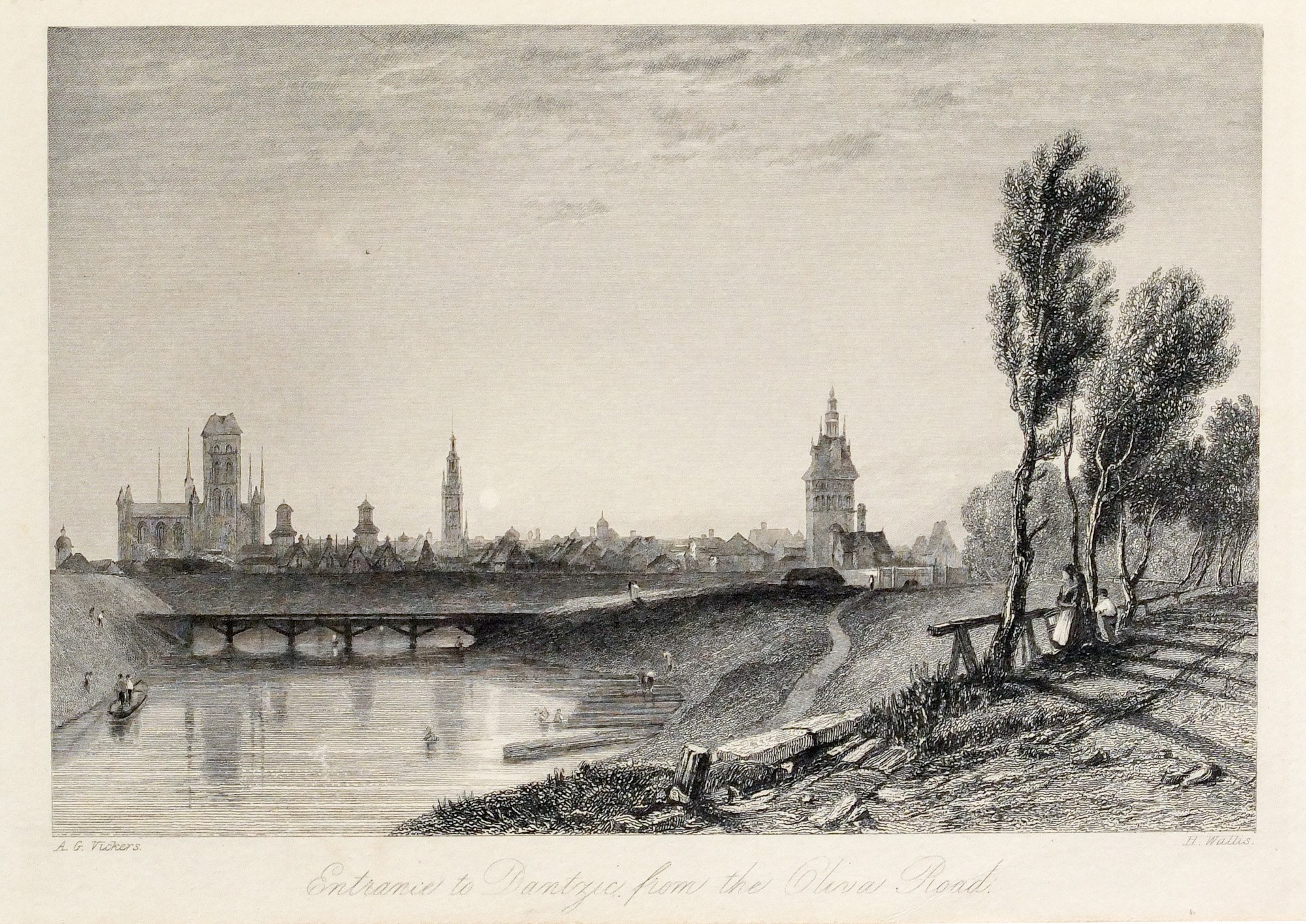 GDAŃSK. Widok miasta od północnego-zachodu, ryt. H. Wallis, rys. Alfred Vickers, 1837; stal. cz.-b., st. bdb., passe-partout; wymiary widoku: 154x103 mm; Entrance to Dantzic from the Oliva Road.