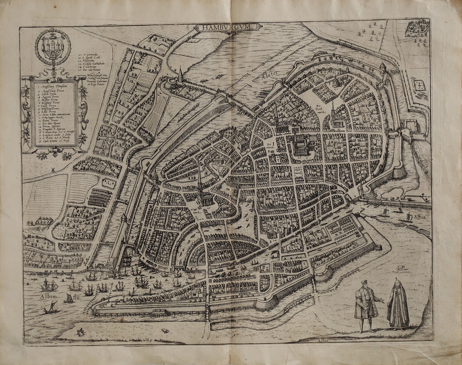 Jeden z najstarszych widoków Hamburga, miasta należącego do kupieckiego stowarzyszenia Hanza razem z Gdańskiem i Toruniem. Autorzy tego sztychu to graficy i geografowie czasów renesansu, którzy stworzyli najstarsze znane widoki wielu miast. Ten miedzioryt pochodzi z dzieła „Civitatis Urbis Terrarum” wydanego w Kolonii w 1588 r. Na odwrocie tekst łaciński opisujący dzieje miasta.