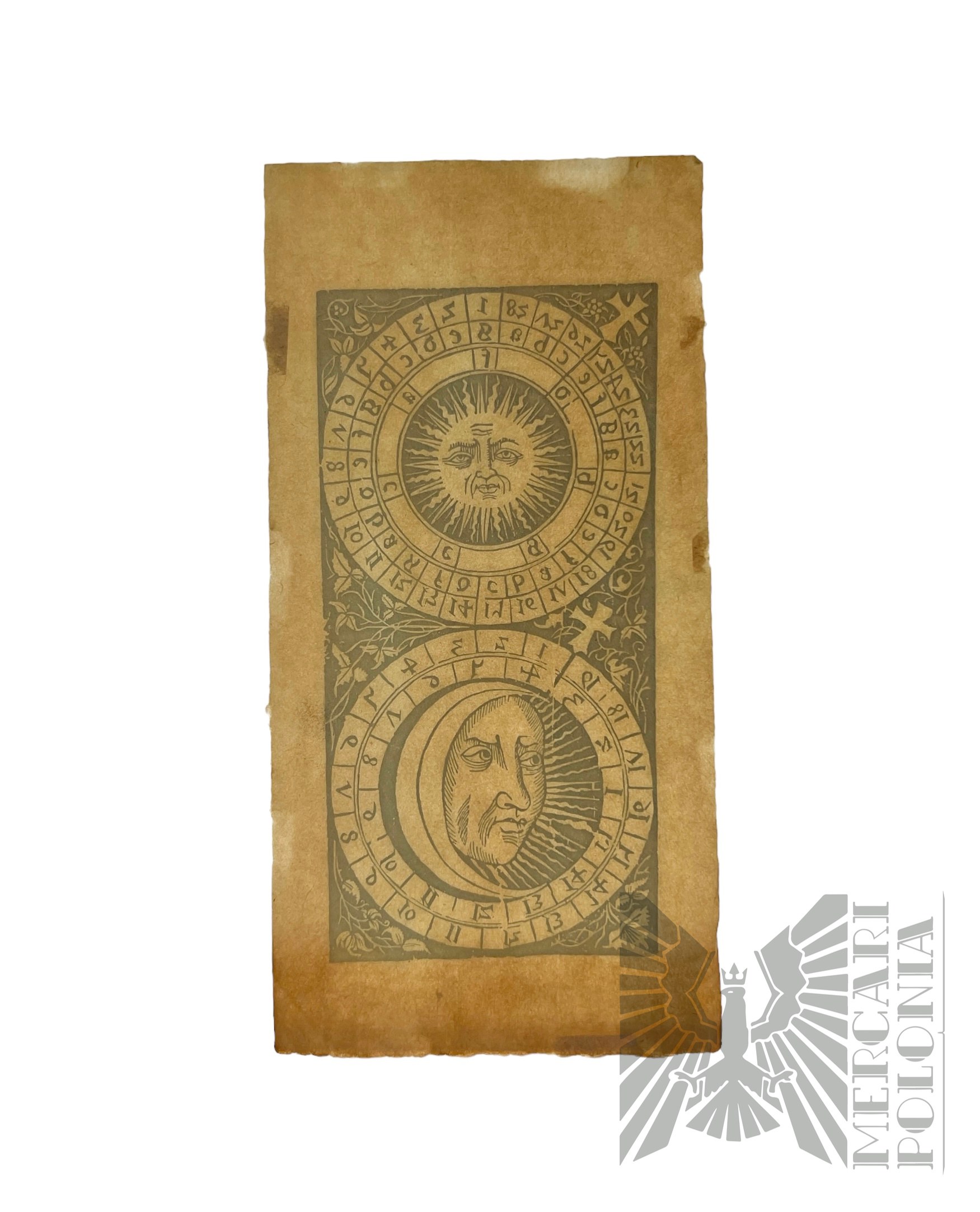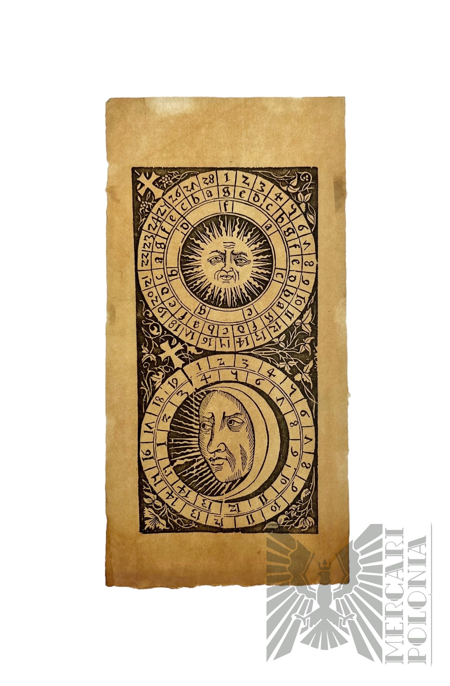 Grafika z astronomicznymi motywami przedstawiająca księżyc i słońce. Wzór najprawdopodobniej inspirowany jest renesansowymi "kalendarzami" słonecznymi i księżycowymi na podstawie których określano dni tygodnia.