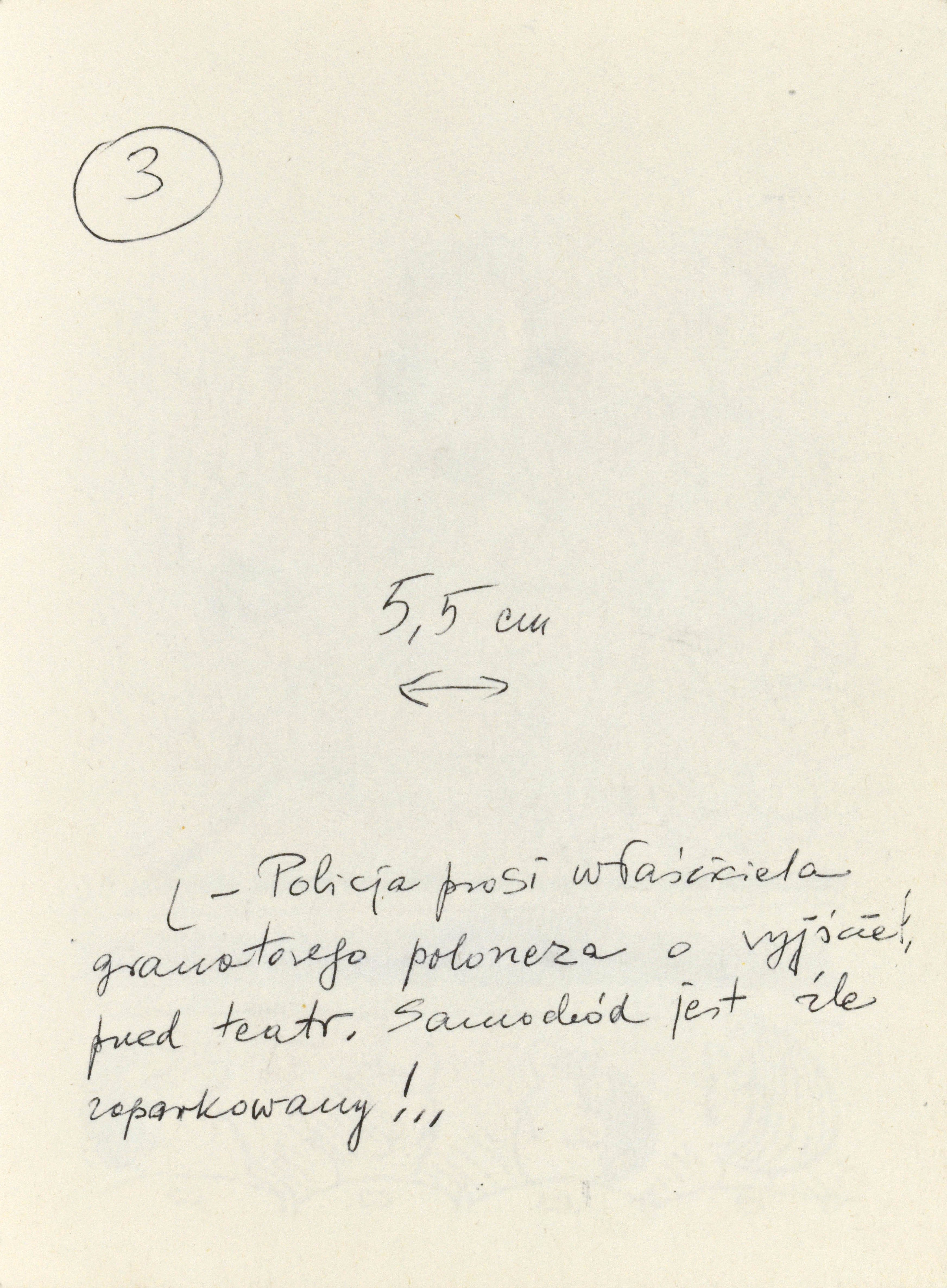 Opisany autorsko na odwrocie: L - Policja prosi właściciela granatowego poloneza o wyjście przed teatr. Samochód jest źle zaparkowany!..