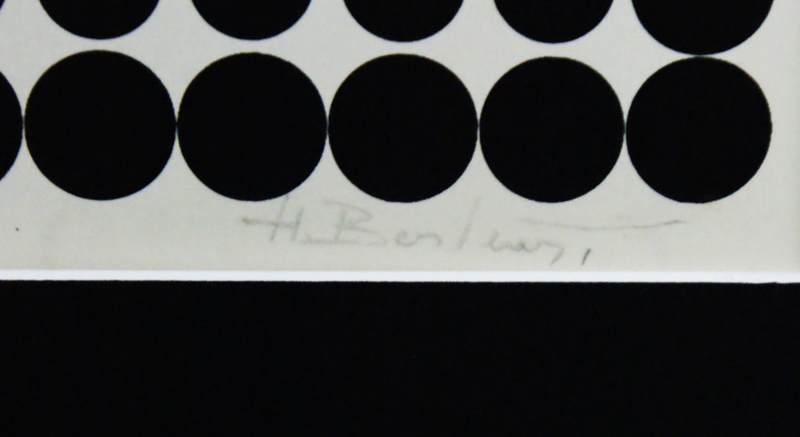 „Mechanofaktura” edycja 1 z 1963, sitodruk na papierze o wysokiej gramaturze, syn: w p.d: „H.Berlewi”(ołówek), 22 x 22 cm.w św.p-p.Praca oprawiona.Sitodruki opracowane  przez Eriką Olsena pod okiem artysty, tylko kilka egzemplarzy zostało sygnowanych wyłącznie dla współpracowników i właścicieli prasy.