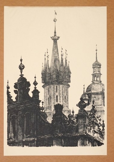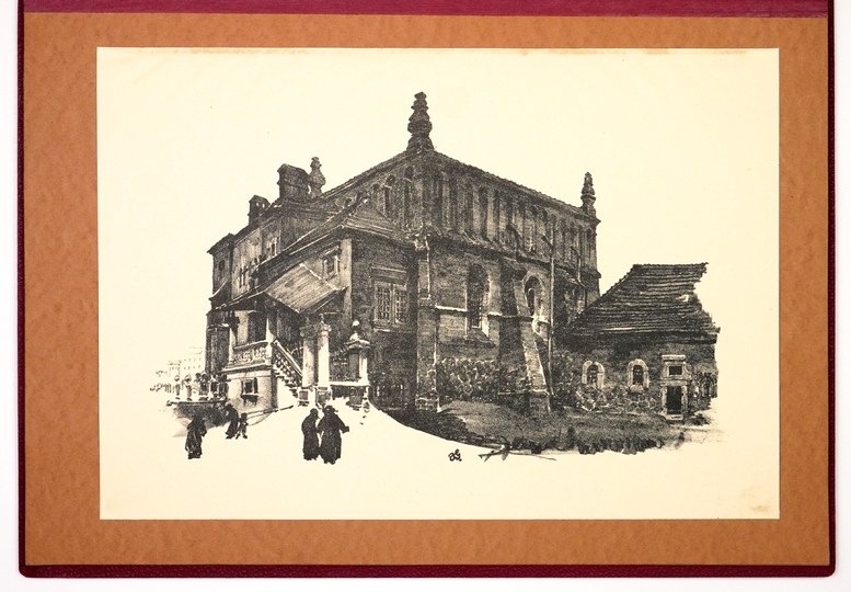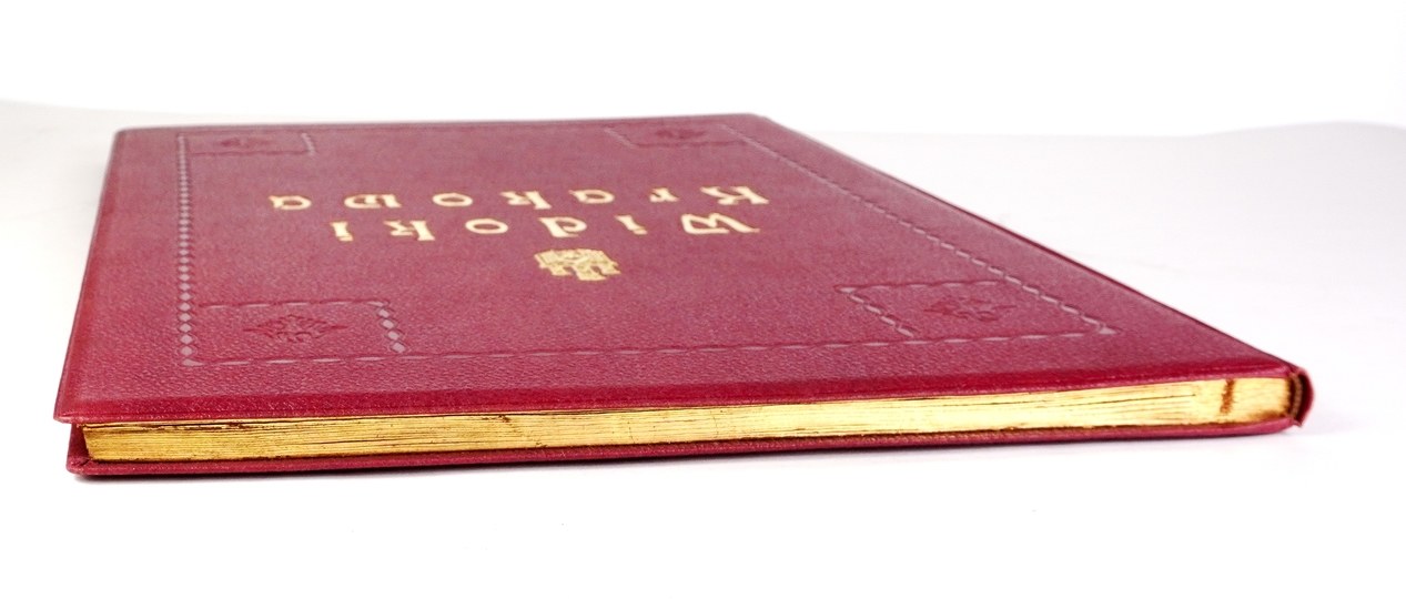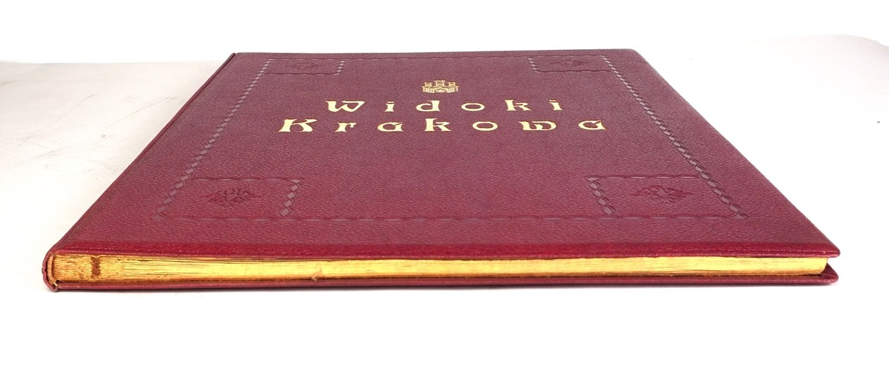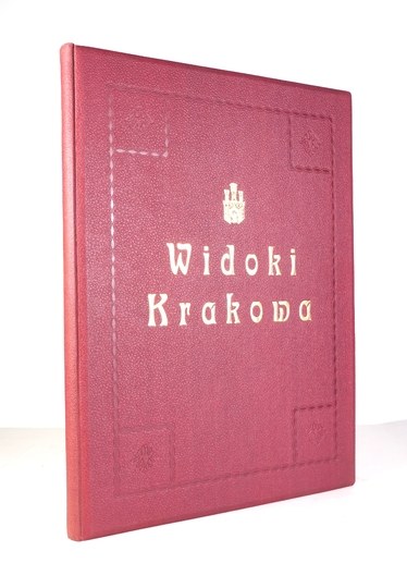 Grońska 227. Stan bardzo dobry. Egzemplarz "Widoków Krakowa" oprawiony w formie kodeksu. Na przedniej okł. złoc. tytuł, herb miasta i ślepo tłocz. bordiura z orłami w narożnikach. Wewnątrz na 13 kartach ze sztywnego papieru zamontowano przednią okładkę oryginalnej teki i 12 litografii. Ryciny przyklejone górną krawędzią do podkładów. Teka zaw. w kolejności: Barbakan, Brama Floriańska i baszta pasamoników, Baszta stolarska, Ulica Floriańska, Szczyty Sukiennic, Wnętrze Kościoła Mariackiego, Biblioteka Jagiellońska, Katedra na Wawelu, Dziedziniec zamku królewskiego na Wawelu, Fragment krużganku zamku król., Stara synagoga na Kazimierzu, Widok ogólny Krakowa od południa. Grafiki sygnowane na kamieniu. Na tylnej okł. bordiura jak na przedniej.